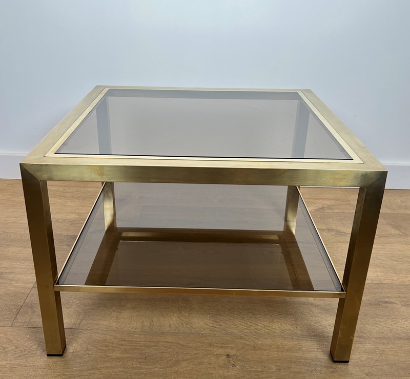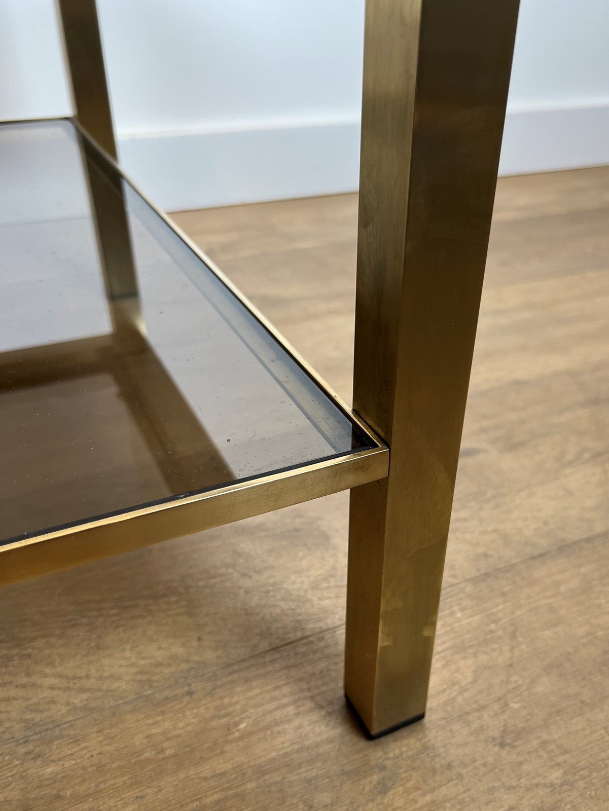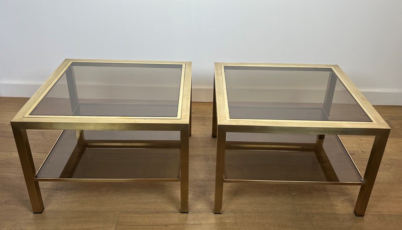 Pair Of Large Brass Side Tables With Smoked Glass. French Work.