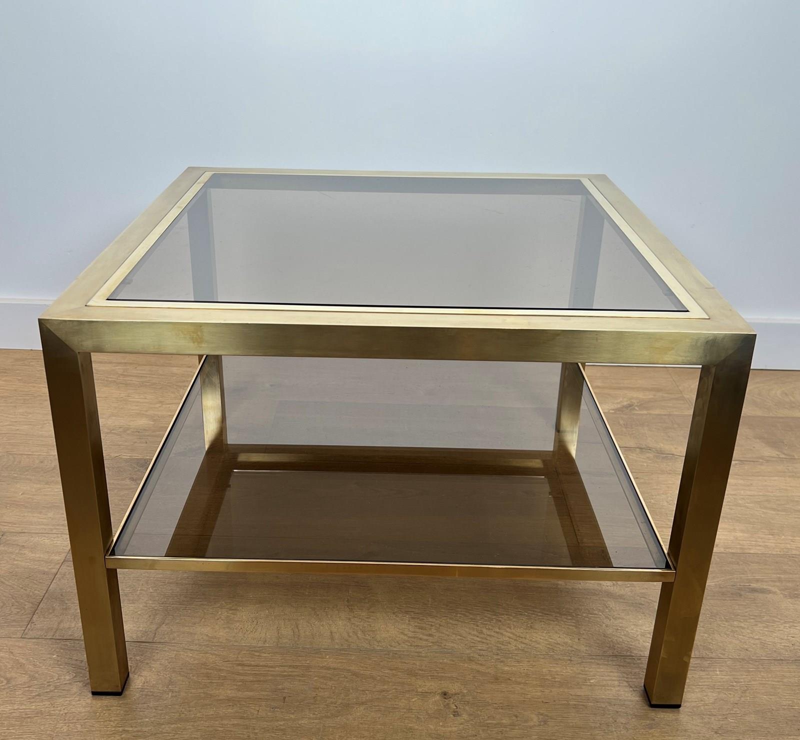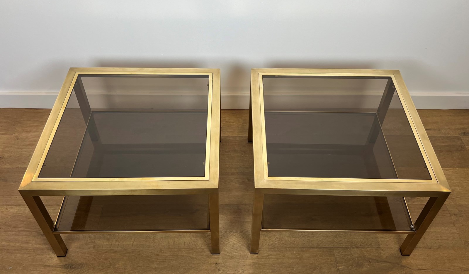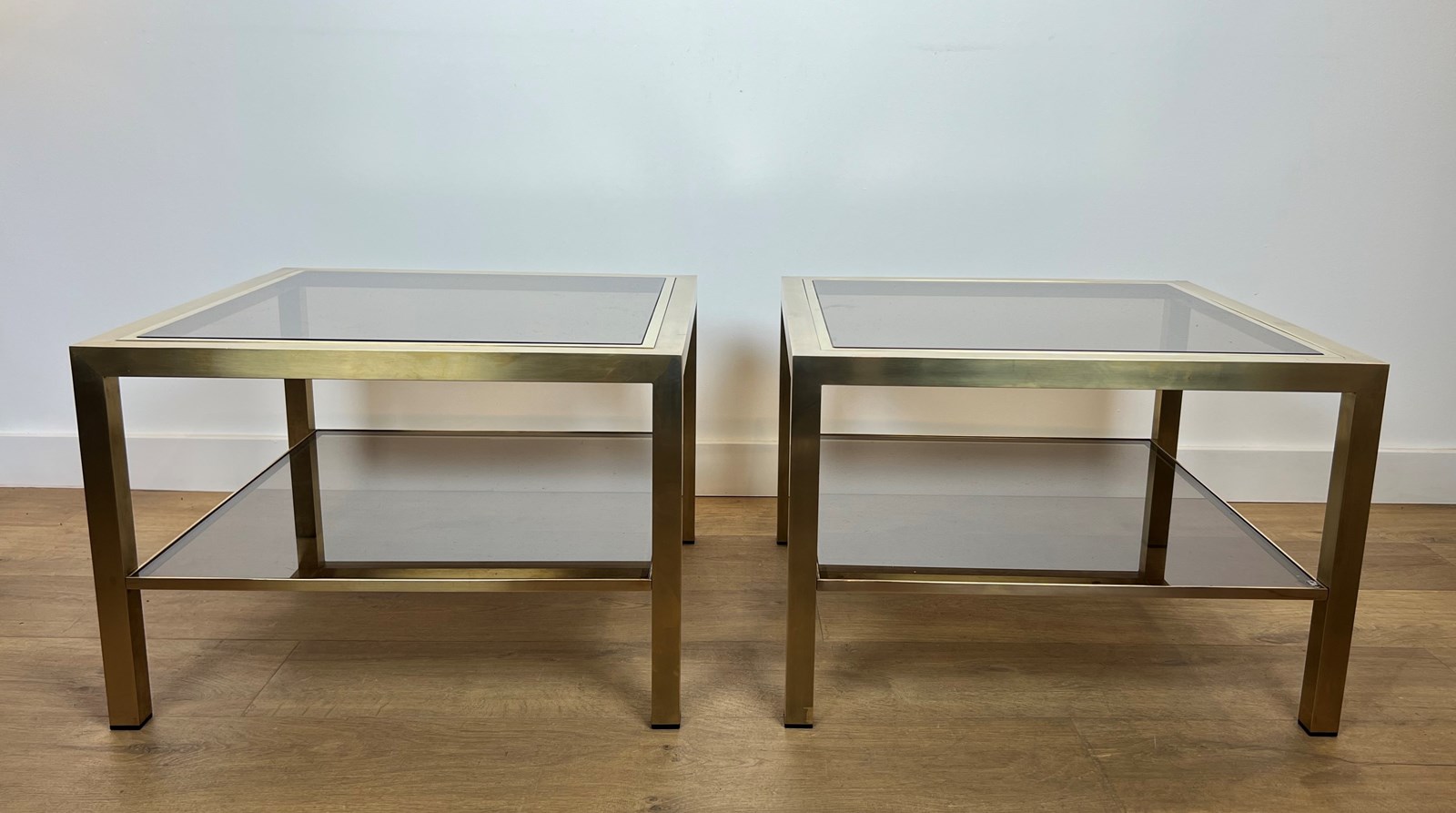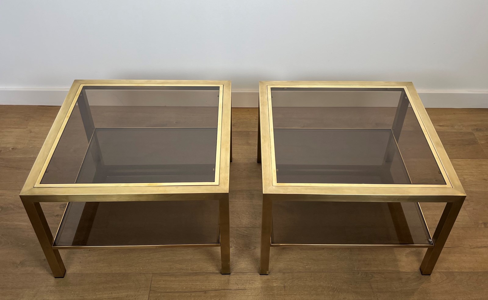Pair of large brass side tables with smoked glass. French work. Circa 1970