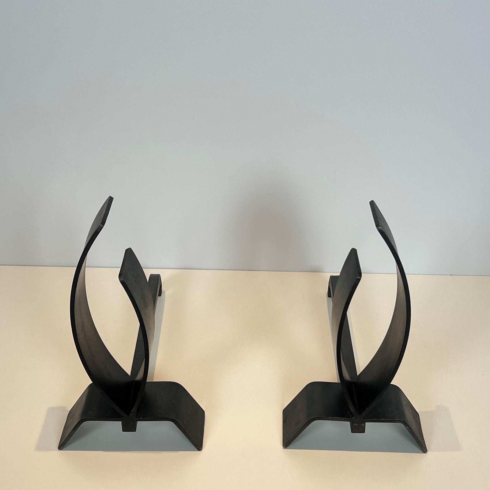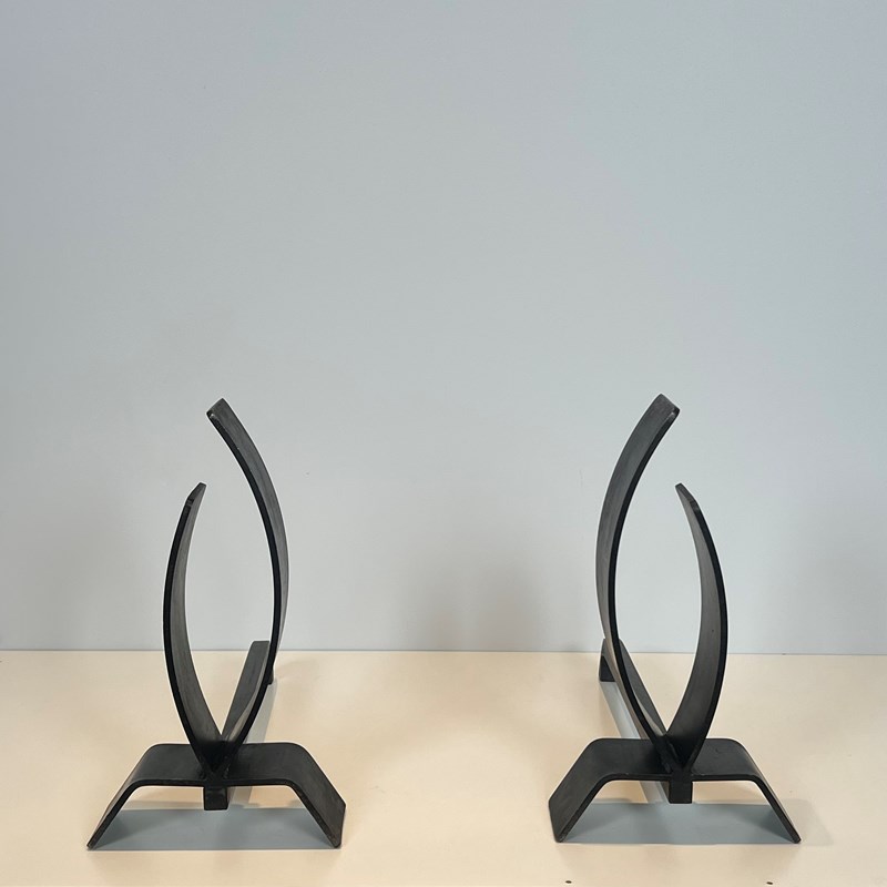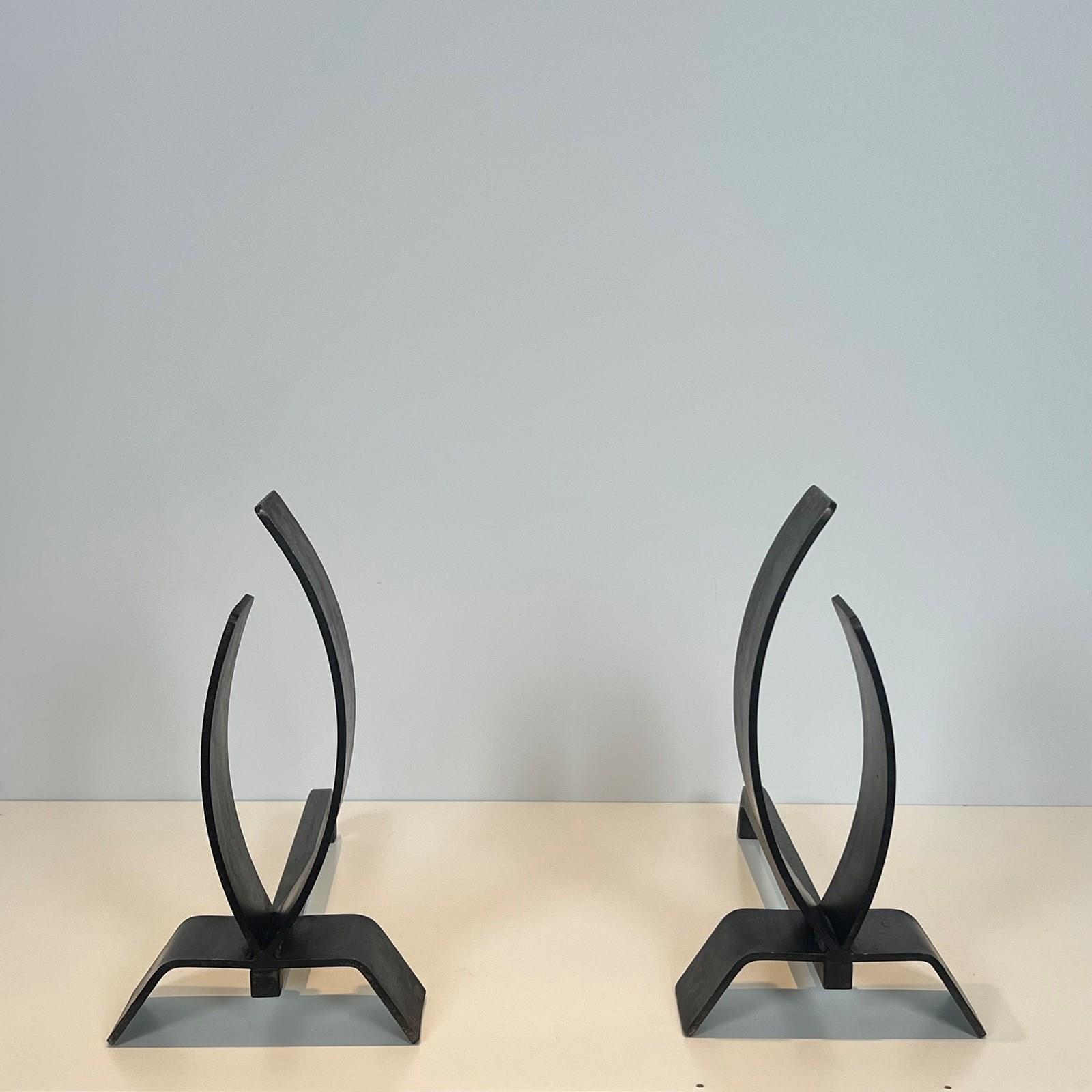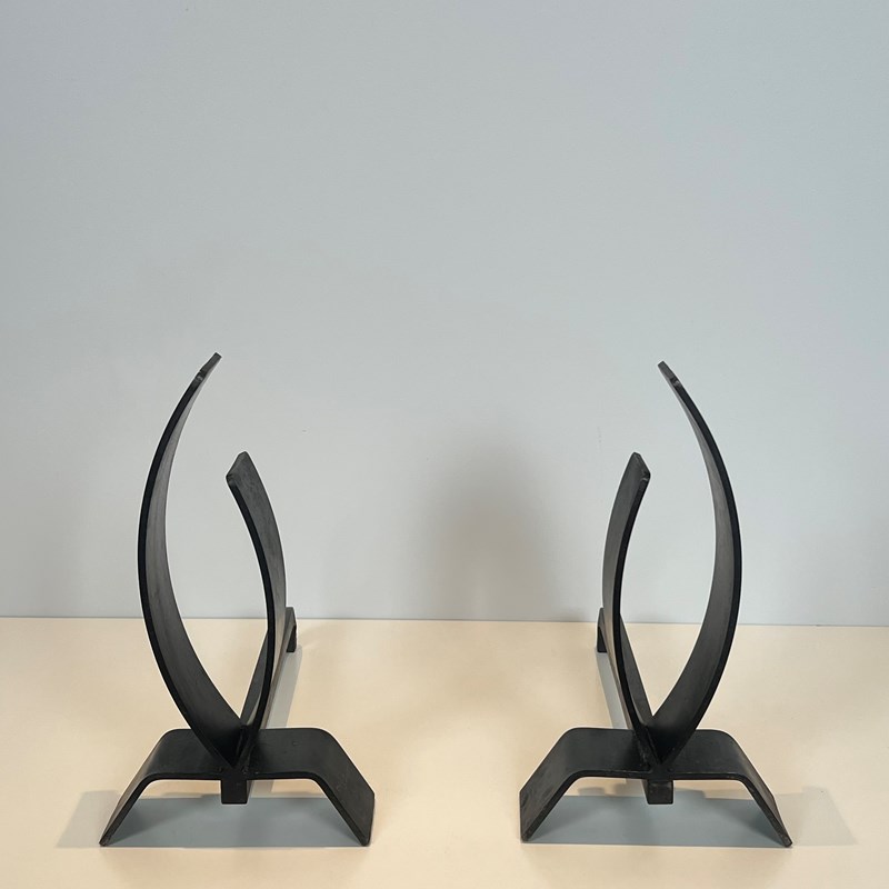Pair of Modernist Steel and Iron Andirons. French. Circa 1970