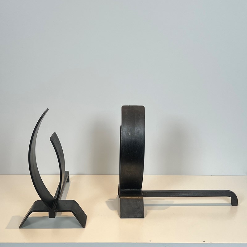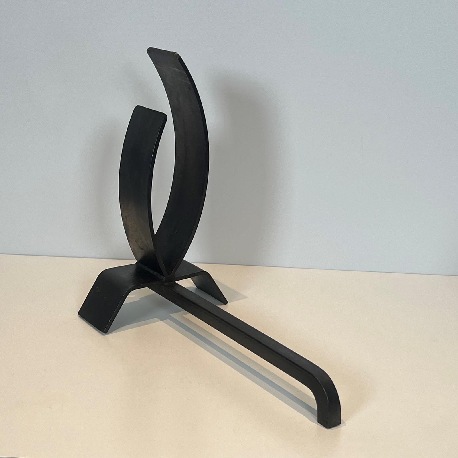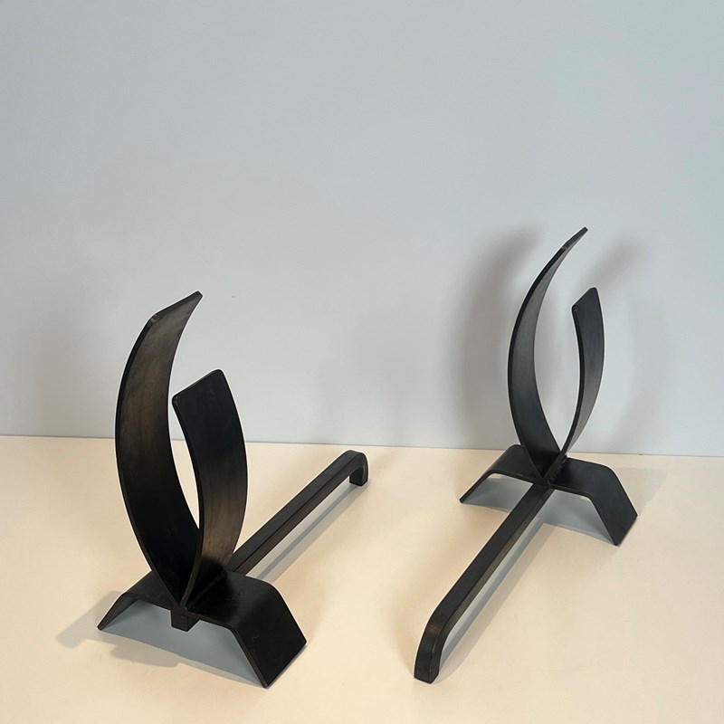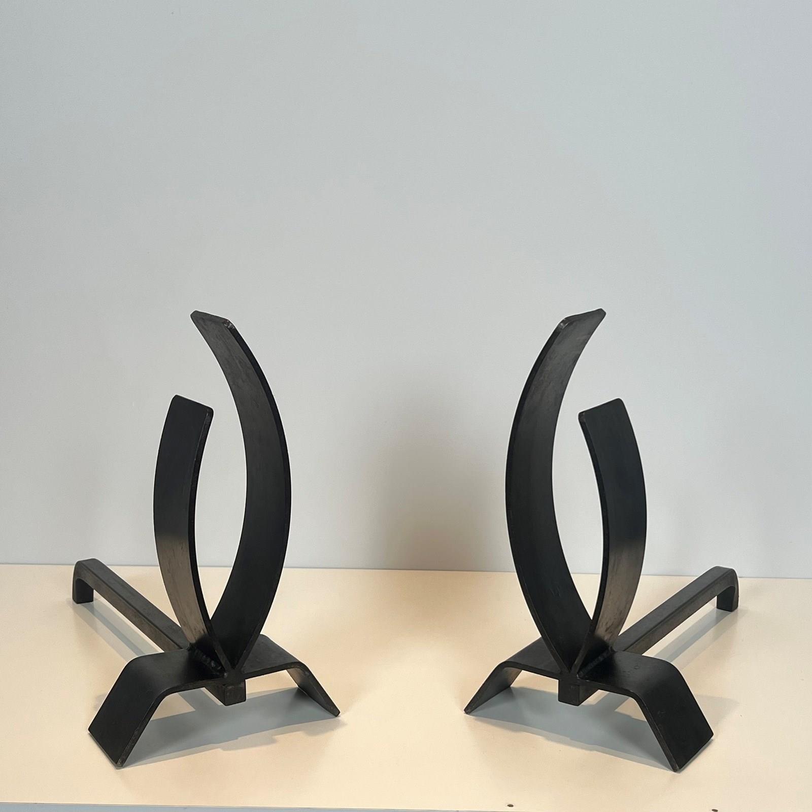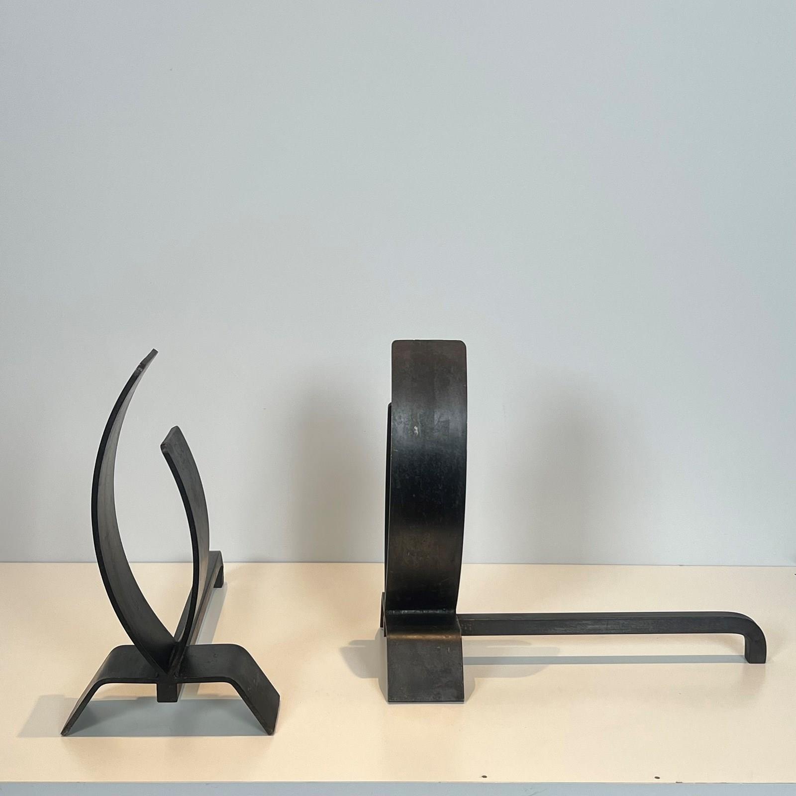 Pair of Modernist Steel and Iron Andirons. French. Circa 1970
