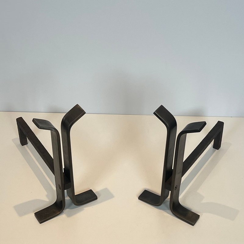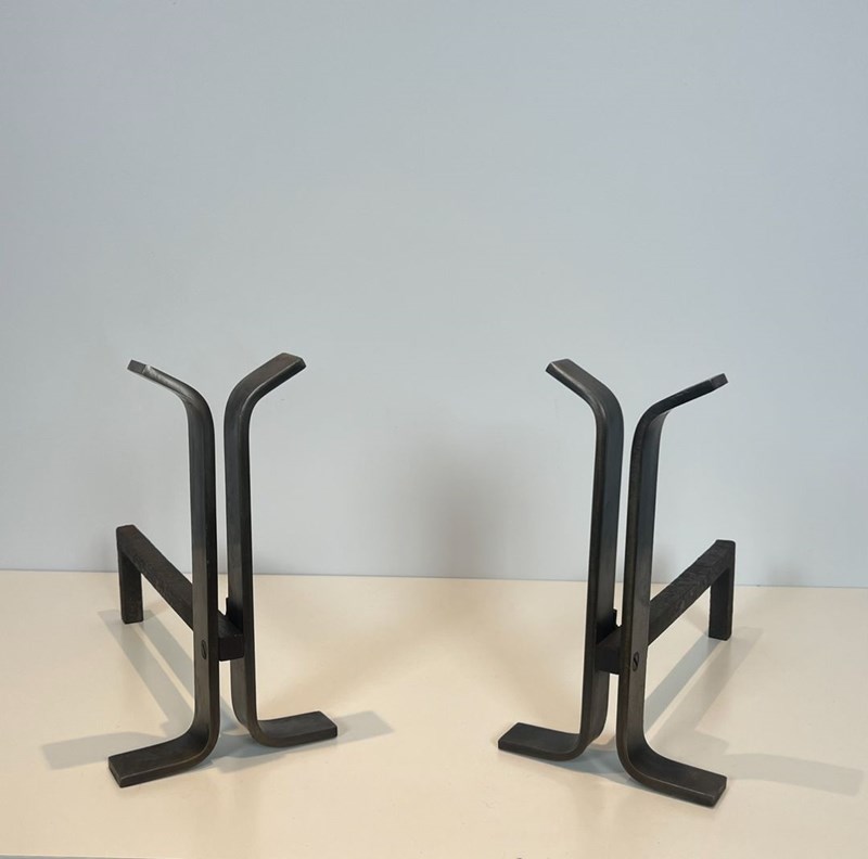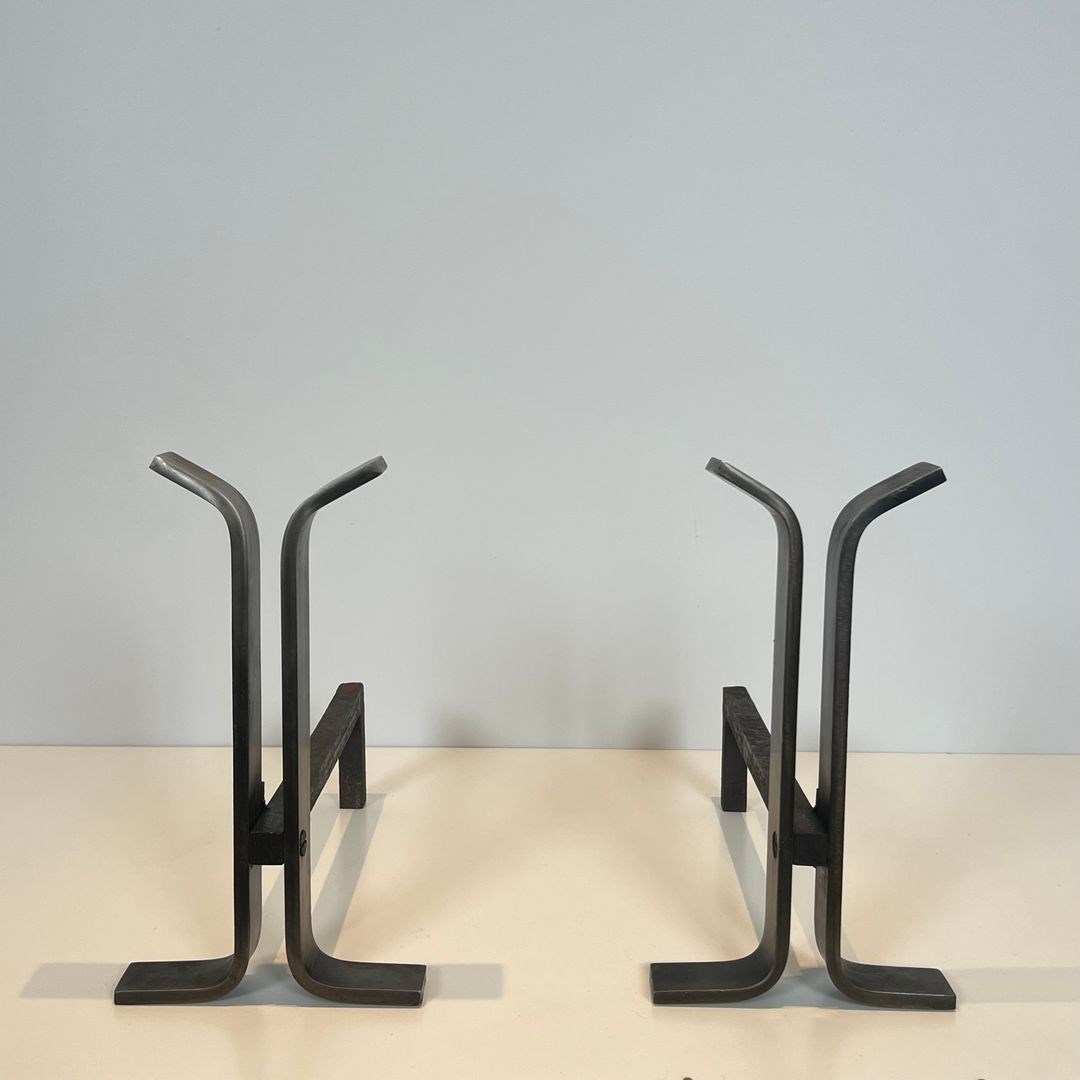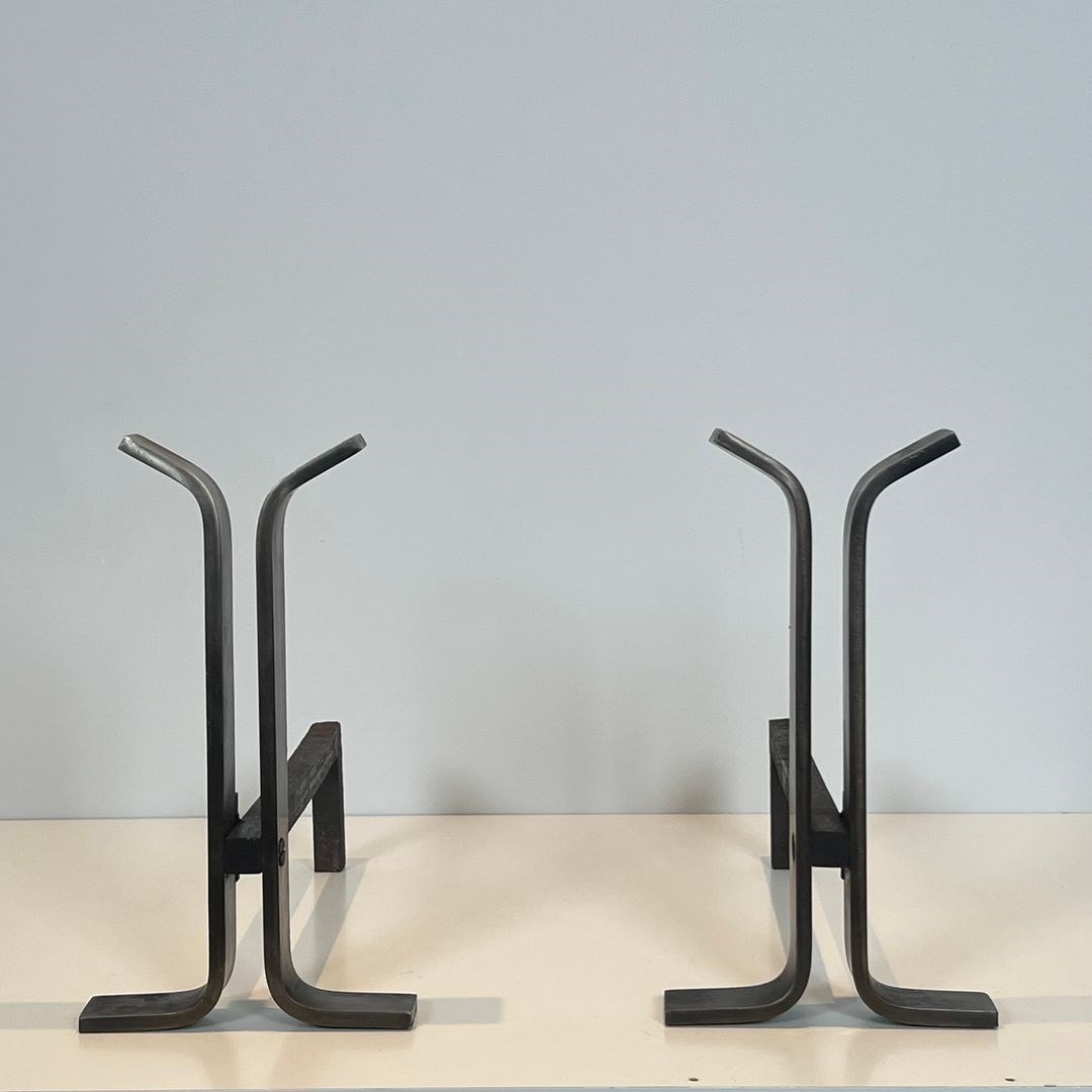 Pair of modernist steel and wrought iron andirons. French work. Circa 1970