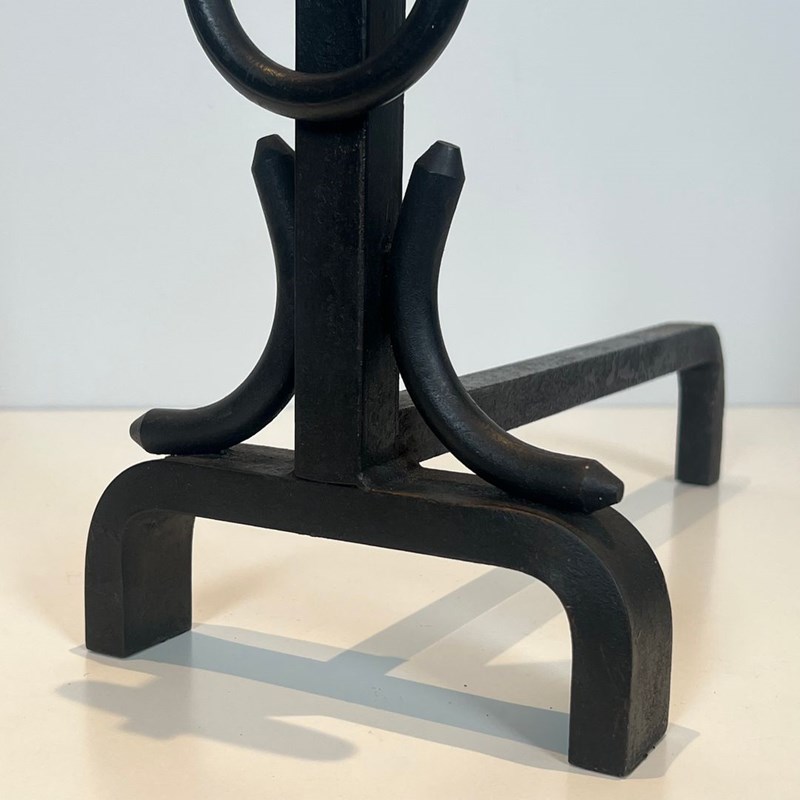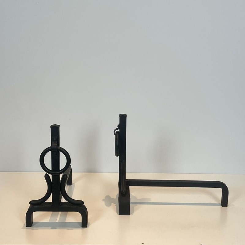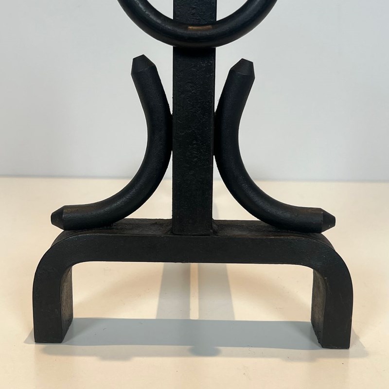 Pair of modernist wrought iron andirons. French work in the style of Jacques Adnet. Circa 1950