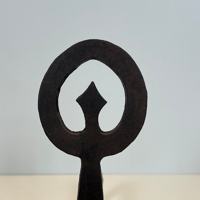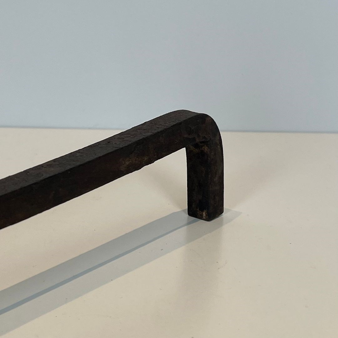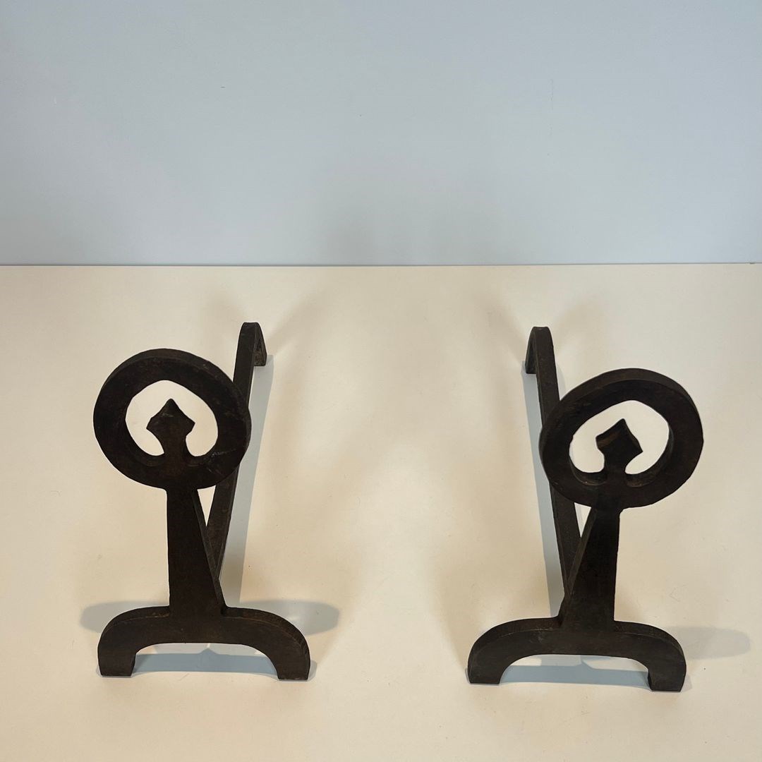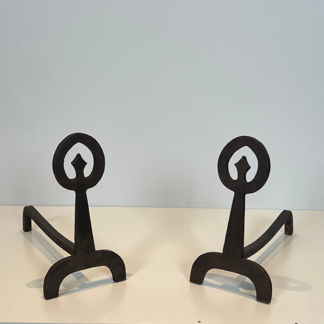 Pair of modernist wrought iron andirons. French work. Circa 1970
