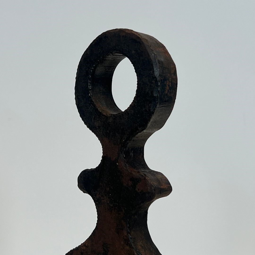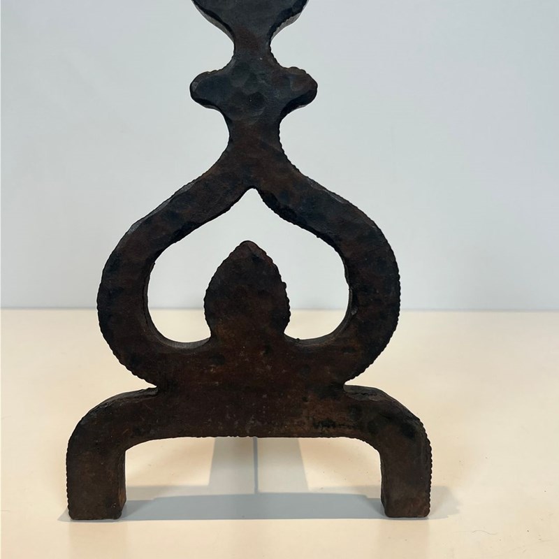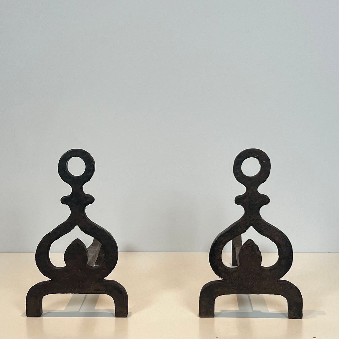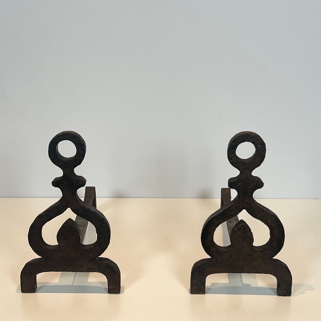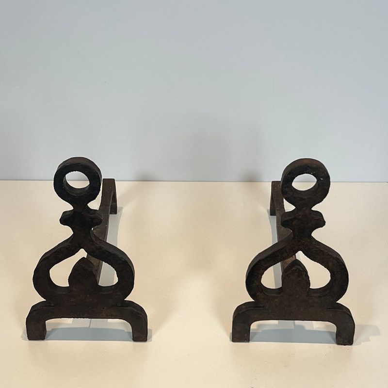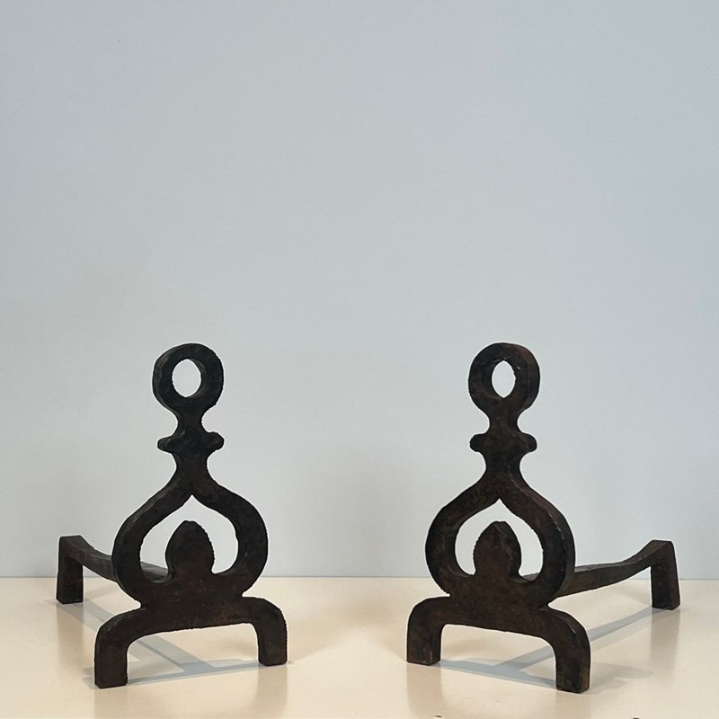 Pair of modernist wrought iron andirons. French work. Circa 1940