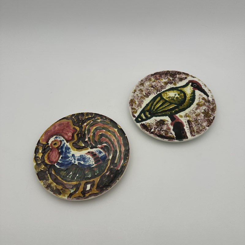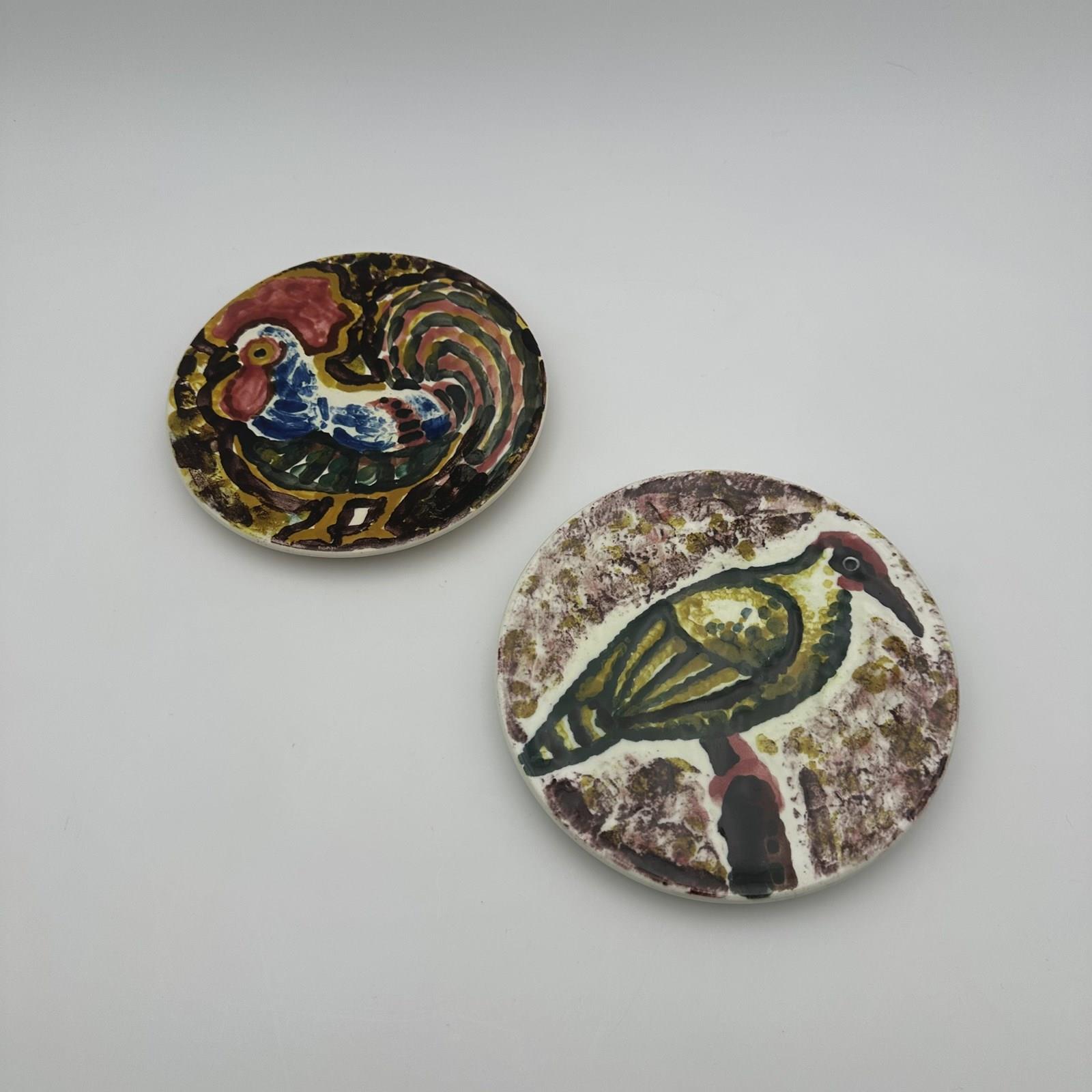 Each plate reveals a hand-painted animal motif, outlined with expressive black strokes and filled with vibrantly colored glazes. One features a proud rooster with abundant plumage, highlighted in red, blue, and yellow—a quintessential motif of the modernist bestiary. The other showcases a stylized green and yellow bird perched on a branch against a subtly speckled purple background. The brushstrokes, free, spontaneous, and deliberately naive, elevate these works to the status of true small ceramic paintings.