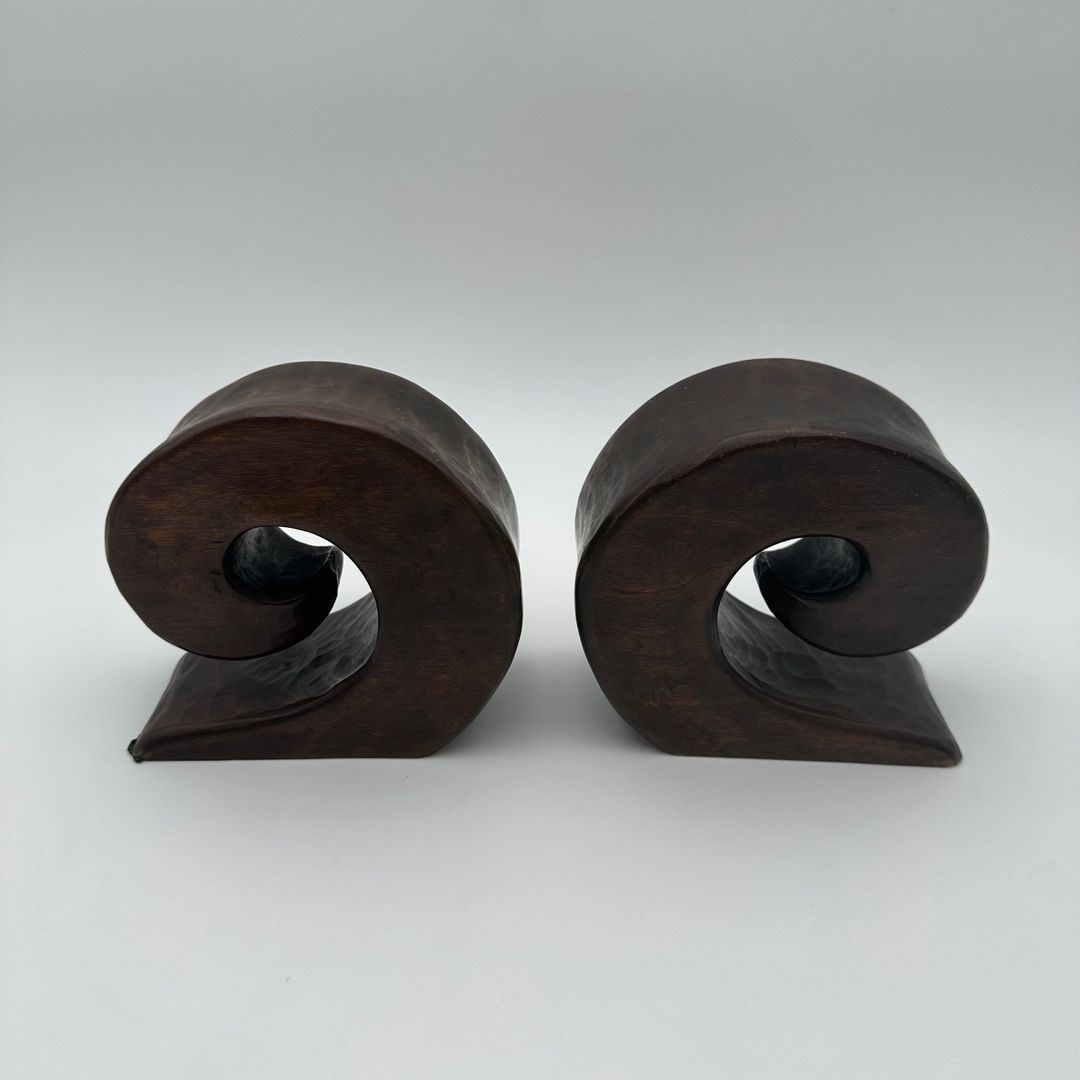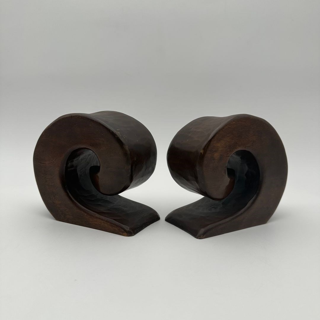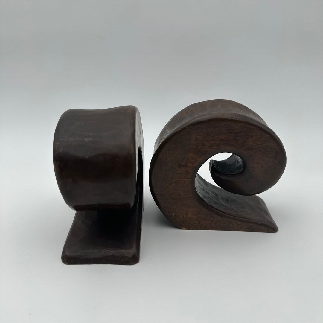 Pair of solid walnut bookends made in the style of Alexandre Noll. The organic and refined forms highlight the natural grain of the wood, in a modernist spirit characteristic of mid-20th-century French design.