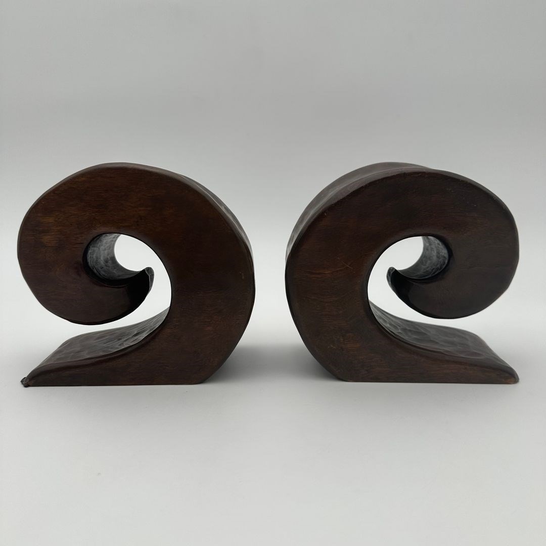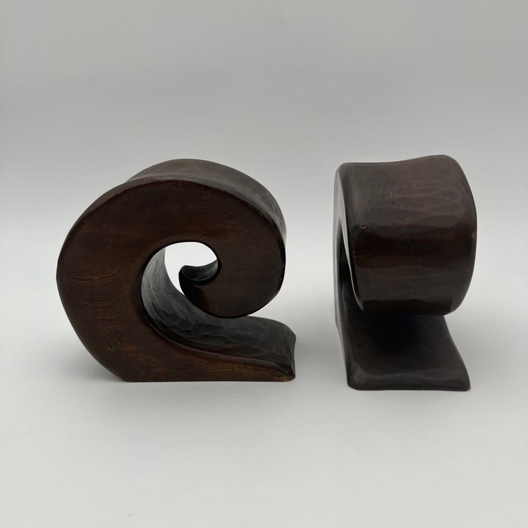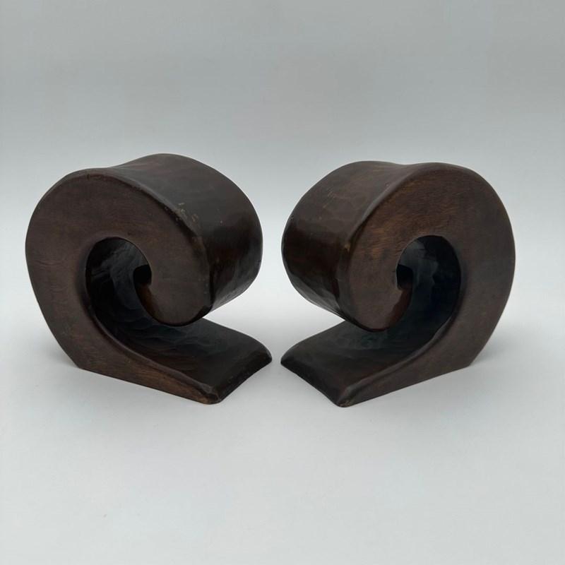 Pair of solid walnut bookends made in the style of Alexandre Noll. The organic and refined forms highlight the natural grain of the wood, in a modernist spirit characteristic of mid-20th-century French design.