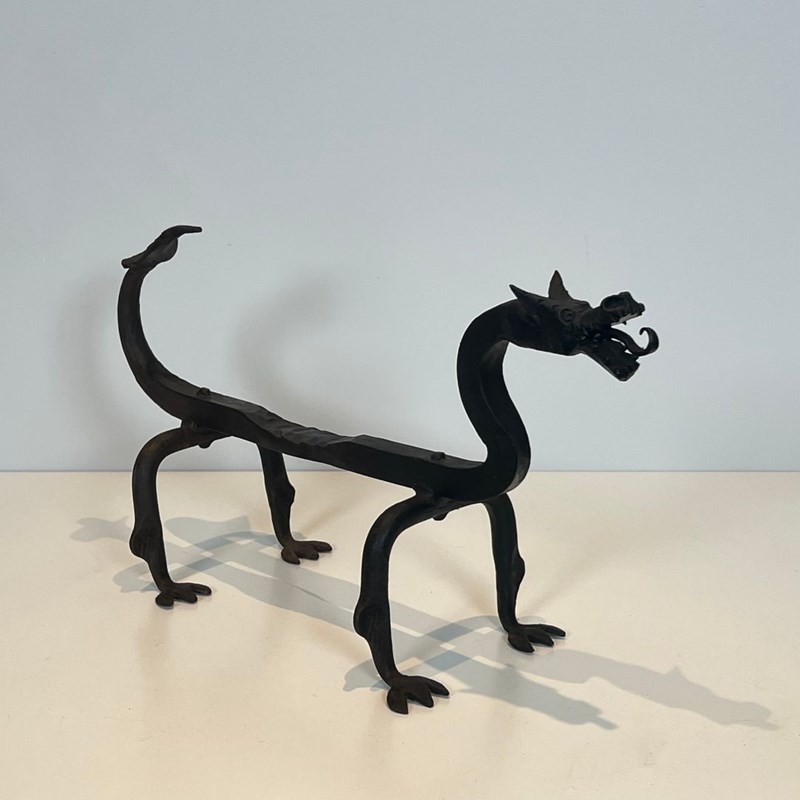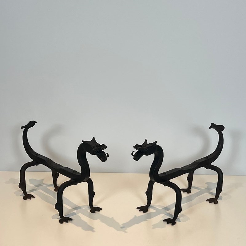 Pair of wrought iron dragon andirons. French work. Circa 1940