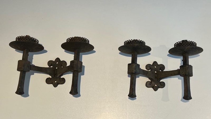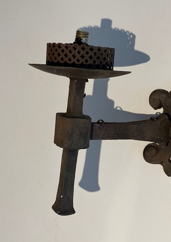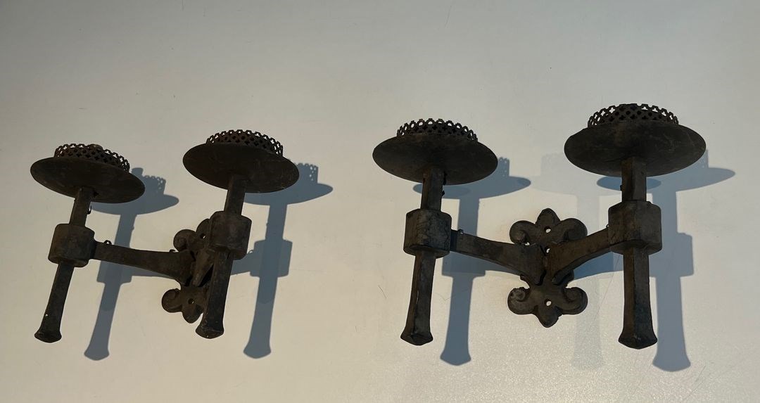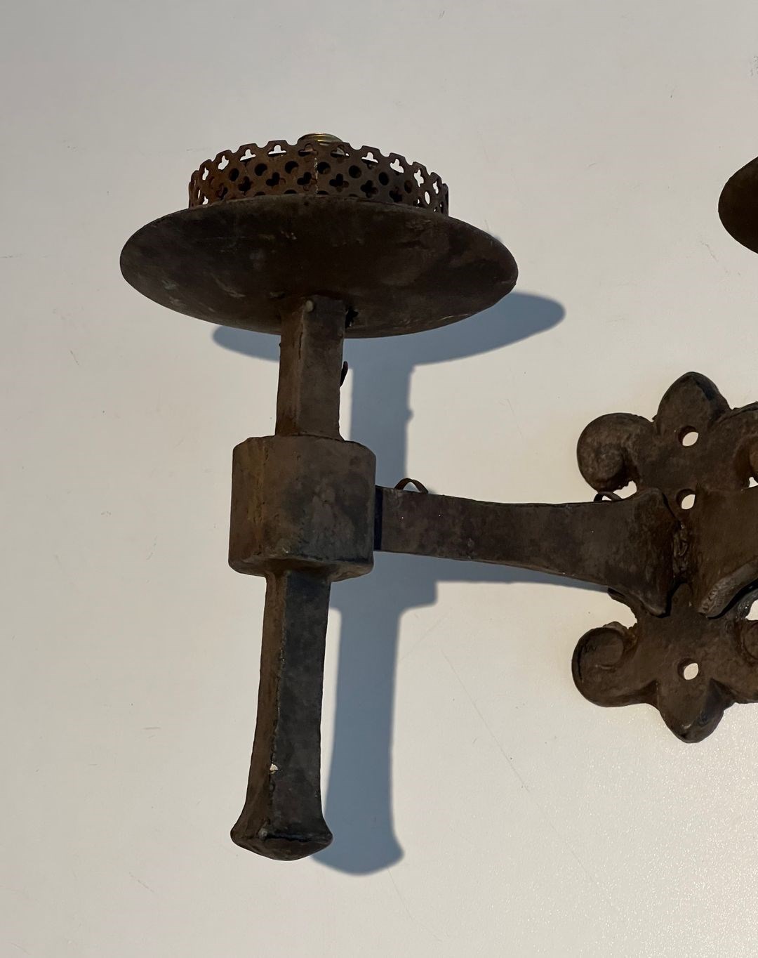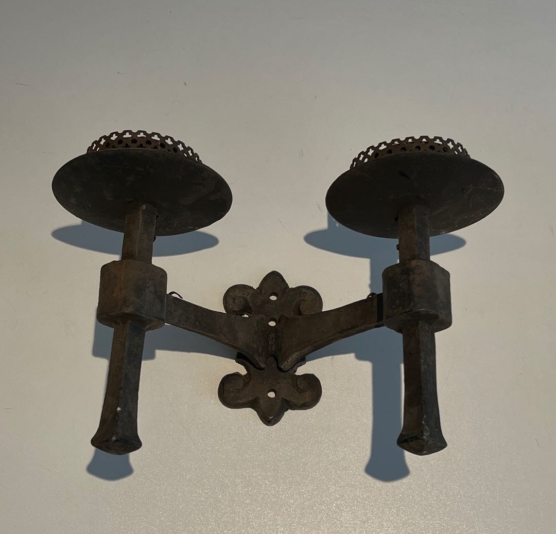 Pair of wrought iron wall lights with 2 Arms. French work in the Gothic Style. Circa 1940