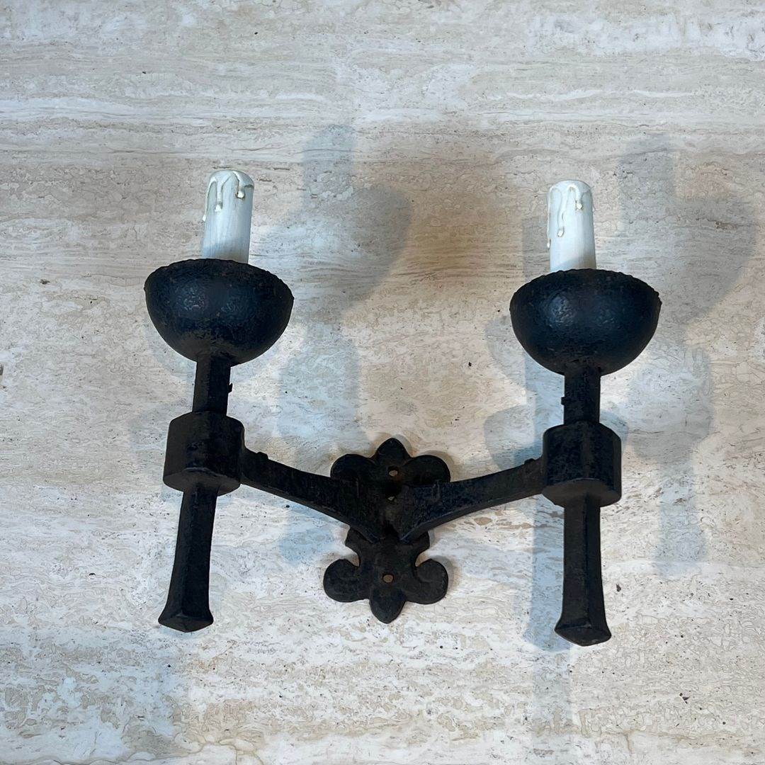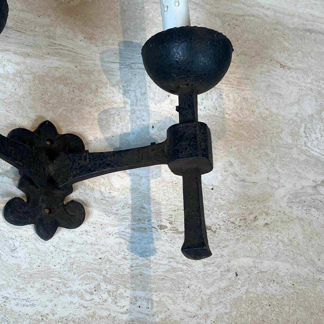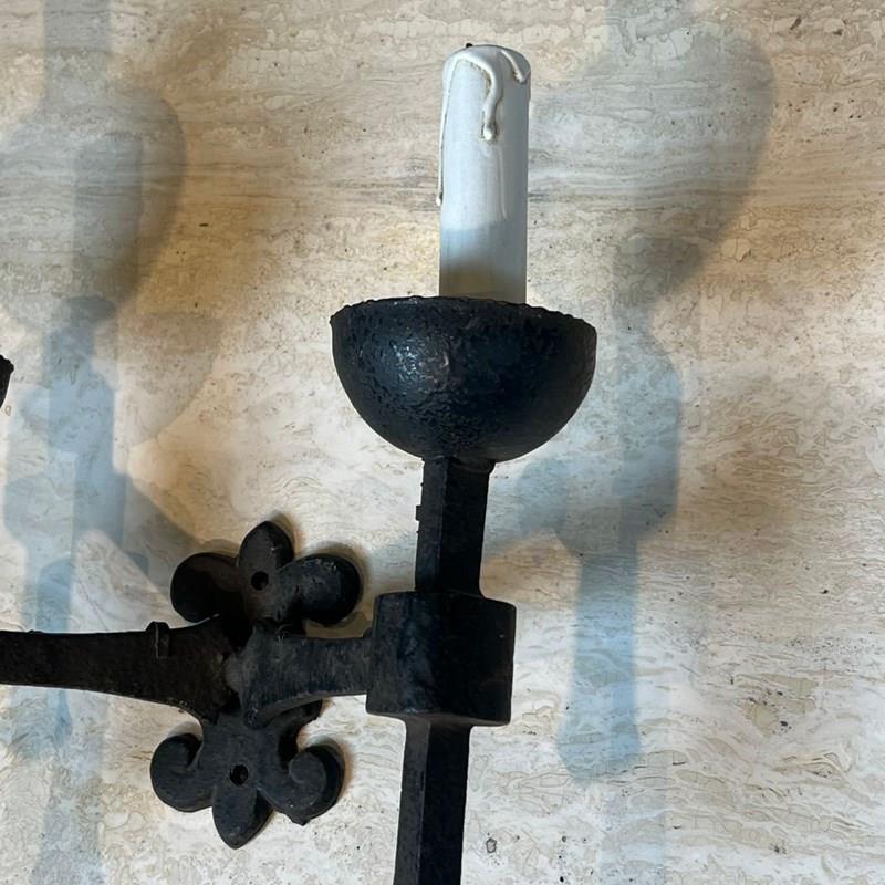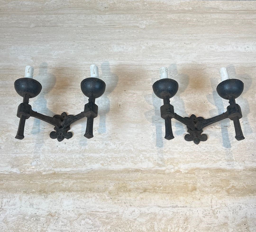 Pair of wrought iron wall lights with 2 Arms. French work in the Gothic Style (Indicated Height without candles). Circa 1940