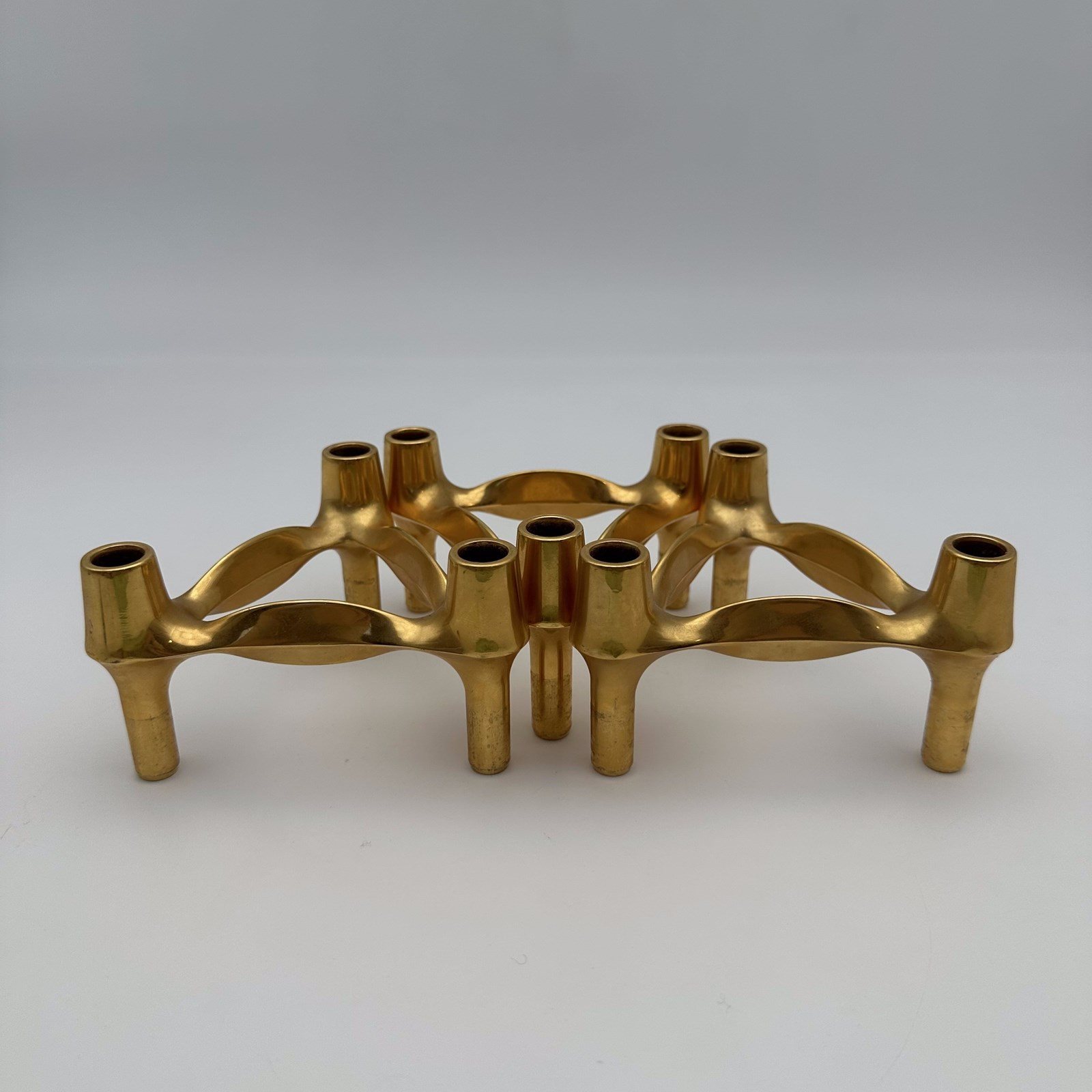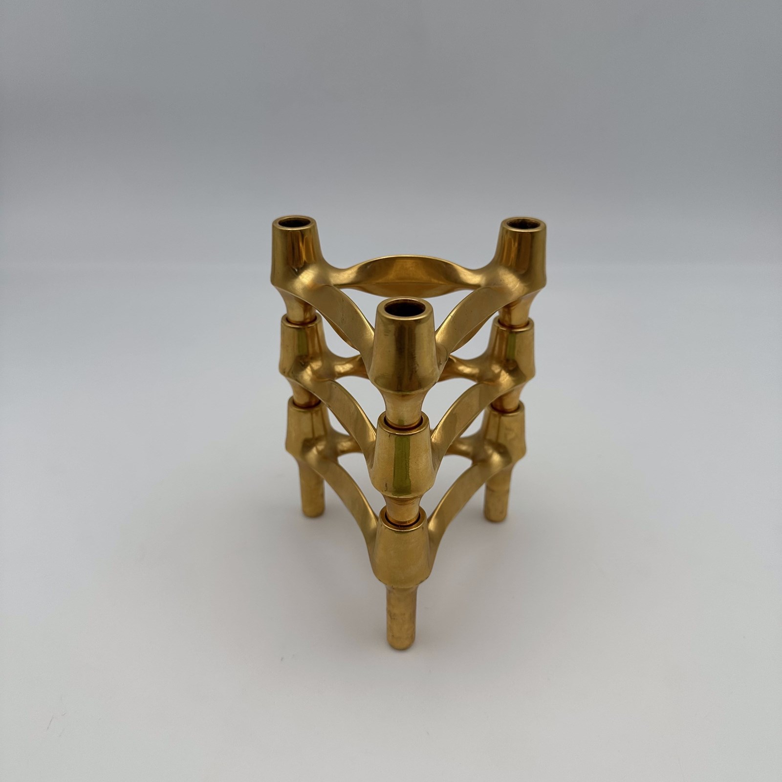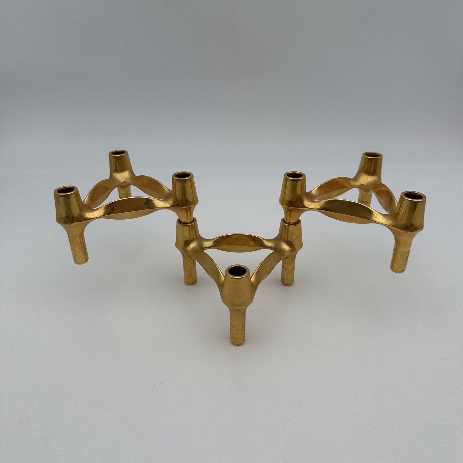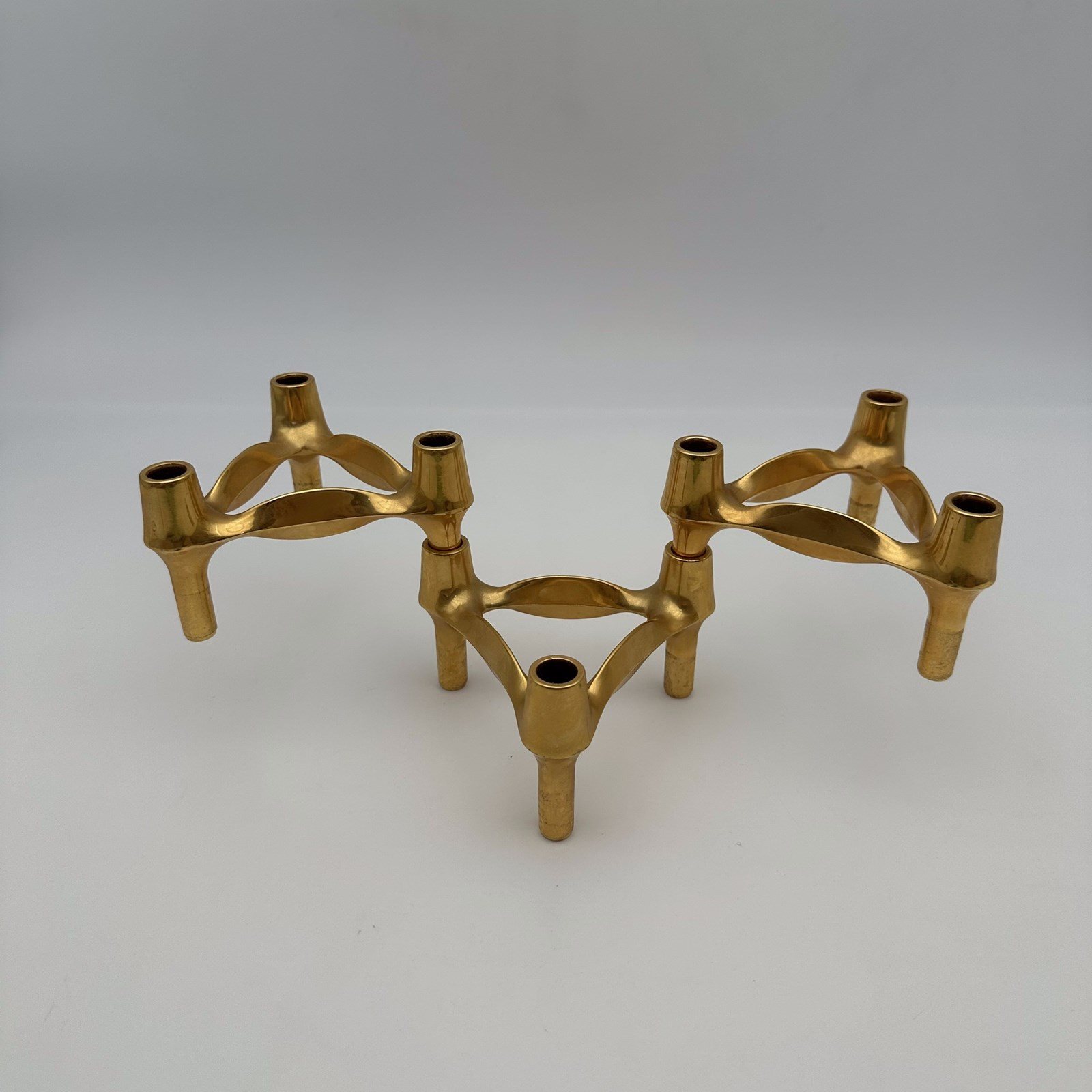 The strength of this creation lies in its infinite modular ingenuity. Each tripod element, with its nervous, organic, and subtly brutalist lines, is designed to interlock perfectly with the others. The three-piece set offered here allows you to create your own architectural structures, whether pyramidal, linear, or asymmetrical. The golden metal warmly catches the light, highlighting the sculpted and "atomic" profile so characteristic of this era.