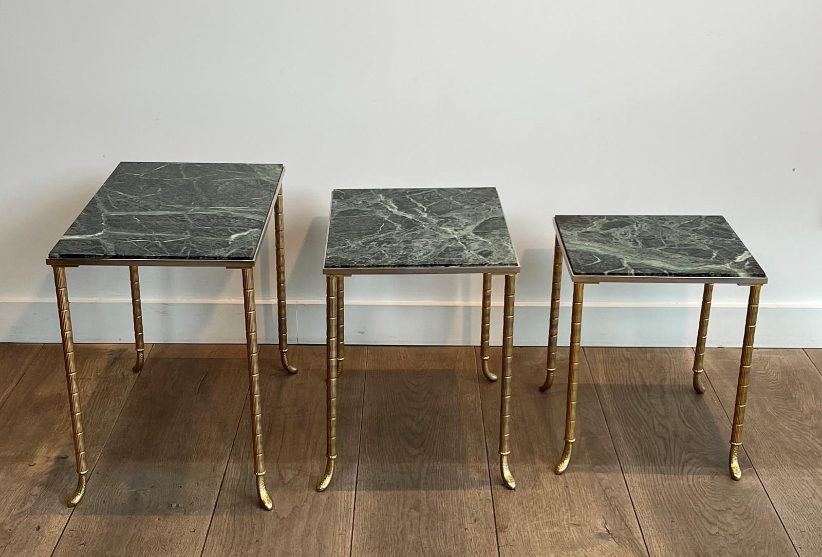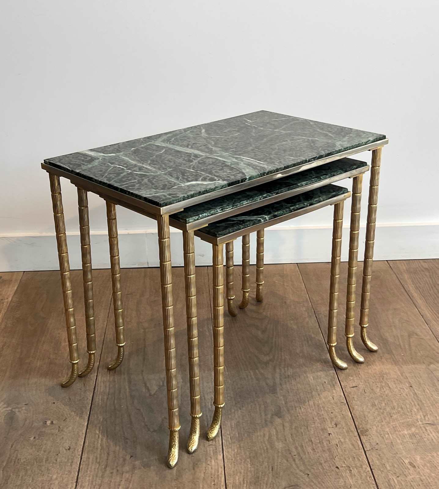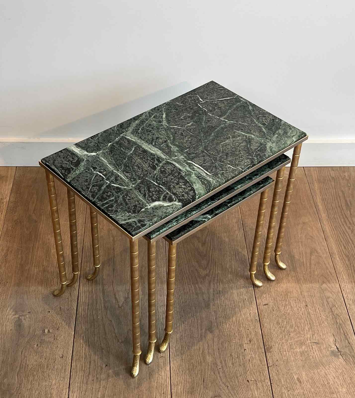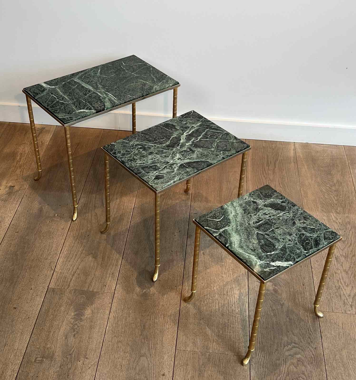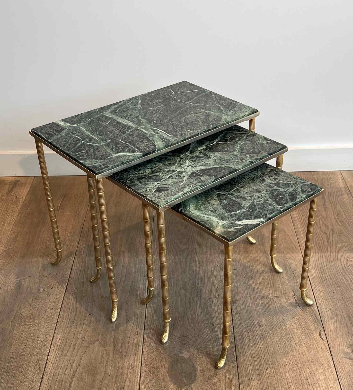 Set of 3 nesting tables in nickel-plated and gilt-plated metal with green Alpine marble tops by Maison Jansen