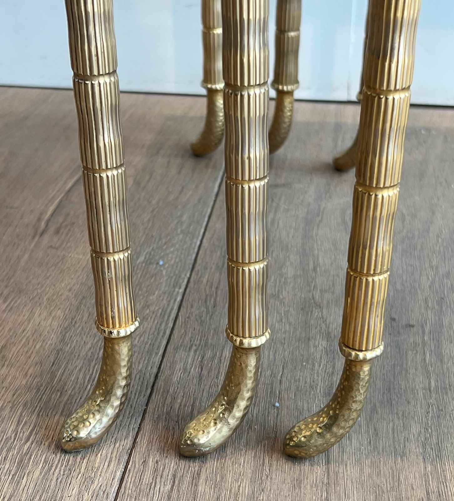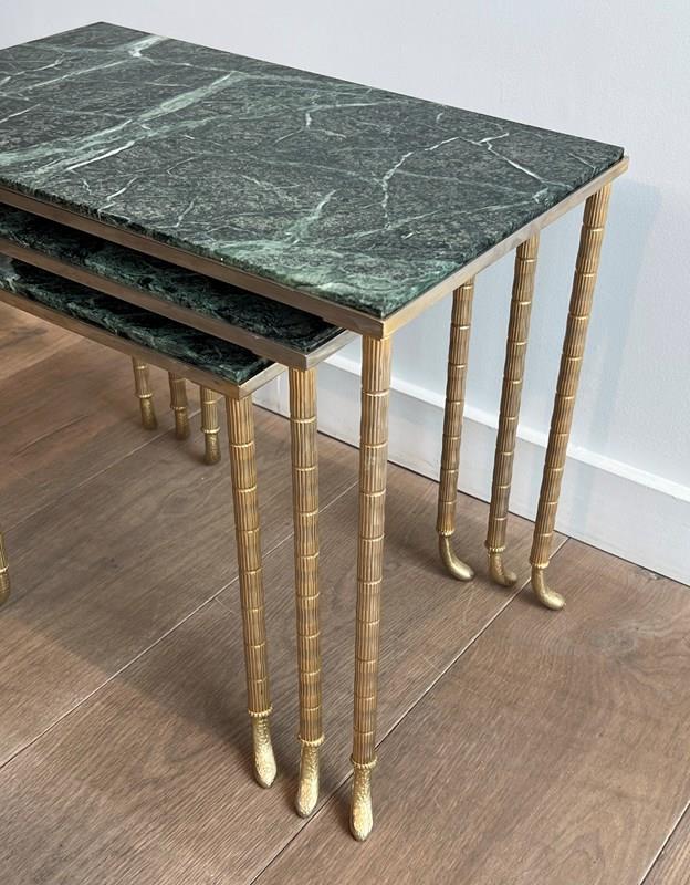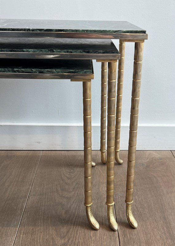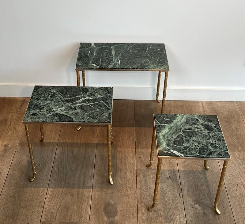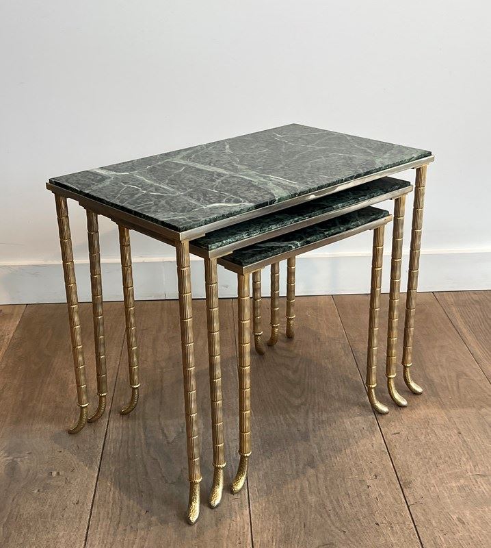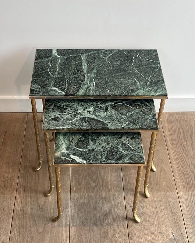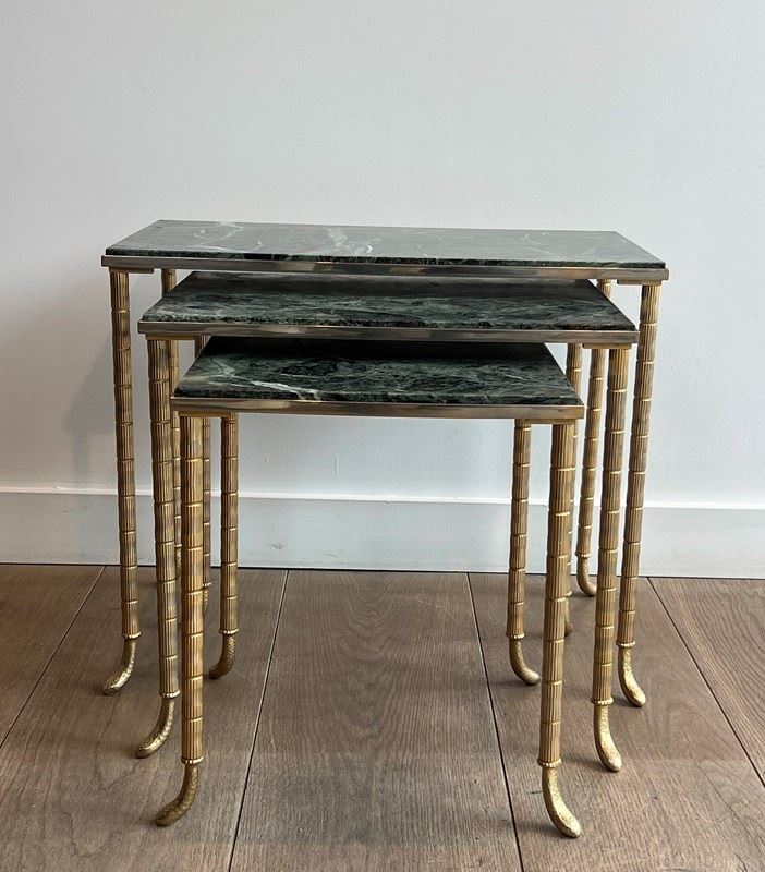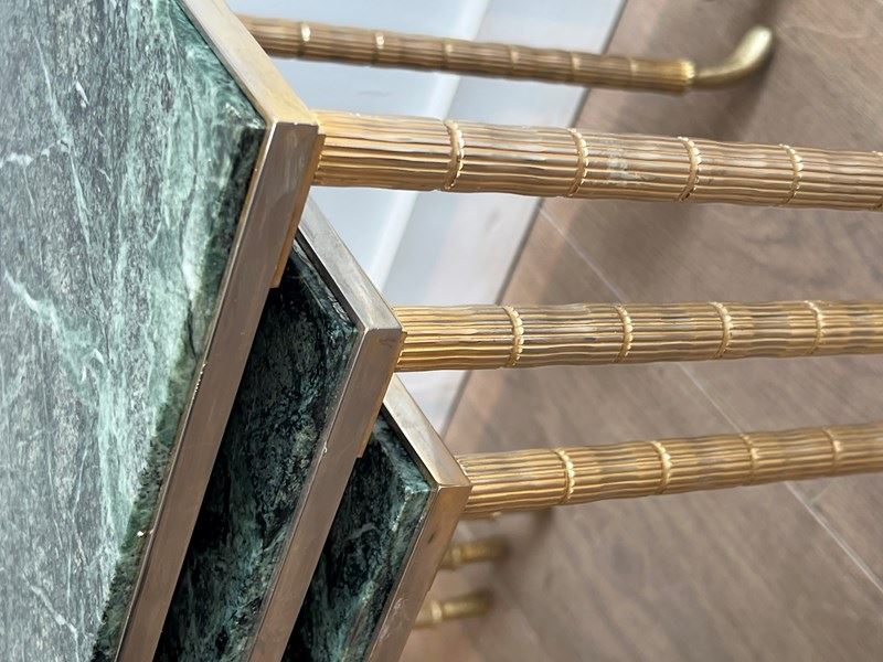 Set of 3 nesting tables in nickel-plated and gilt-plated metal with green Alpine marble tops by Maison Jansen