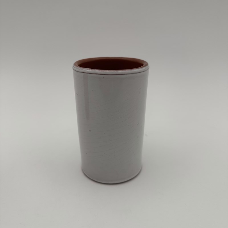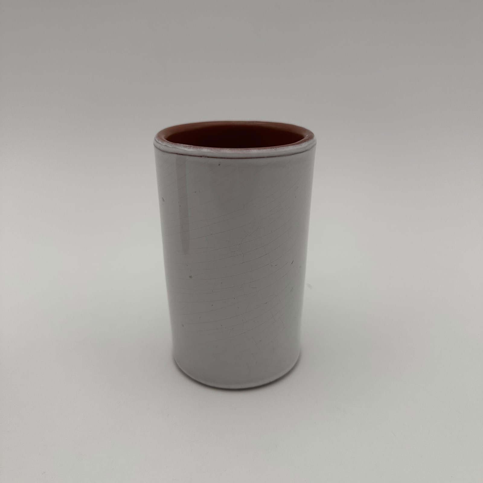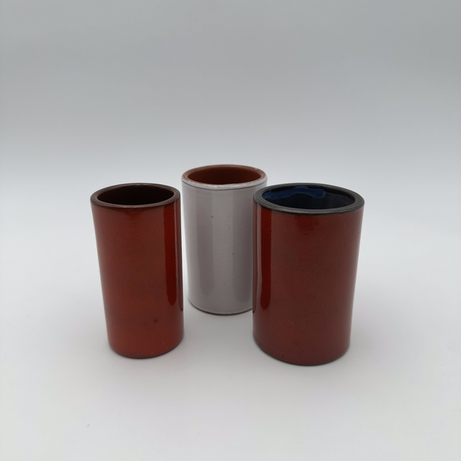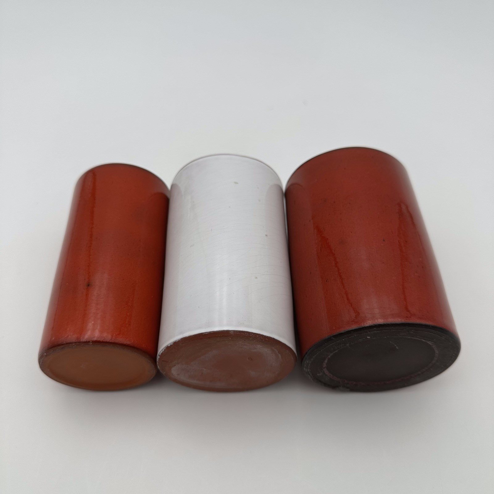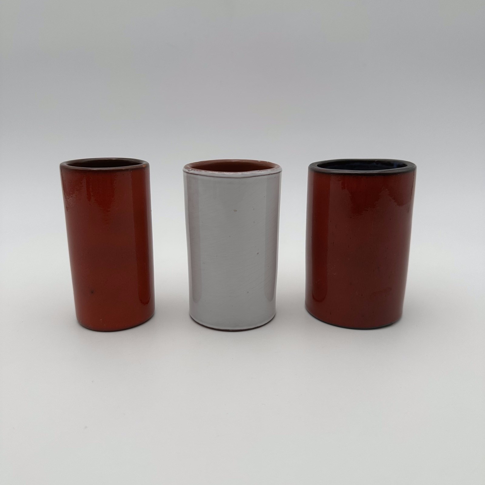 Standing 10.5 cm tall with subtly varying diameters (from 5 to 6.5 cm), these pieces reveal remarkable glaze work. Two of them are covered in a thick, deep, and vibrant "oxblood" red glaze, while the third boasts a luminous milky white. The contrast between the mirroring shine of the glaze and the raw, matte terracotta left exposed at the rims demonstrates a perfect technical mastery, typical of the best productions of the period.