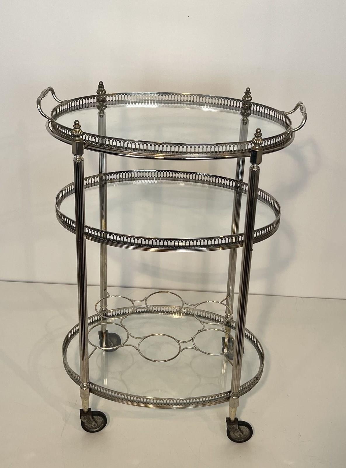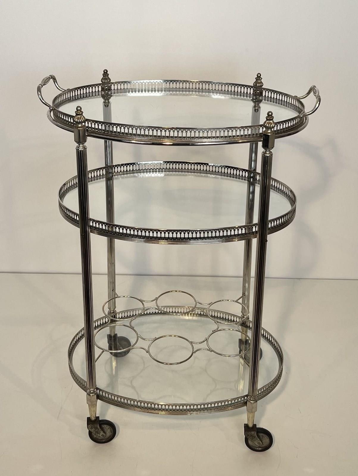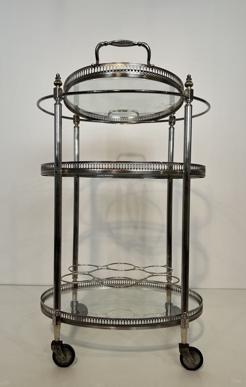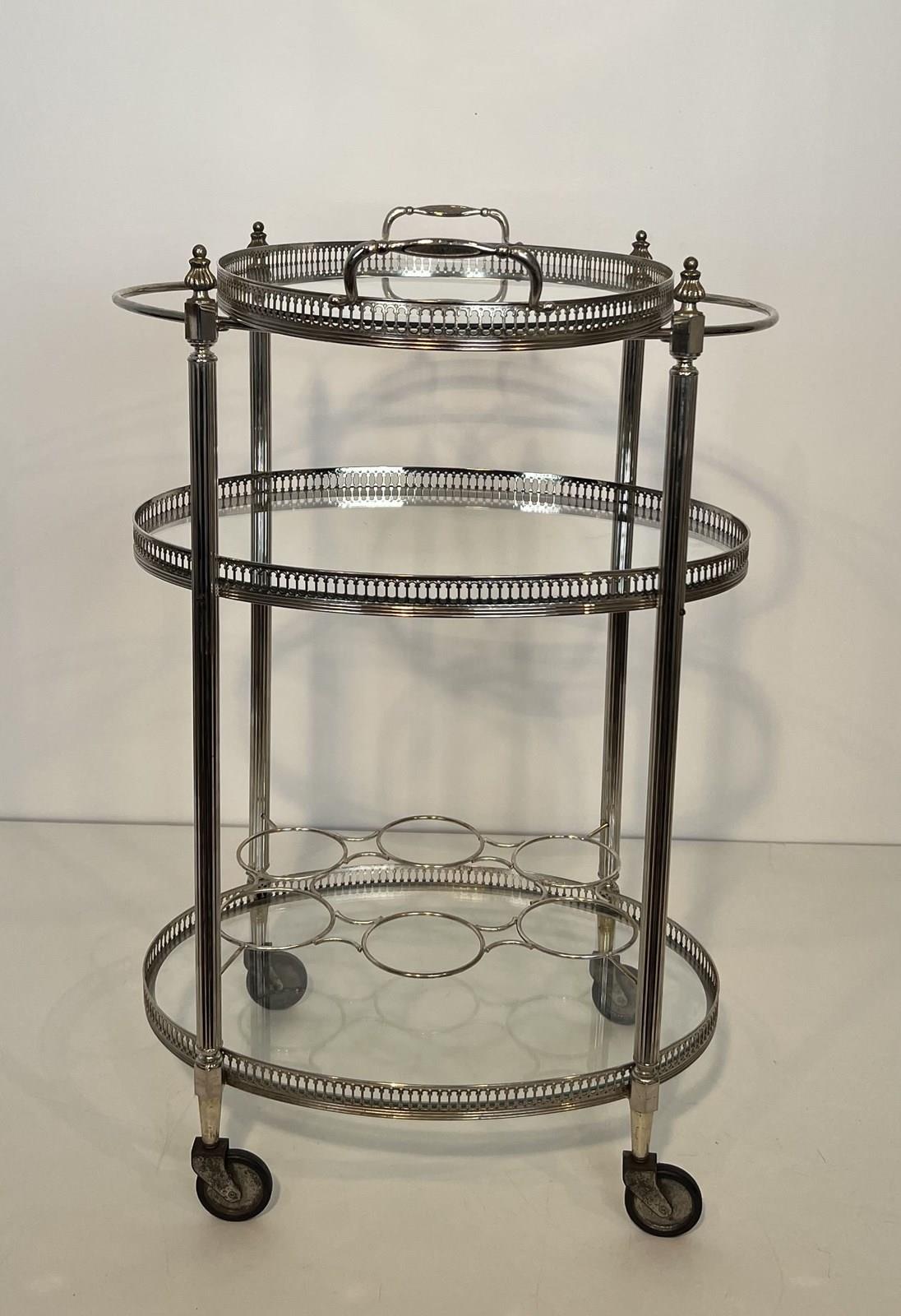This three-tier rolling table is highly representative of mid-20th-century Parisian high-end serving furniture. The architecture of the piece rests on four silver-plated metal uprights detailed with fine fluting, terminating at the base in their original directional casters and crowned at the top with turned finials. The piece features three oval clear glass tiers, strictly enclosed by pierced silver-plated galleries. The top tier is flanked by two lateral handles. The lower tier is distinguished by the integration of a bottle-holder structure consisting of six welded rings, combining functionality with aesthetic demand.