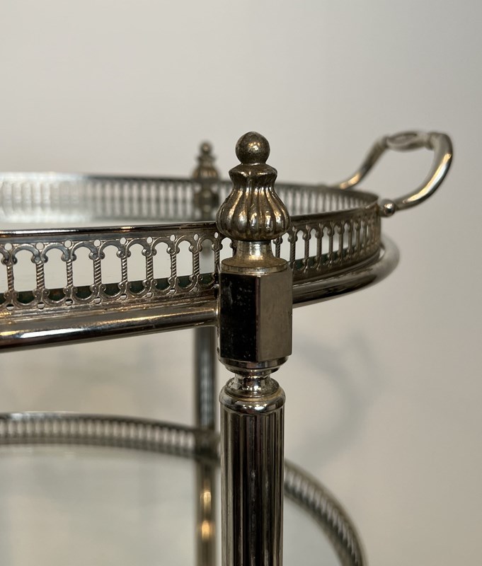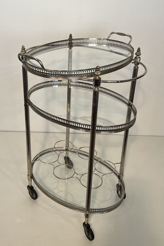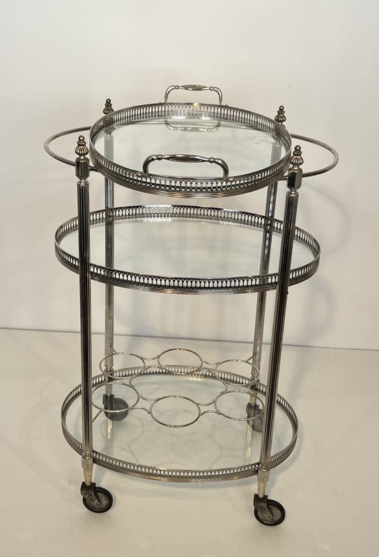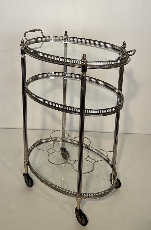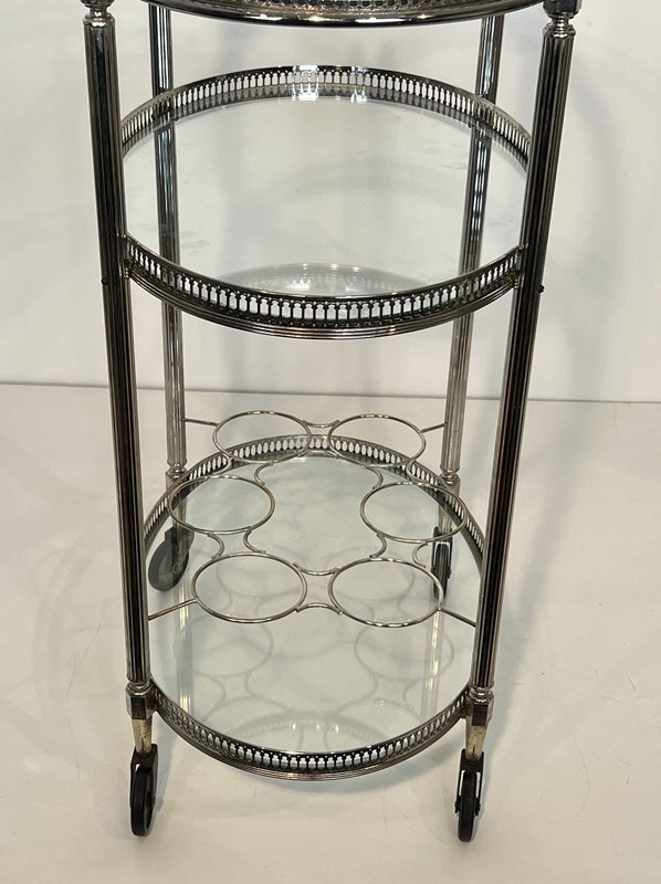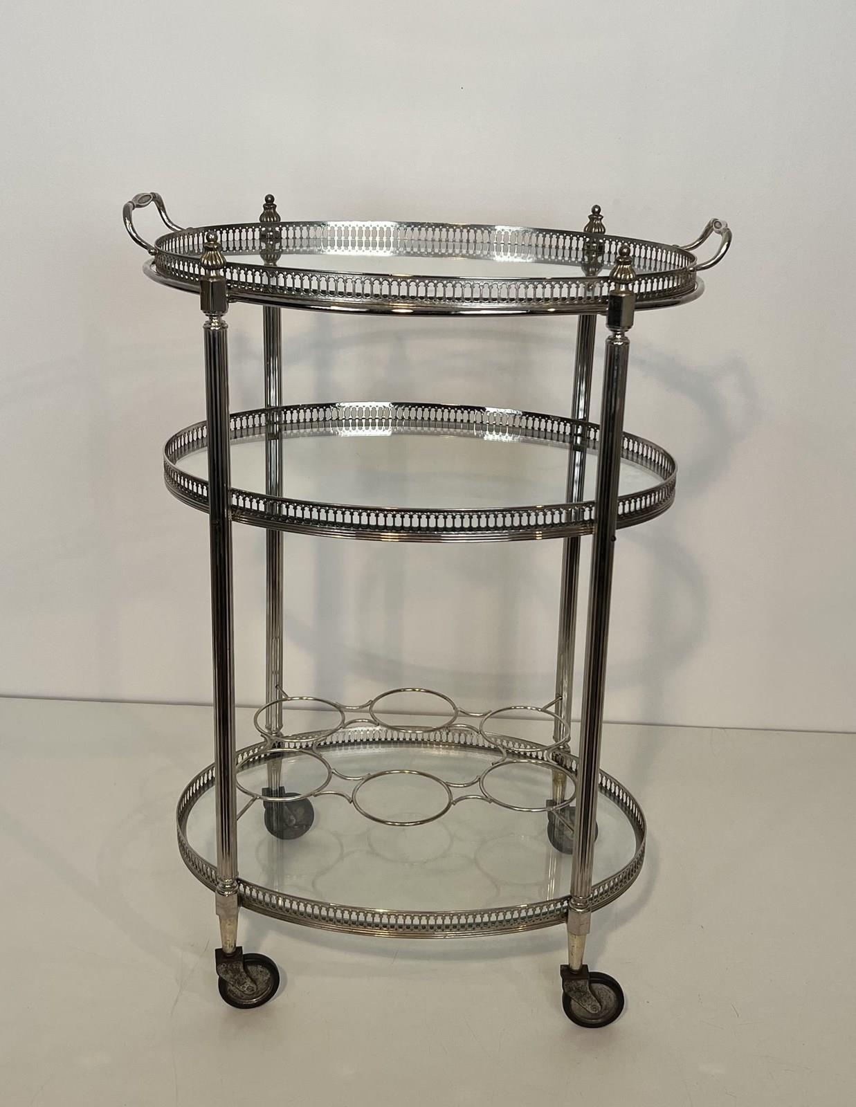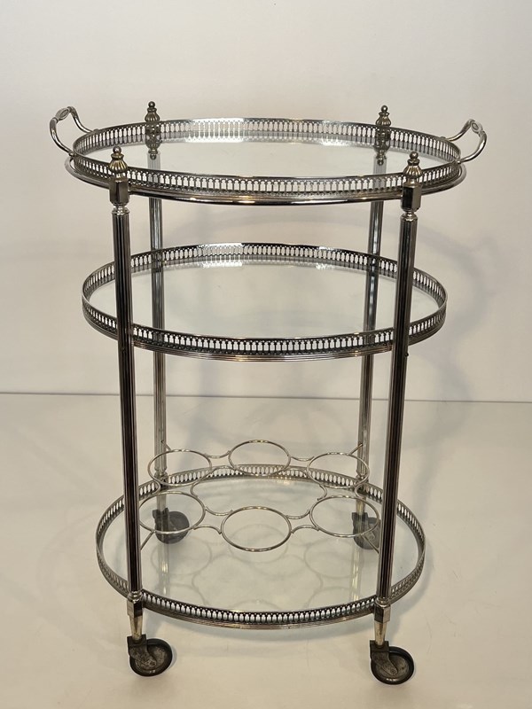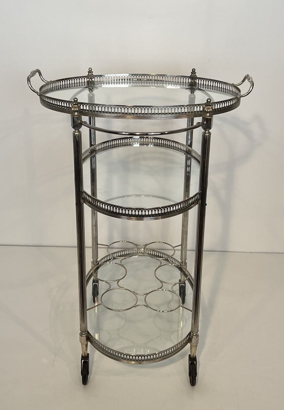 This three-tier rolling table is highly representative of mid-20th-century Parisian high-end serving furniture. The architecture of the piece rests on four silver-plated metal uprights detailed with fine fluting, terminating at the base in their original directional casters and crowned at the top with turned finials. The piece features three oval clear glass tiers, strictly enclosed by pierced silver-plated galleries. The top tier is flanked by two lateral handles. The lower tier is distinguished by the integration of a bottle-holder structure consisting of six welded rings, combining functionality with aesthetic demand.