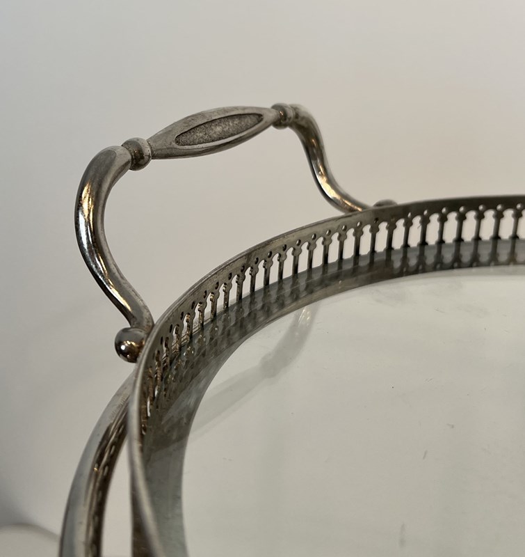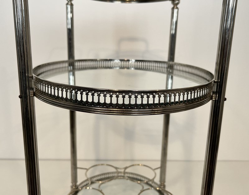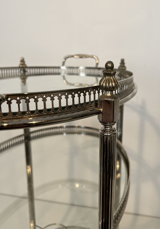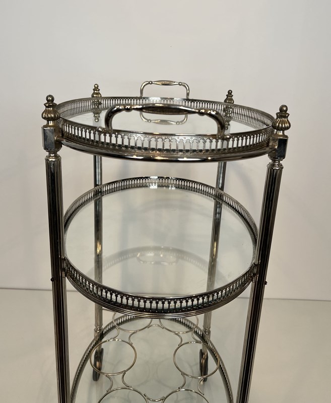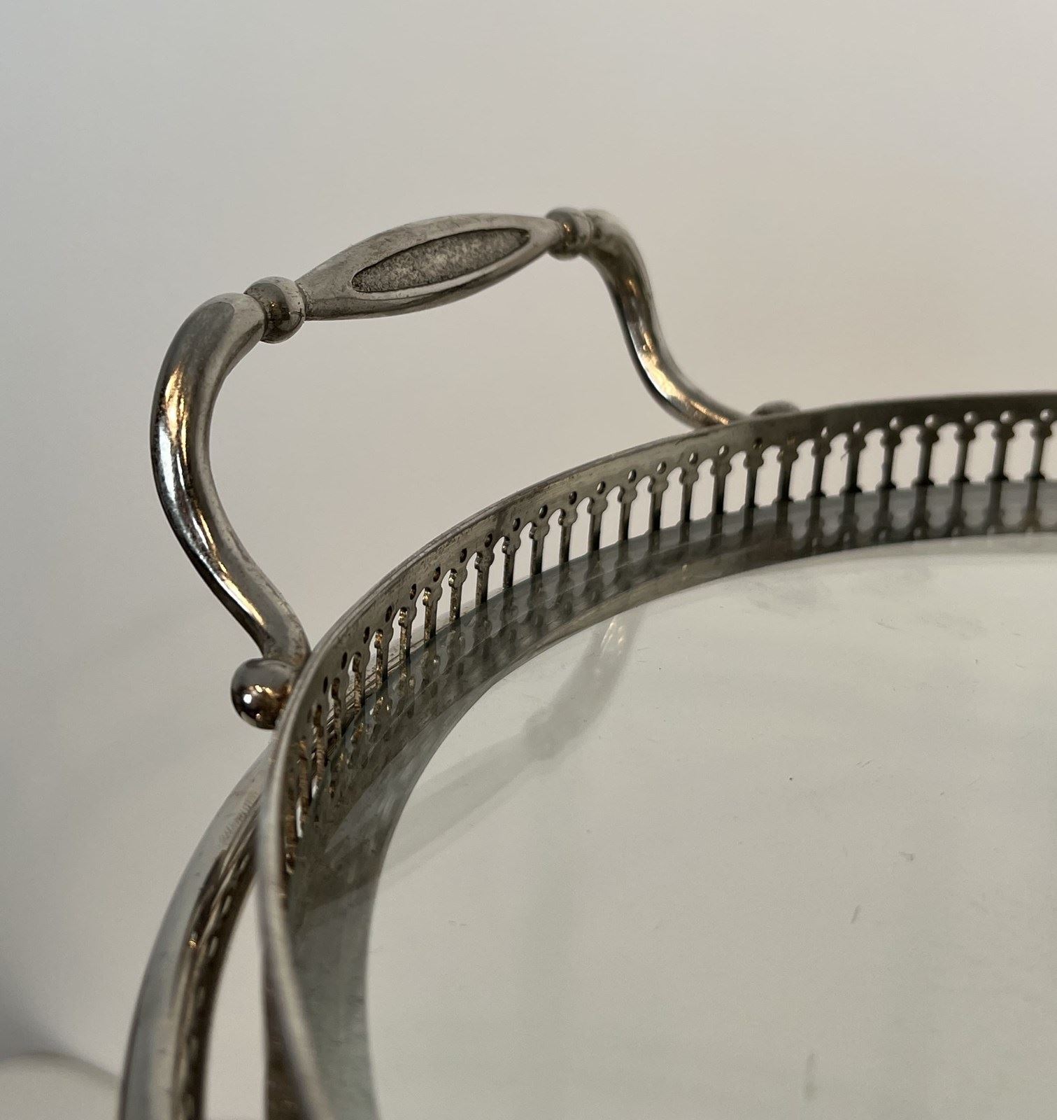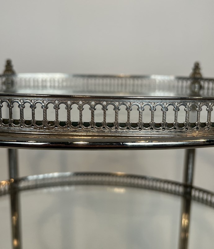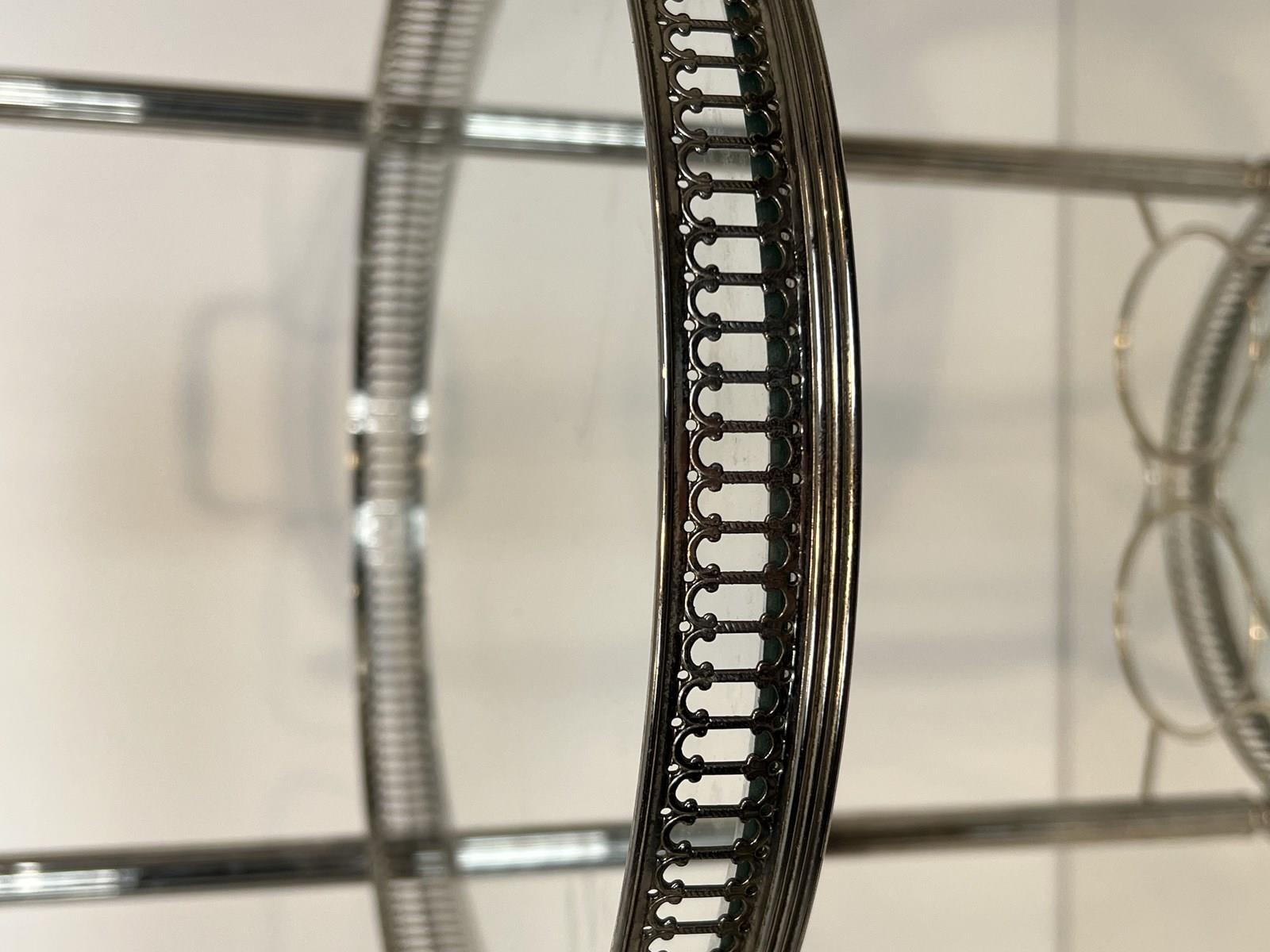 This three-tier rolling table is highly representative of mid-20th-century Parisian high-end serving furniture. The architecture of the piece rests on four silver-plated metal uprights detailed with fine fluting, terminating at the base in their original directional casters and crowned at the top with turned finials. The piece features three oval clear glass tiers, strictly enclosed by pierced silver-plated galleries. The top tier is flanked by two lateral handles. The lower tier is distinguished by the integration of a bottle-holder structure consisting of six welded rings, combining functionality with aesthetic demand.