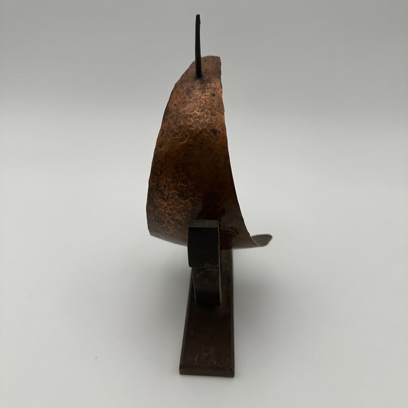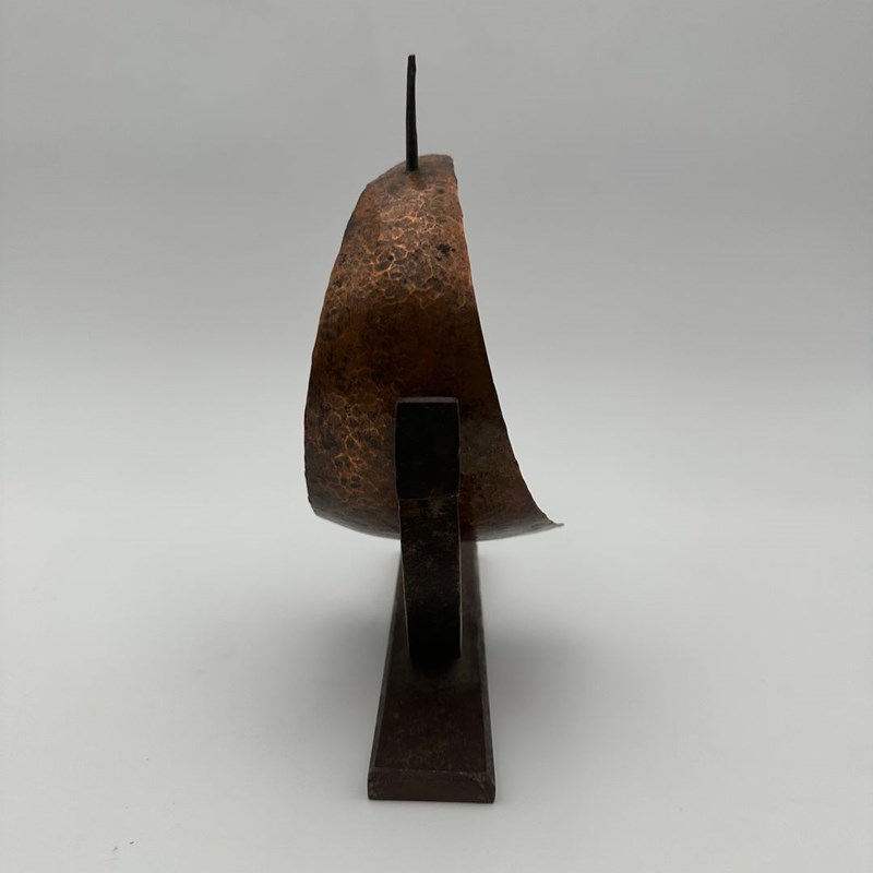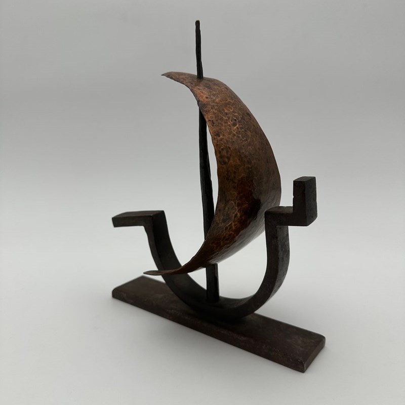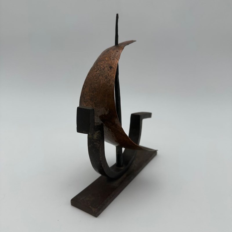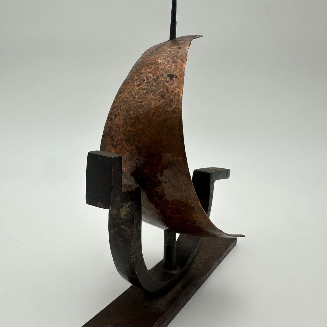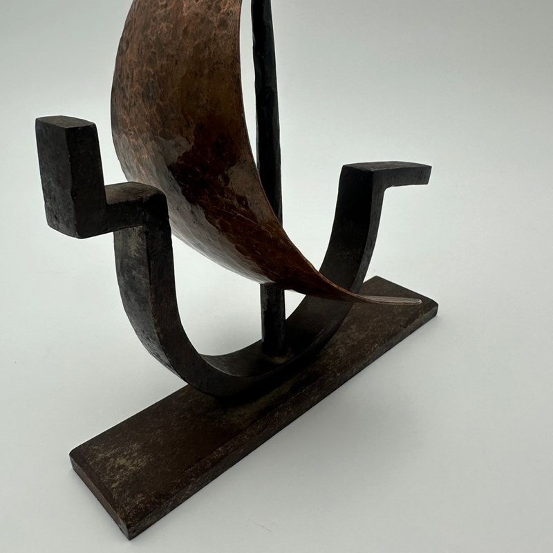 Wrought and hammered iron sculpture depicting a stylized sailboat gliding over the waves, featuring a copper sail that creates an elegant contrast with the dark metal structure. This refined composition is characteristic of the Art Deco vocabulary of the 1920s.