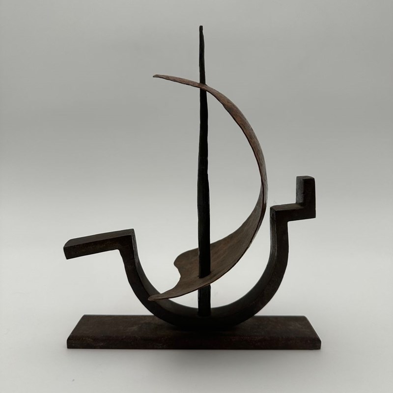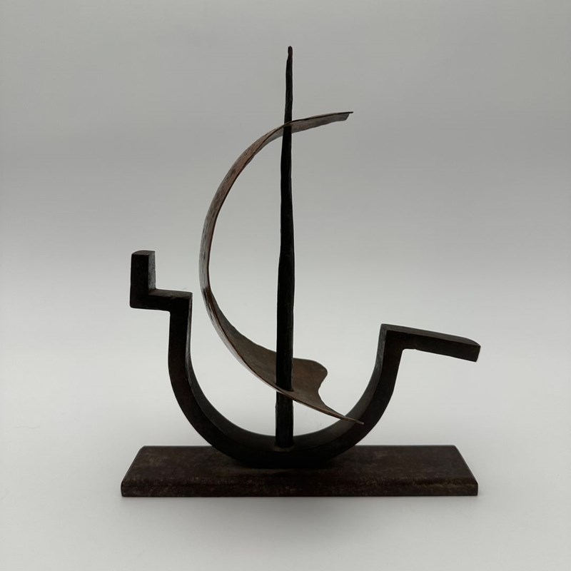 Wrought And Hammered Iron Sculpture Depicting A Stylized Sailboat Gliding Over T