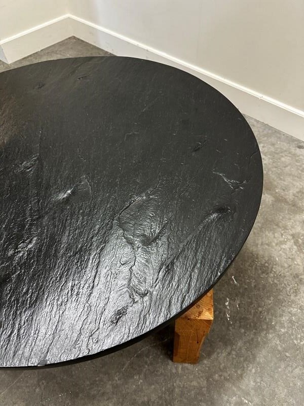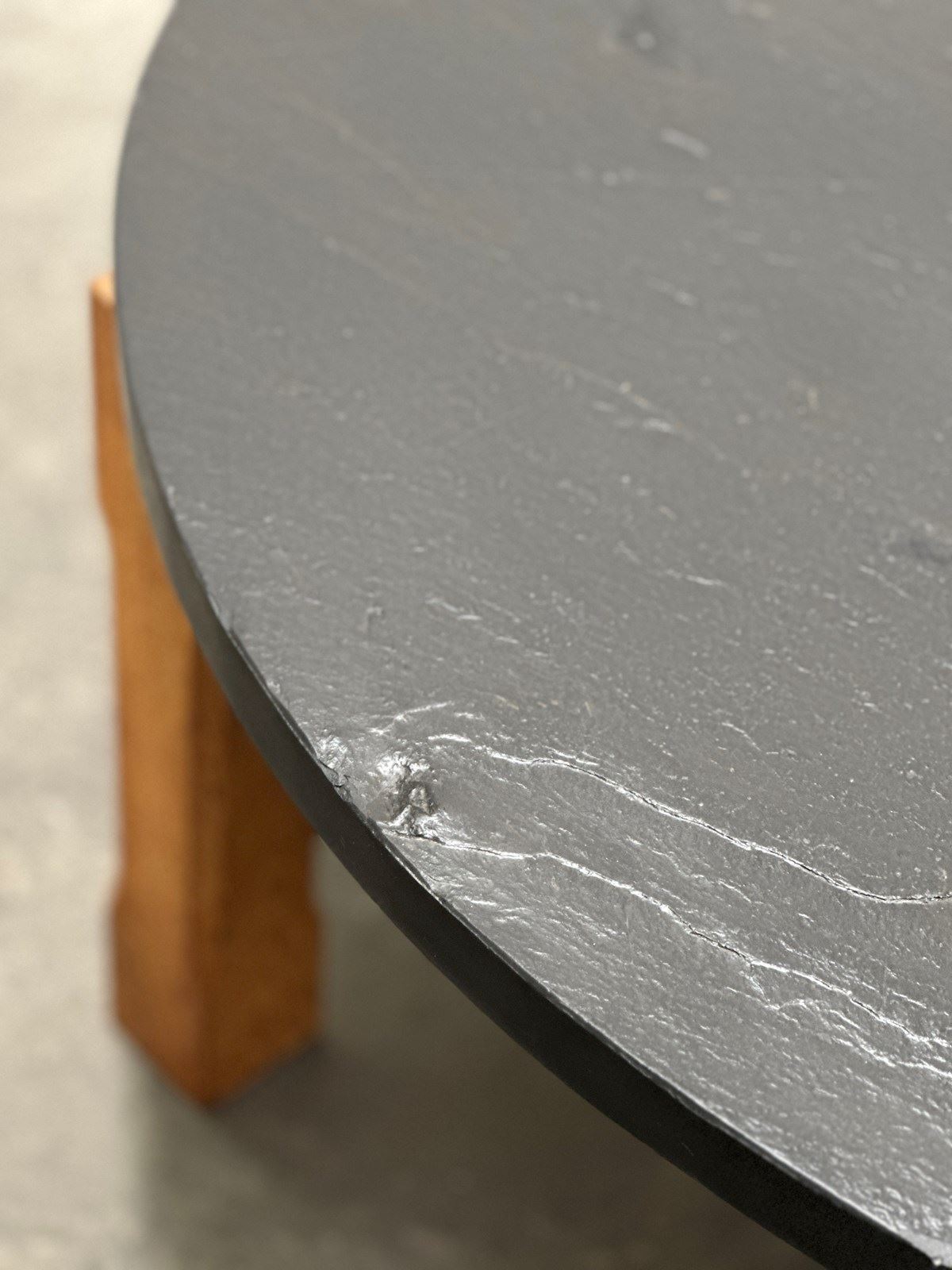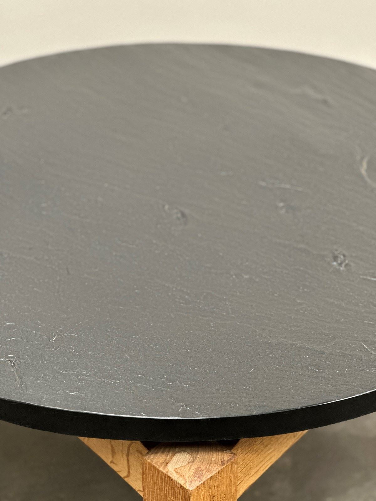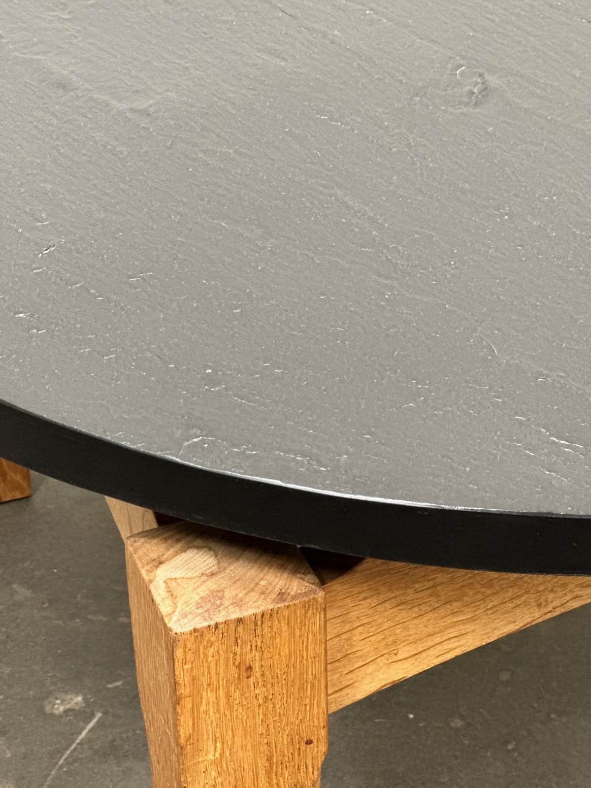 The circular tabletop is made from beautifully textured black slate, offering a dramatic contrast to the warm tones of the oak. The stone surface retains its natural clefts, veins, and irregularities — a tactile topography that catches light and invites touch. Each mark and variation is a testament to the authenticity of the stone and reinforces the table’s organic yet brutalist personality.
