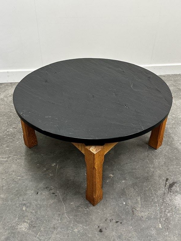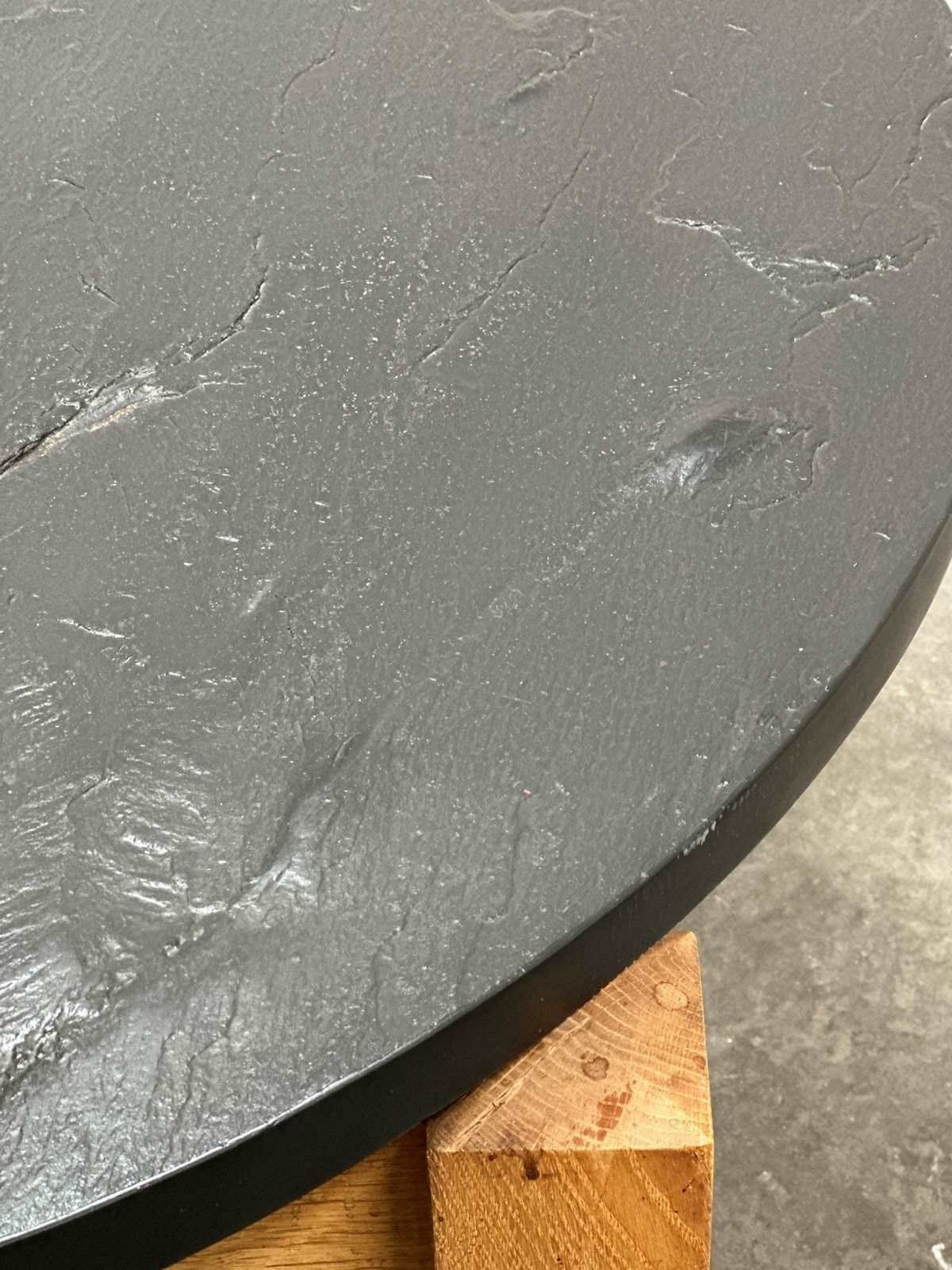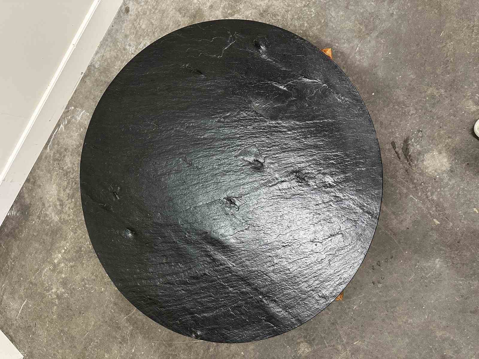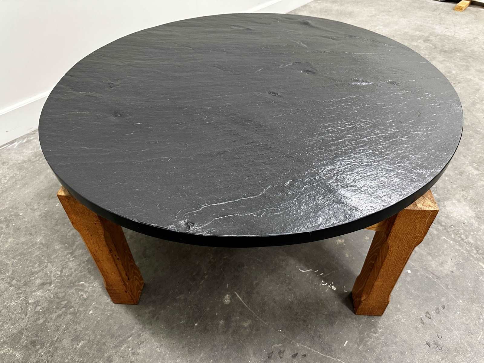 The circular tabletop is made from beautifully textured black slate, offering a dramatic contrast to the warm tones of the oak. The stone surface retains its natural clefts, veins, and irregularities — a tactile topography that catches light and invites touch. Each mark and variation is a testament to the authenticity of the stone and reinforces the table’s organic yet brutalist personality.