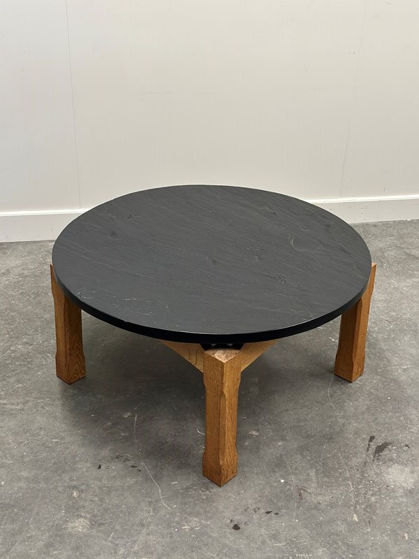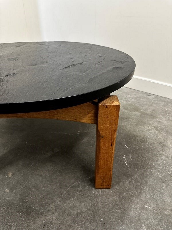 1970S Belgian Brutalist Coffee Table In Textured Black Slate And Solid Oak