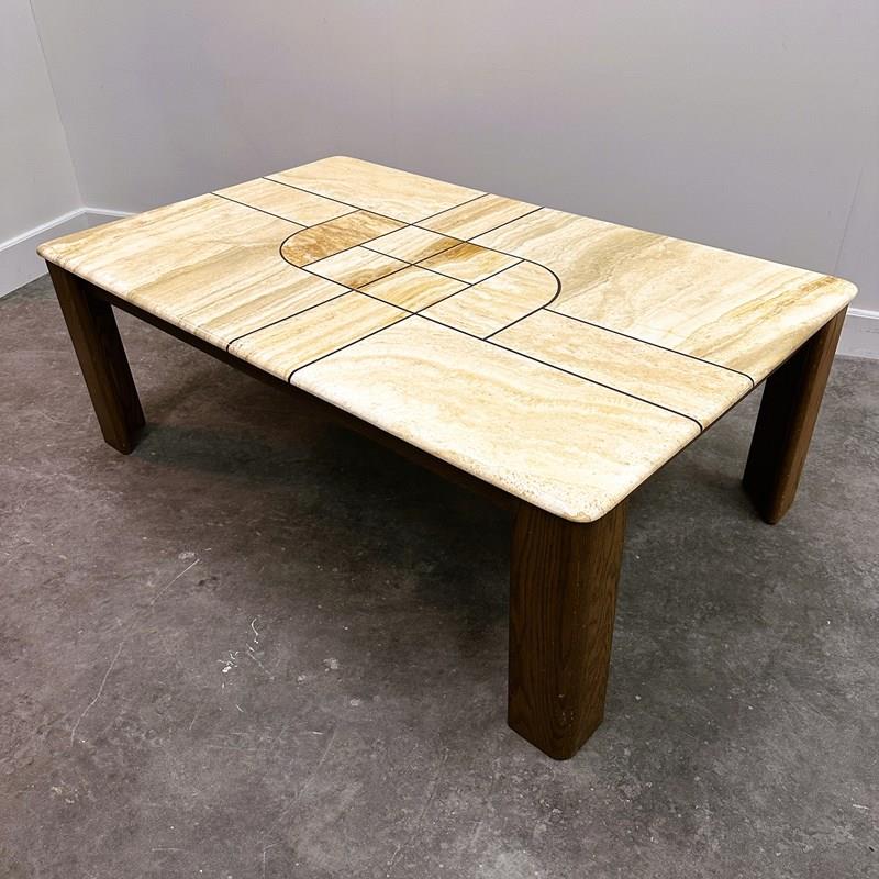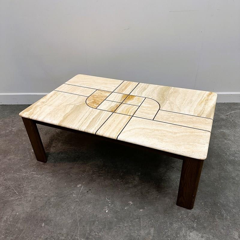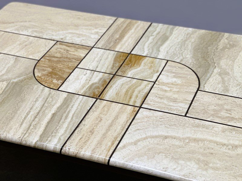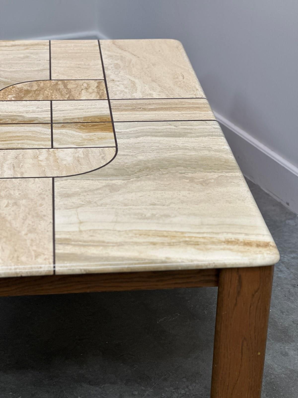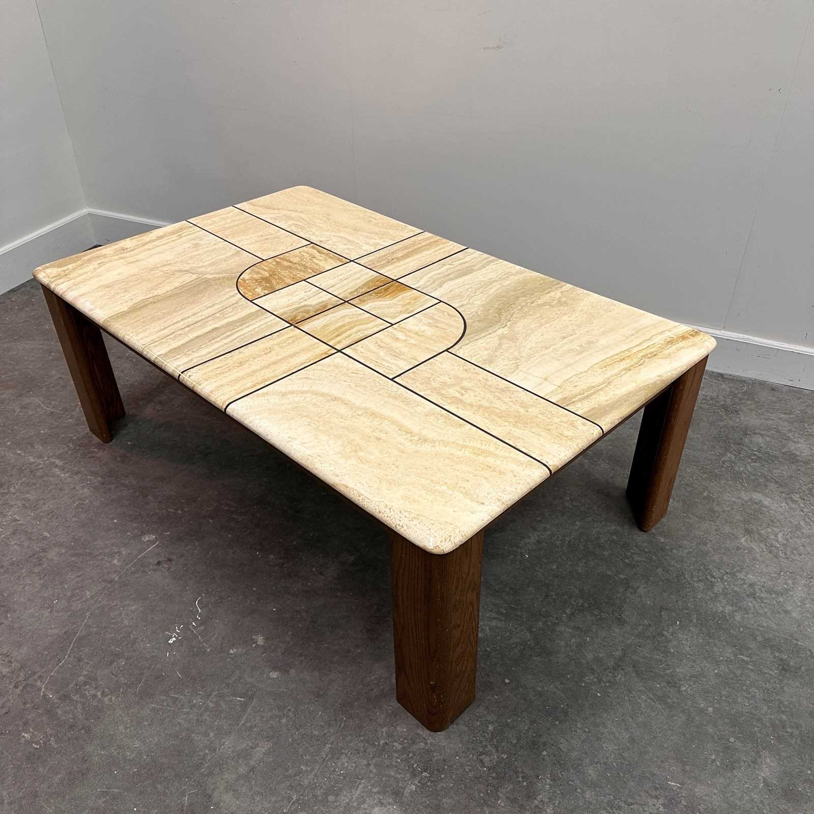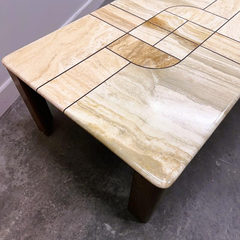 Large 1970s Travertine Coffee Table with Graphic Sculptural Inlay Top and Solid Wood Base