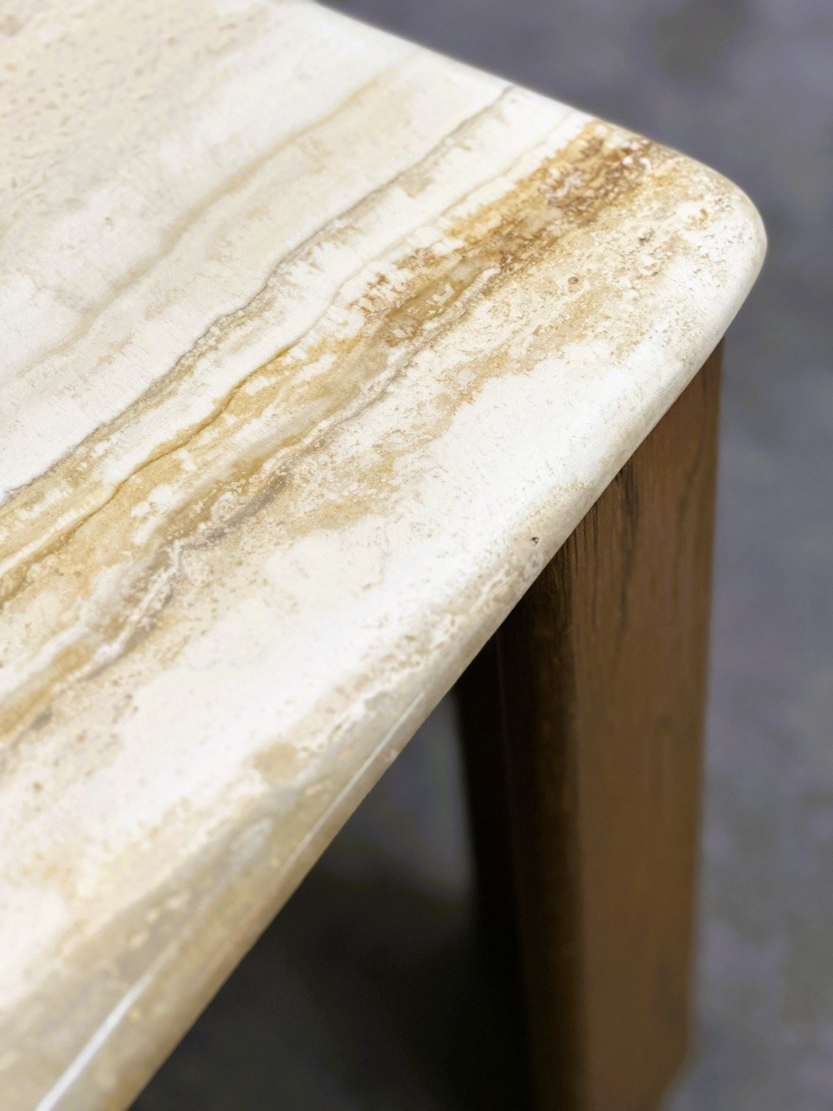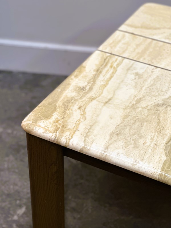 CONDITION: Very good vintage condition with minor age-related wear consistent with use; the travertine top shows natural veining, tonal variations, and light patina, which enhance its character without affecting its structure.