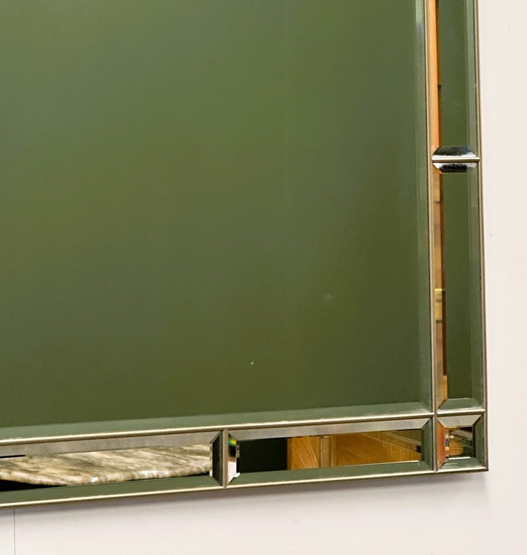 Perfectly in line with the glamorous Hollywood Regency and Space Age aesthetics, this piece was likely made in Italy during the height of the disco-era design movement. The angular top and bevelled mirrored borders add a sculptural quality, making it an exceptional statement for any interior — from luxurious dressing rooms to high-design entryways or bold bathrooms.