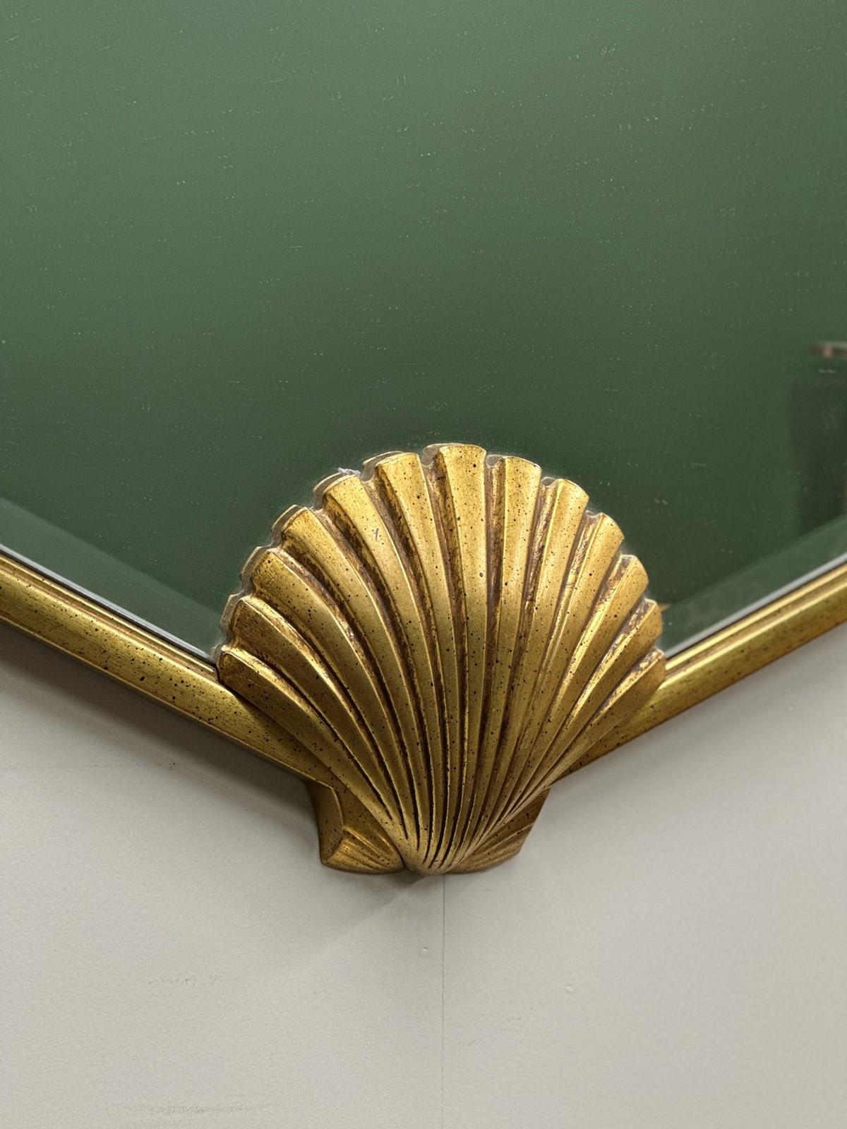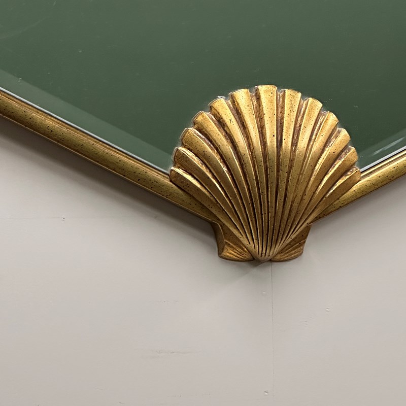A sculptural 1980s Deknudt mirror featuring an elegant fan-shaped silhouette in deep green glass, beautifully framed with a refined gilded edge. At the base sits a striking cast shell ornament — a signature decorative element often seen in Deknudt’s more expressive designs.