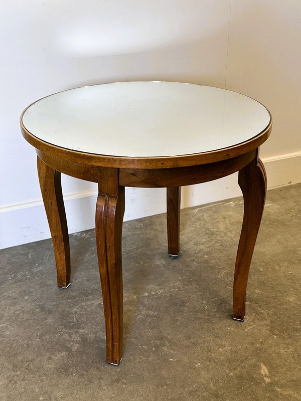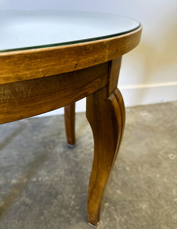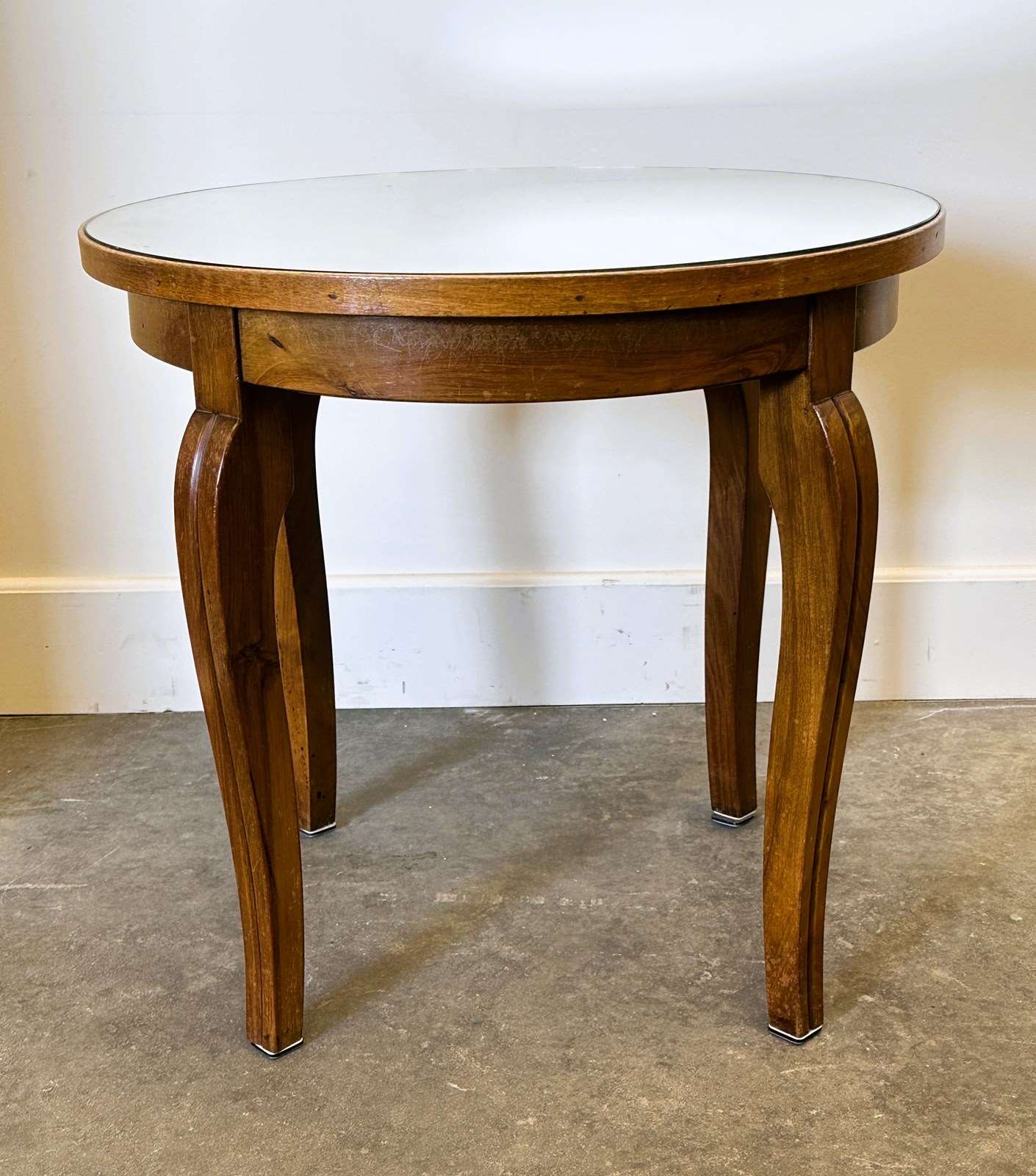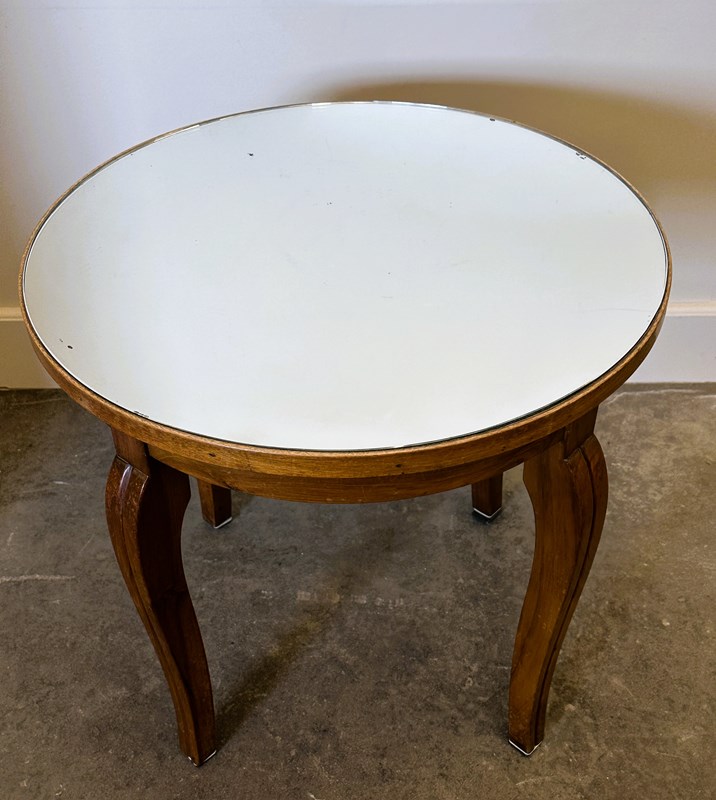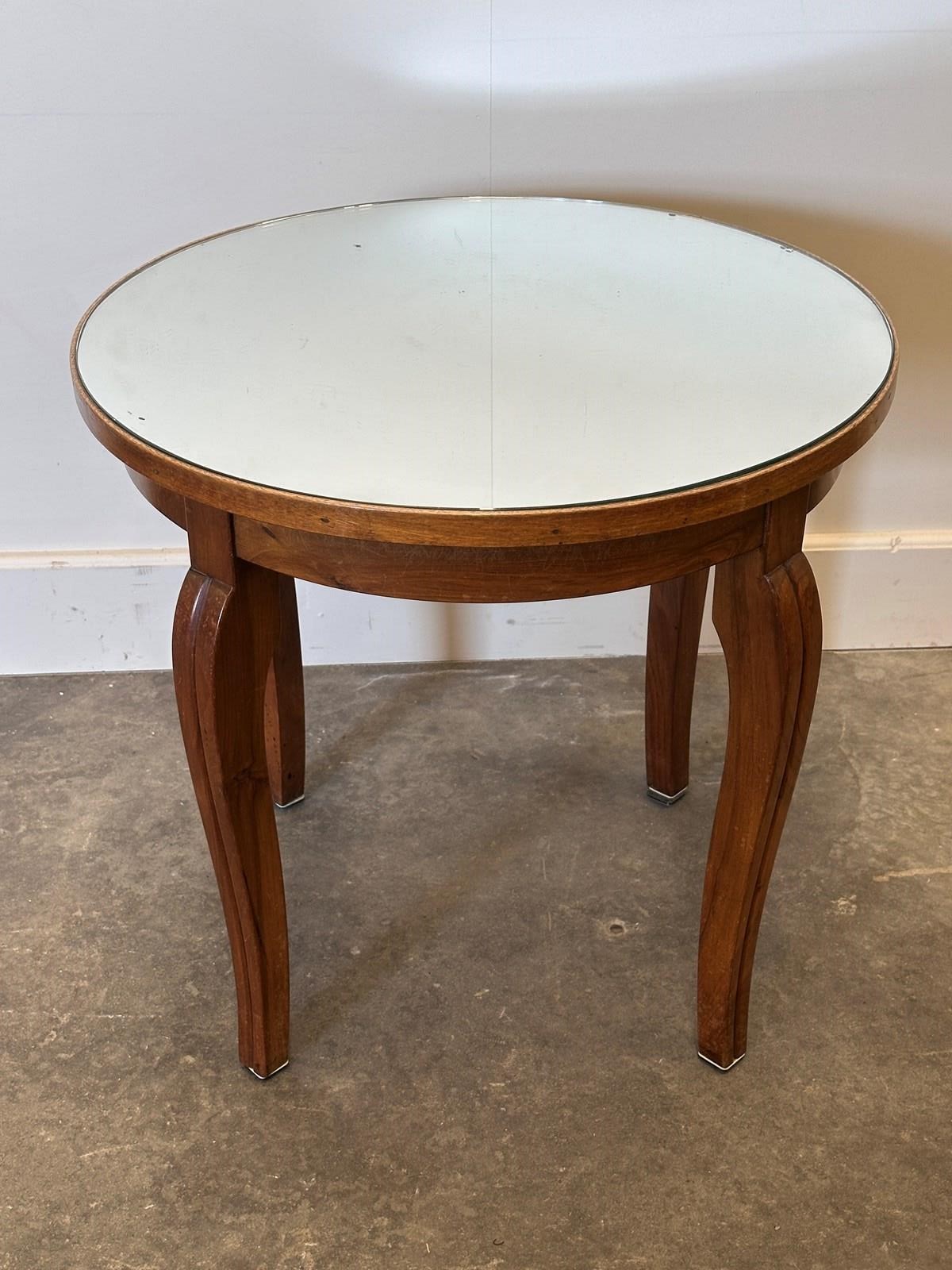 This elegant French Art Deco side table from the 1930s features a solid wooden frame with beautifully curved cabriole legs and a round mirrored top. The mirrored surface adds a touch of glamour, while the warm wood structure reflects the refined craftsmanship of French Art Deco design.Compact yet striking, this versatile table can be used as a side table, coffee table, or accent piece. Its timeless combination of understated luxury and functionality makes it a chic addition to both period and contemporary interiors.Dimensions (approx.): 61 × 61 × 57 cm (W × D × H)Condition: Good vintage condition with light wear and patina consistent with age and use.Note to UK buyers, NO import taxes and FREE SHIPPING to Greater London and The South East Of England. For other locations please ask for shipping price. Thank You. Nathalie.Please ask for delivery quote (shipping prices vary from country to country and are difficult to get precise) so we can search the best shipping price for you. french art deco table, vintage side table, art deco coffee table, mirrored top table, 1930s french table, antique accent table, cabriole leg table, vintage round table, french deco furniture, wood and glass table, 1930s side table, retro french table, vintage art deco