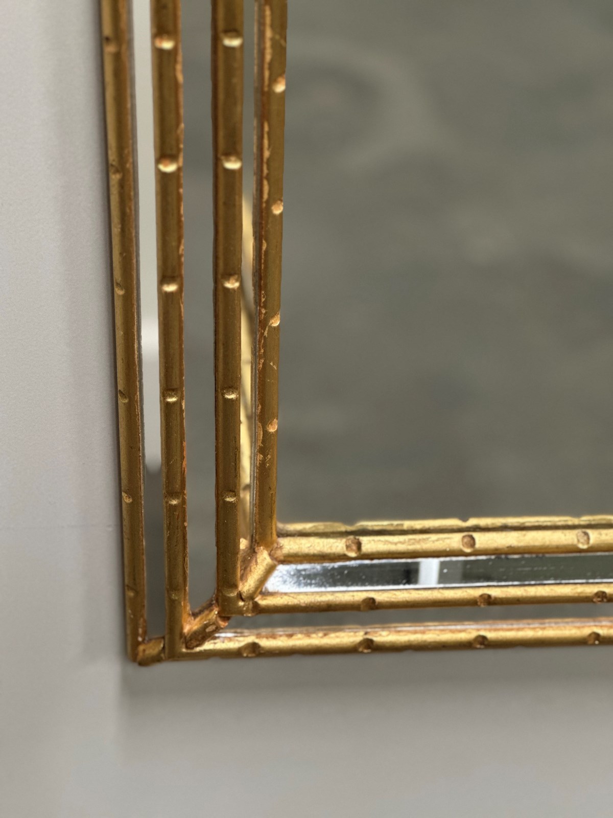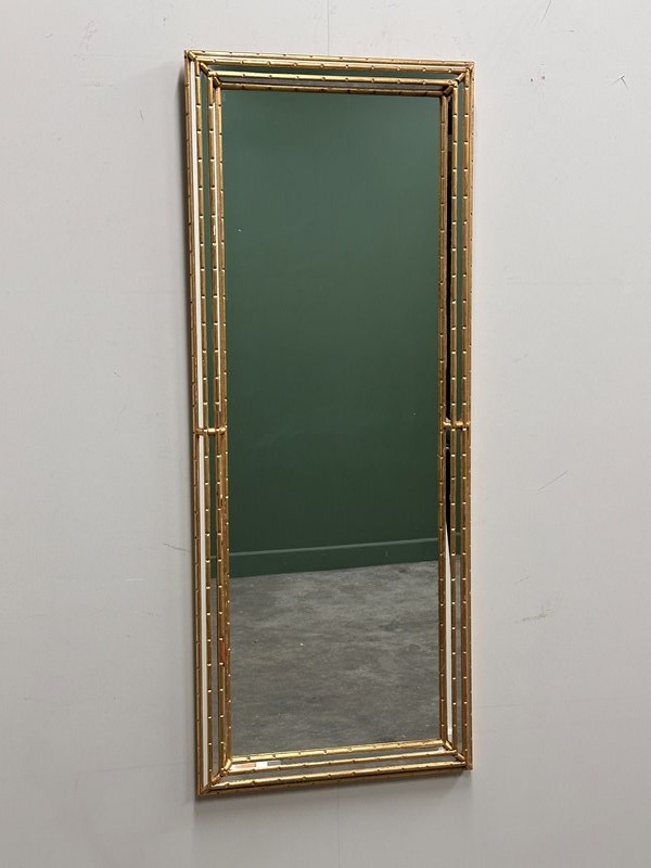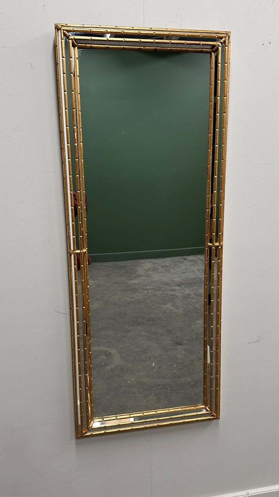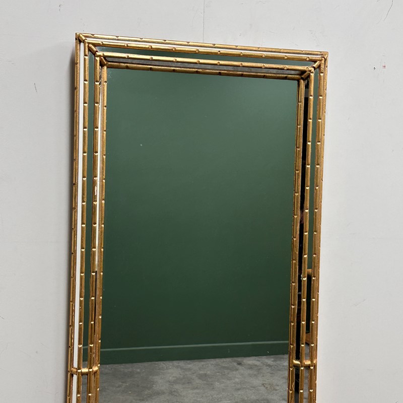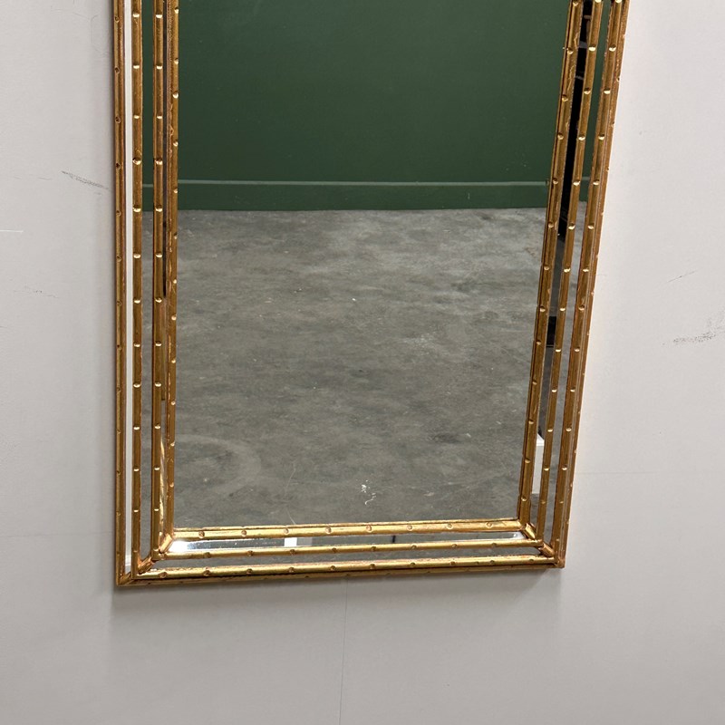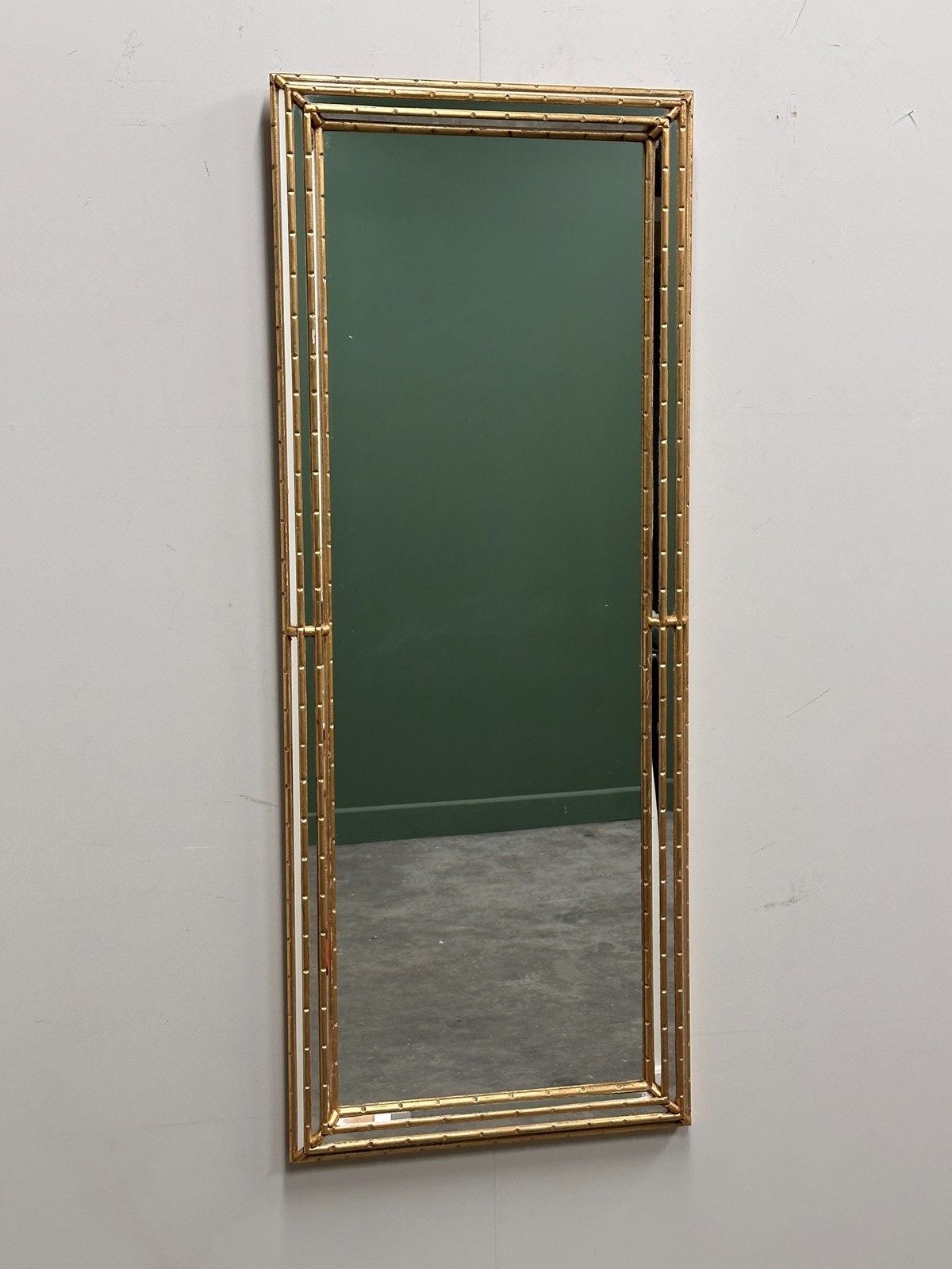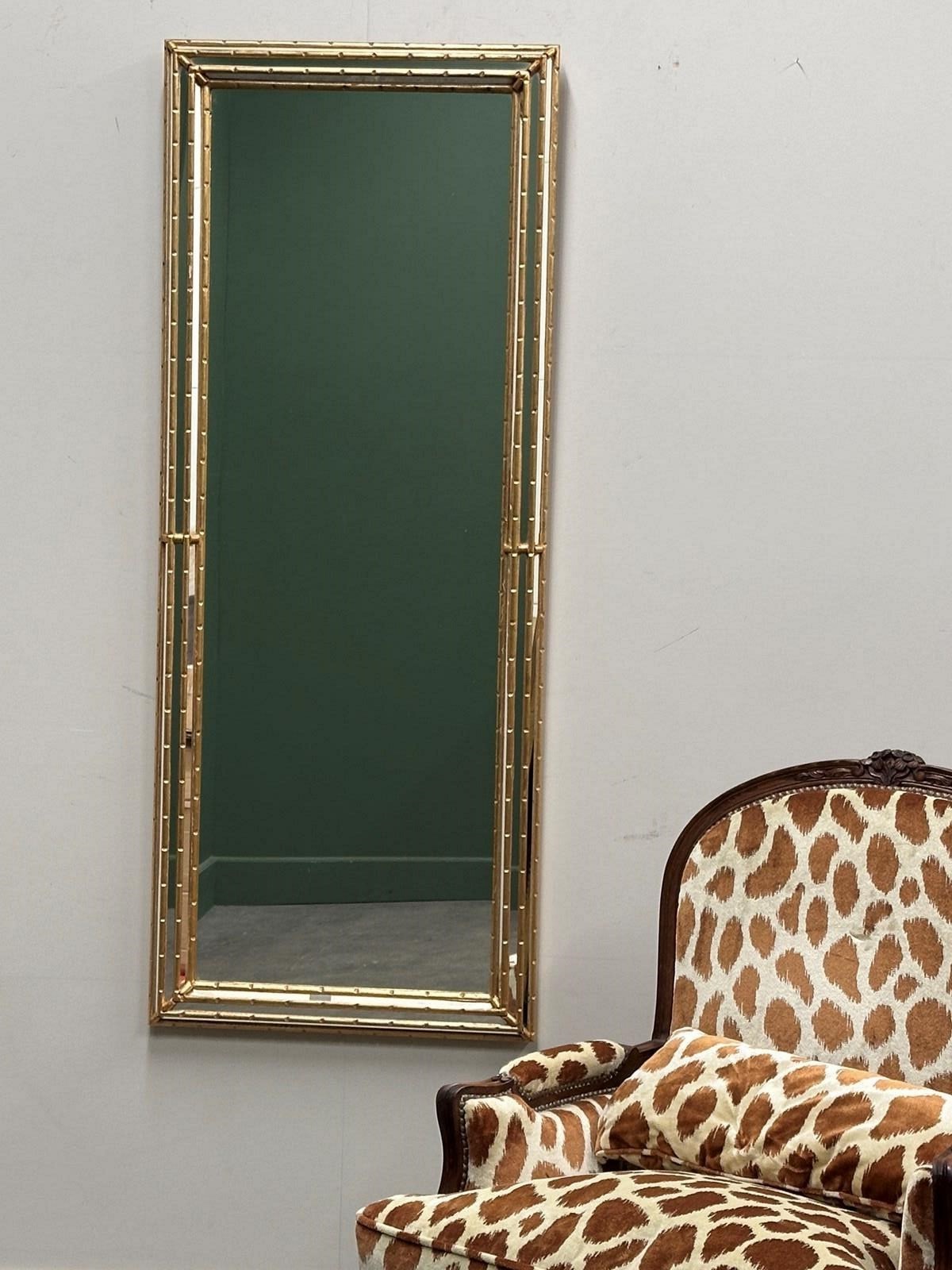 A refined 1970s Italian faux-bamboo mirror featuring a triple-layer gilt frame with beautiful textured detailing. The elongated rectangular format (146 cm high) gives the piece an elegant vertical presence, while the bamboo-inspired structure adds both warmth and a subtle touch of Hollywood Regency glamour.