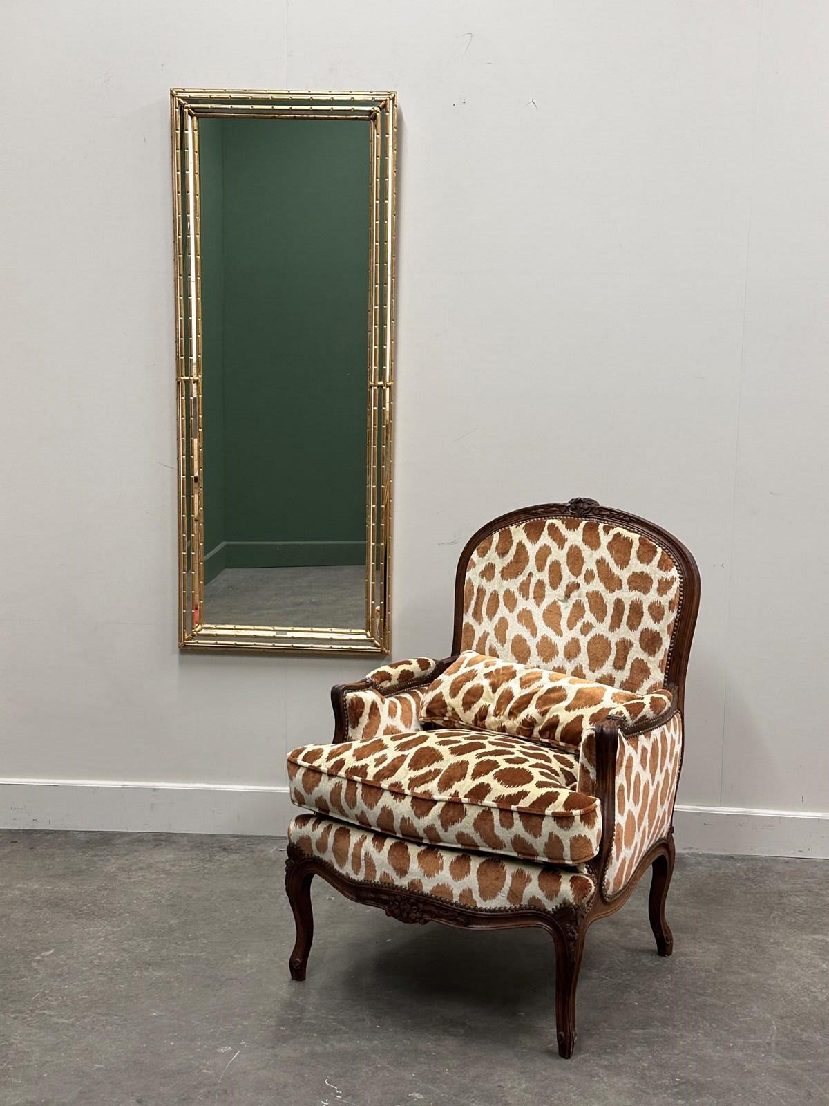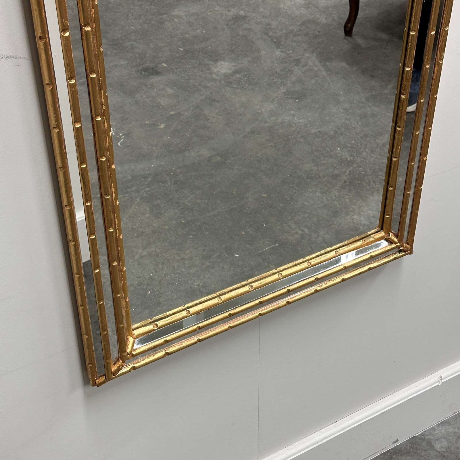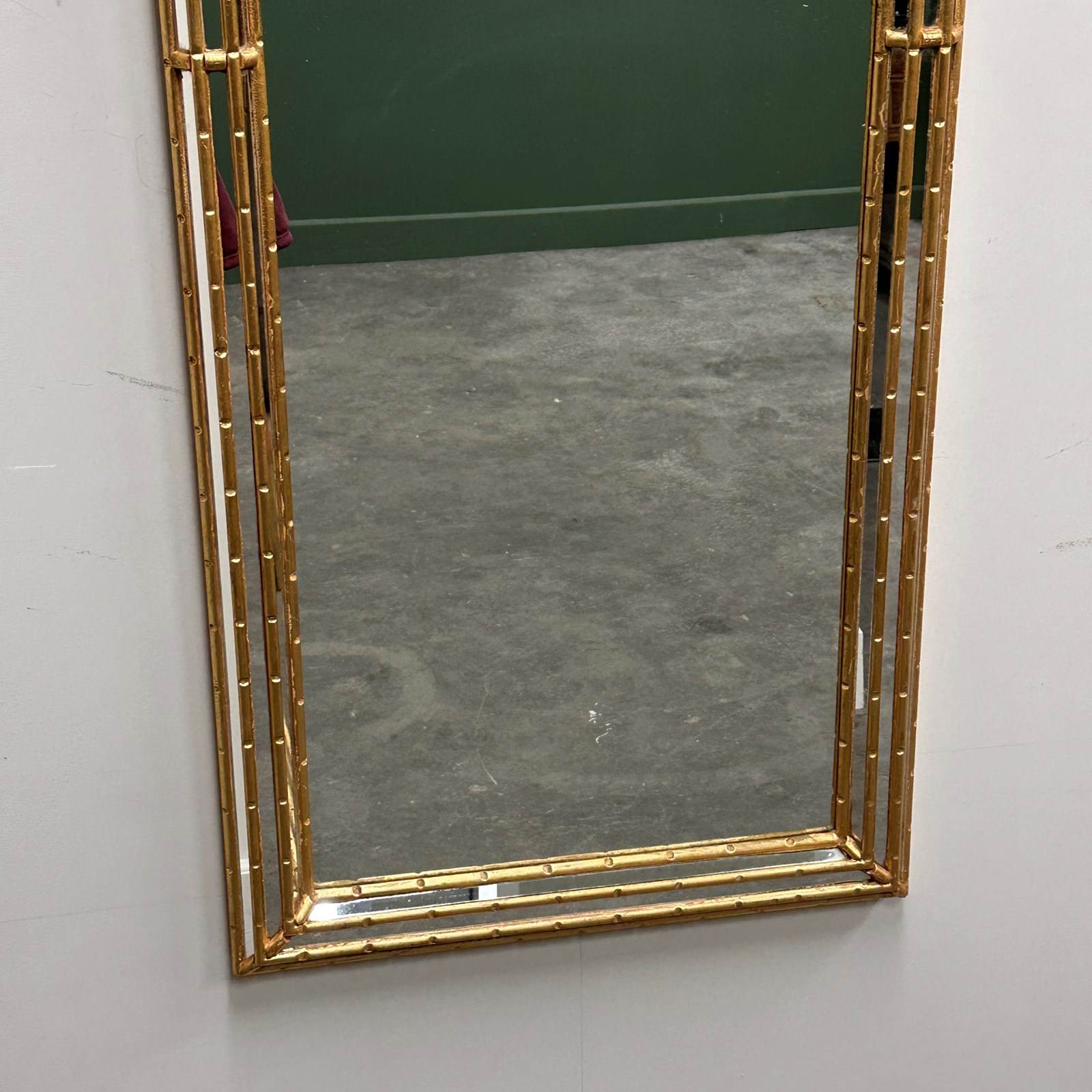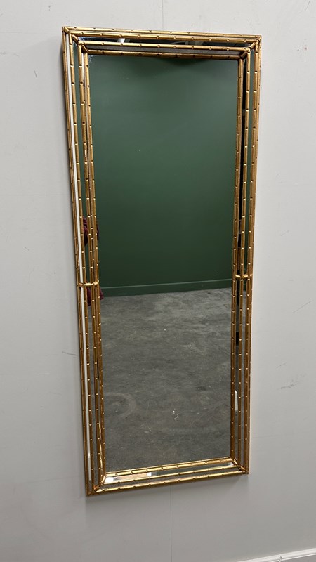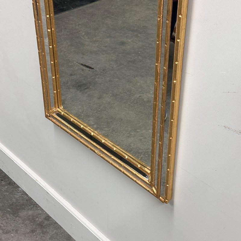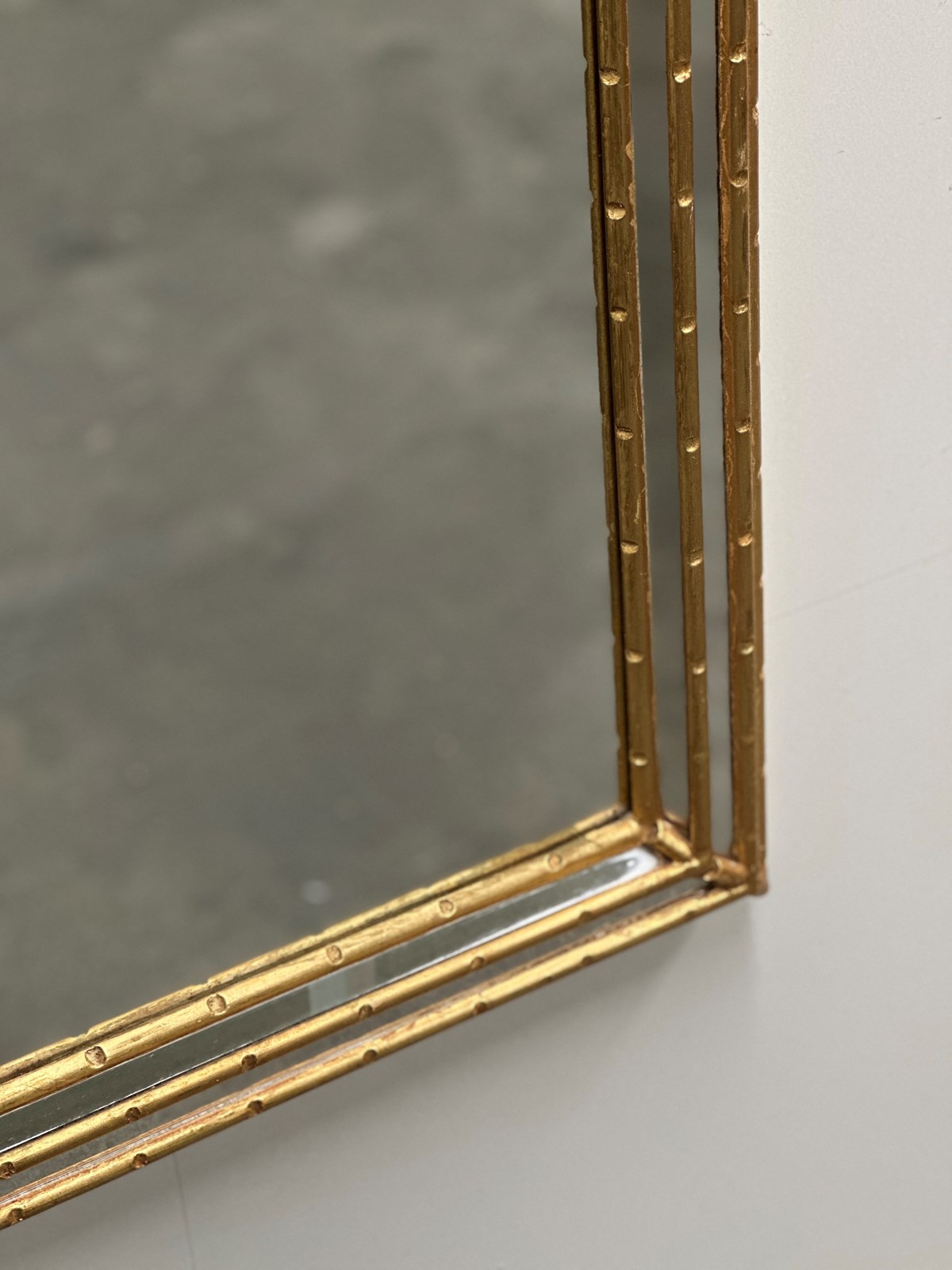 A refined 1970s Italian faux-bamboo mirror featuring a triple-layer gilt frame with beautiful textured detailing. The elongated rectangular format (146 cm high) gives the piece an elegant vertical presence, while the bamboo-inspired structure adds both warmth and a subtle touch of Hollywood Regency glamour.