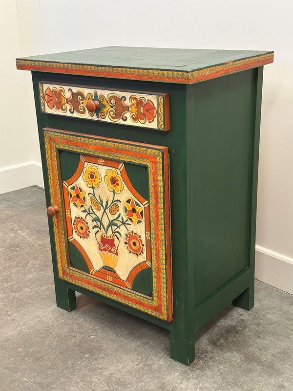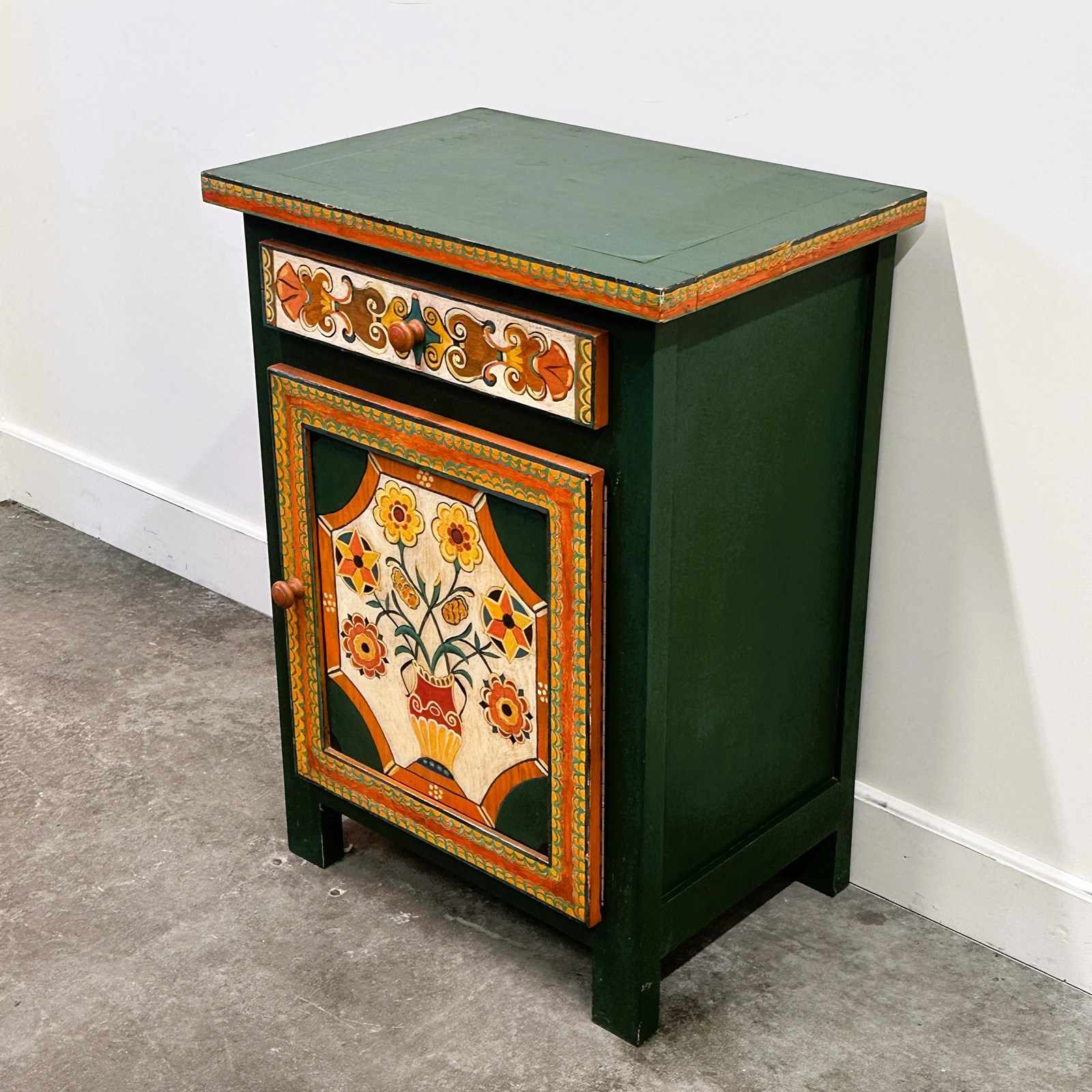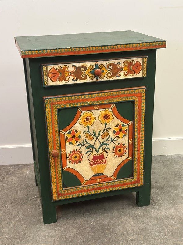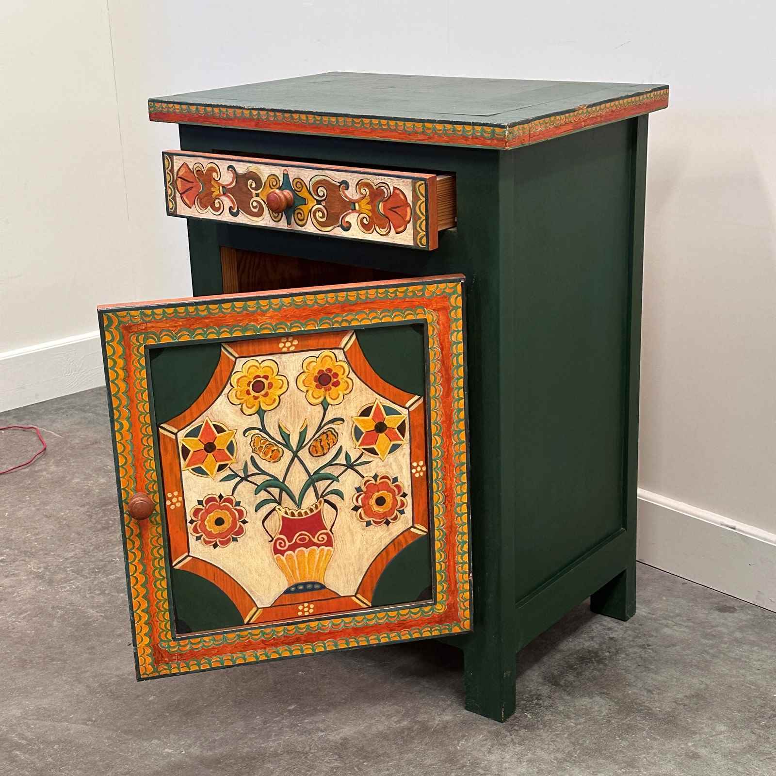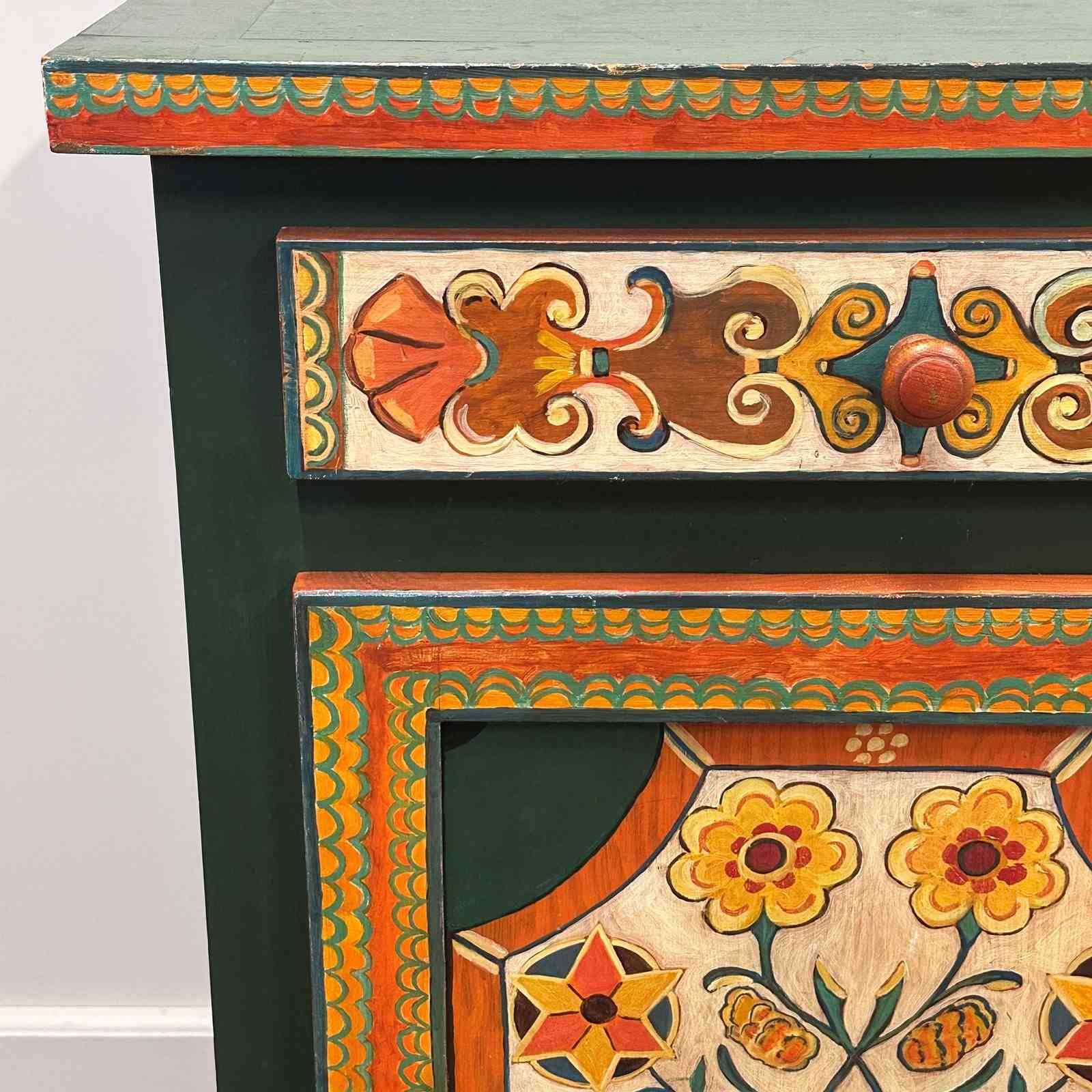 The front panel features a traditional stylised vase with flowers, framed by geometric and scrolling motifs inspired by Southern French decorative arts. The drawer and door are individually hand-painted, showing the subtle irregularities and brushwork that confirm its artisanal origin.