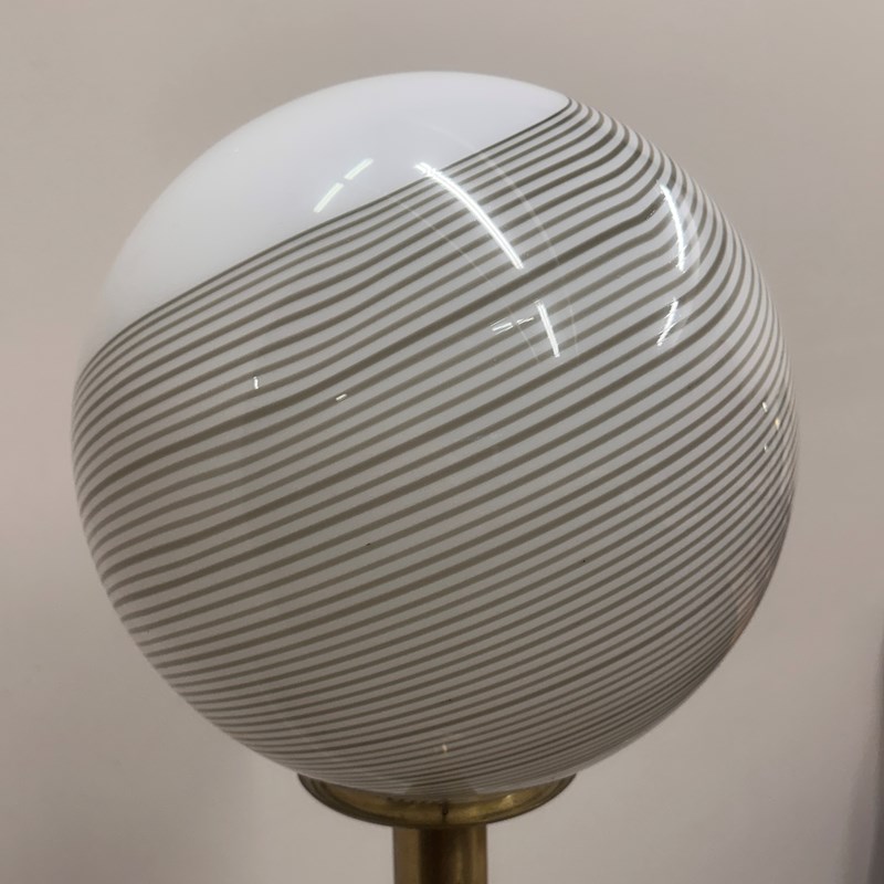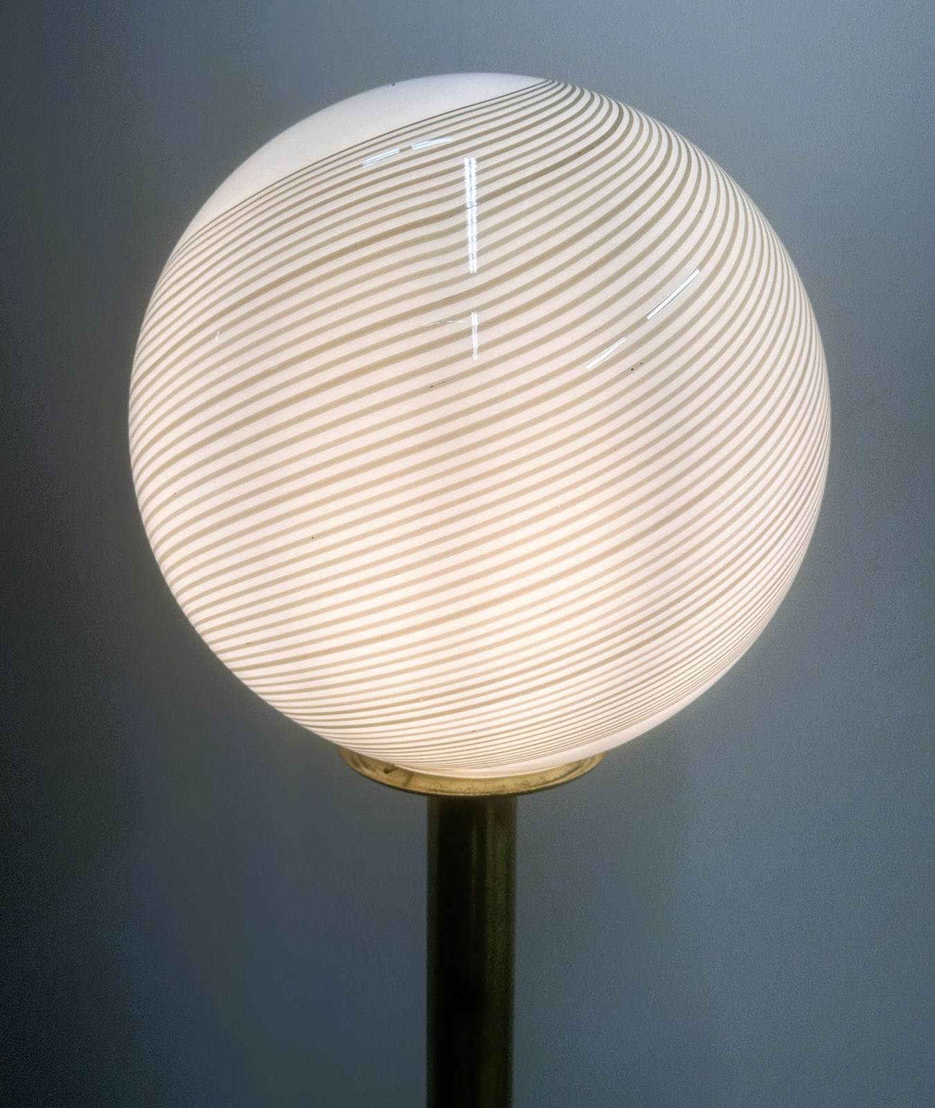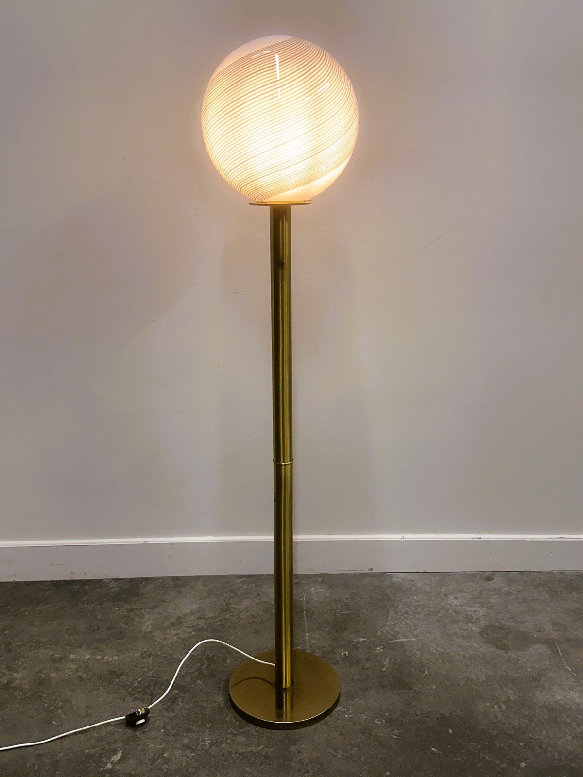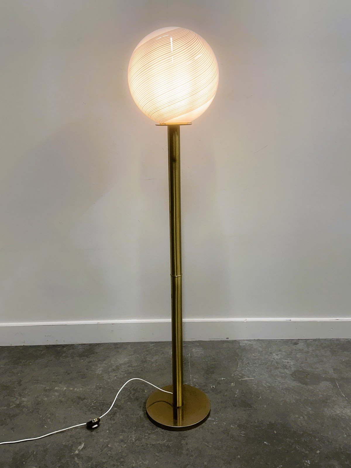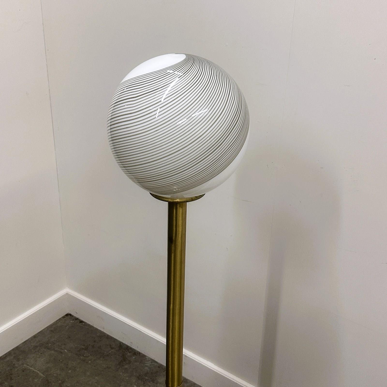 Elevate your interior with this large 1970s Italian floor lamp, featuring a hand-blown Murano glass globe with an elegant swirled line pattern, resting on a sleek brass column that brings instant sophistication to any room.