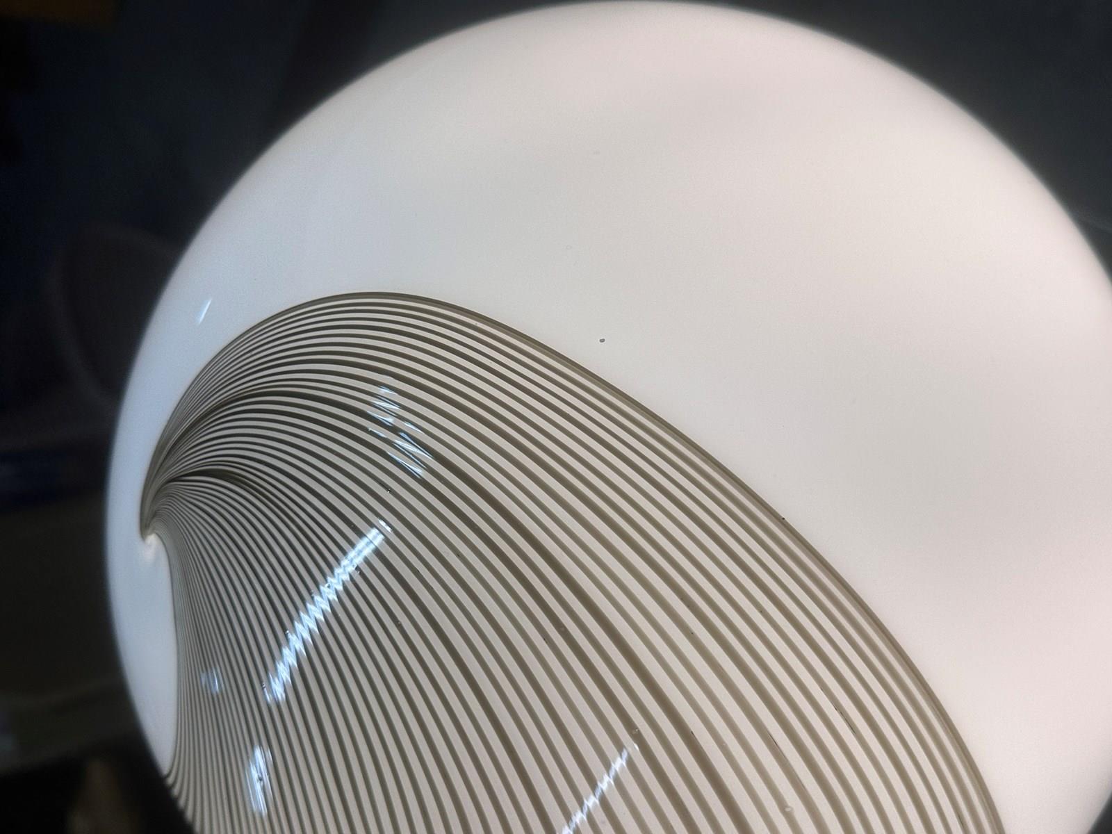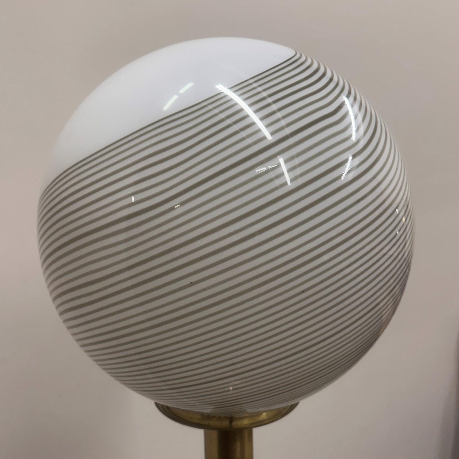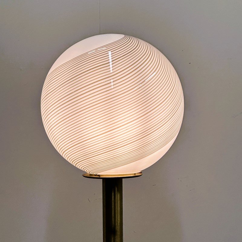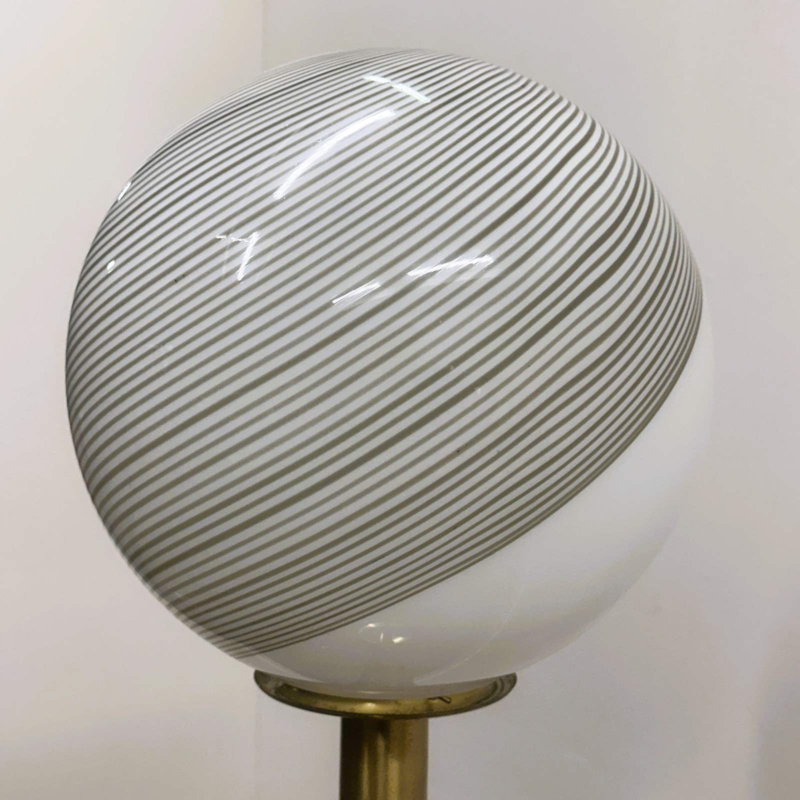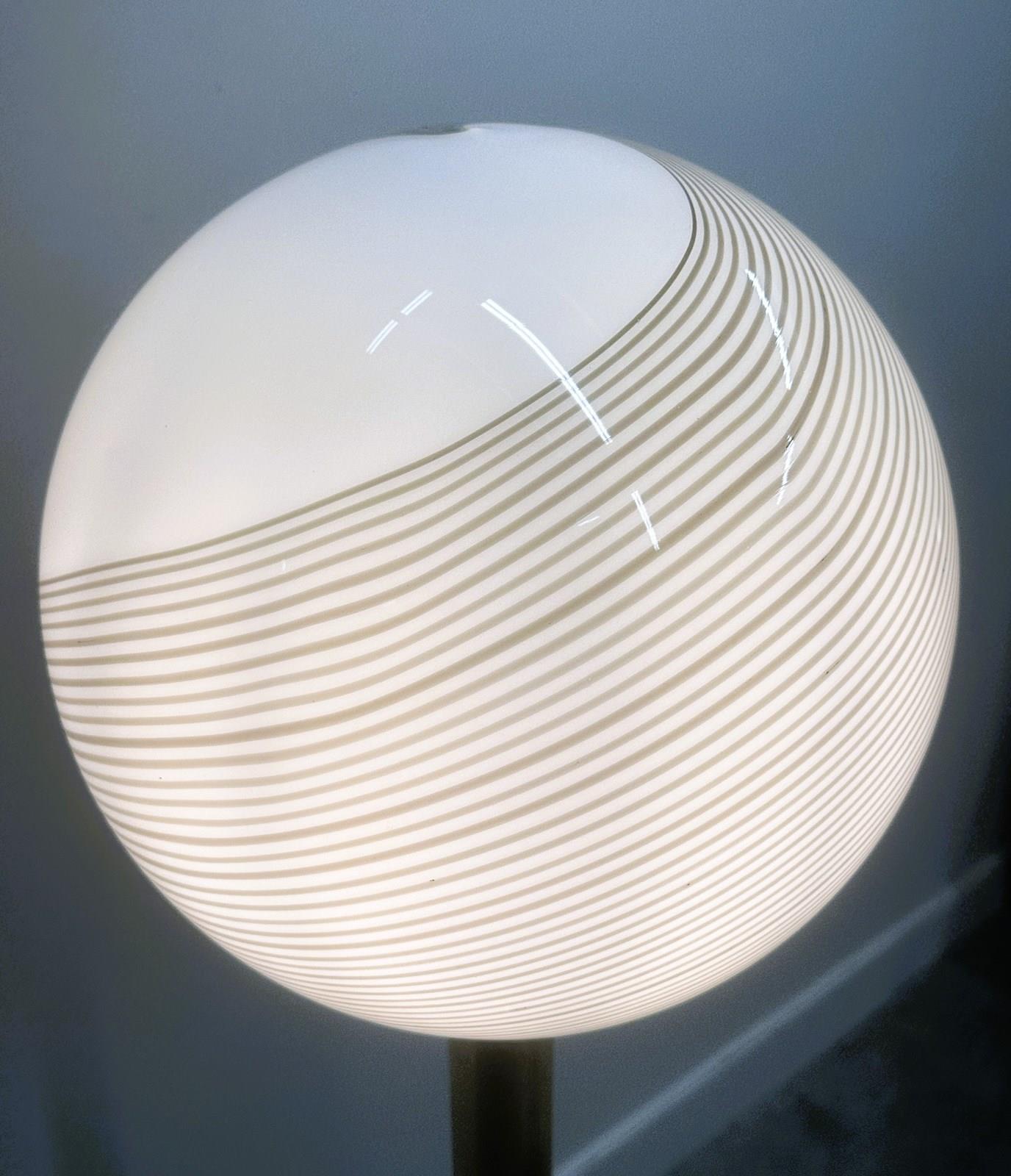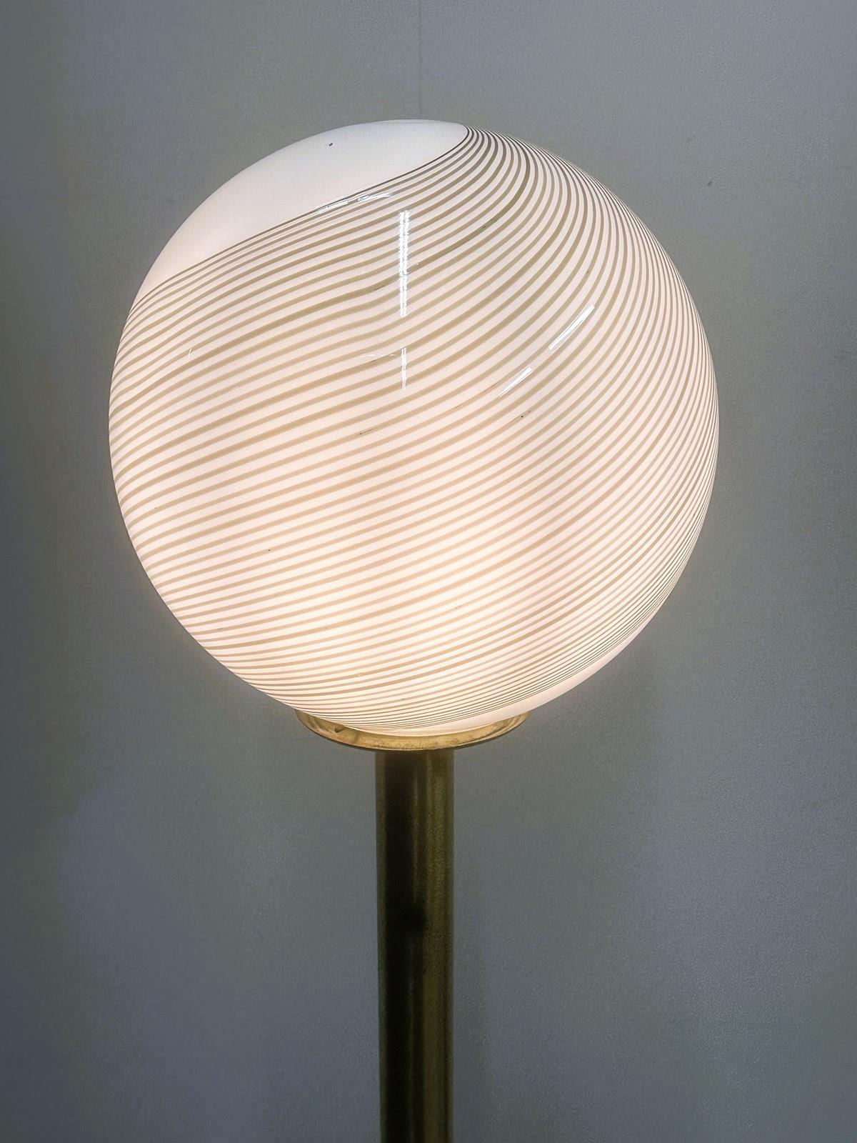 Elevate your interior with this large 1970s Italian floor lamp, featuring a hand-blown Murano glass globe with an elegant swirled line pattern, resting on a sleek brass column that brings instant sophistication to any room.