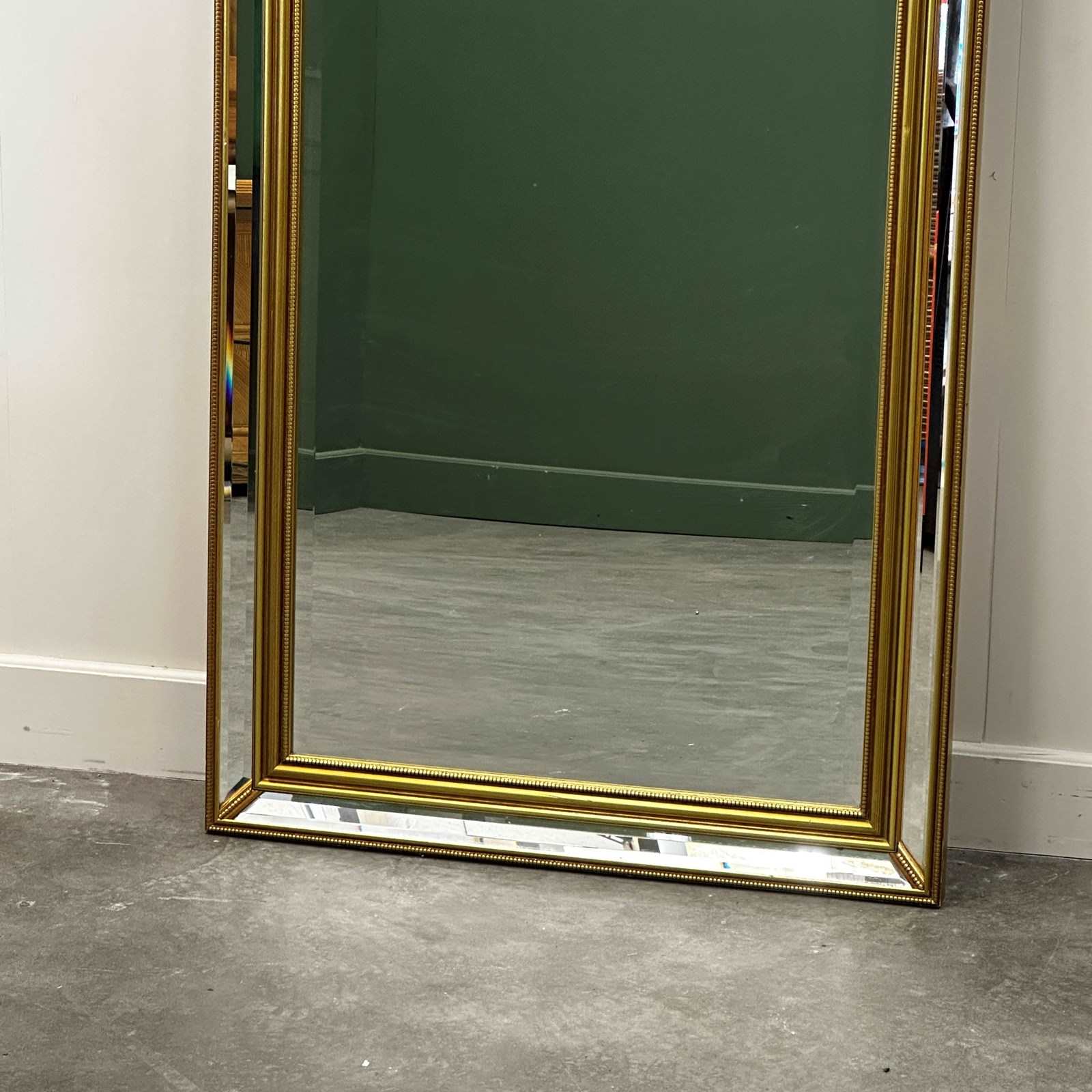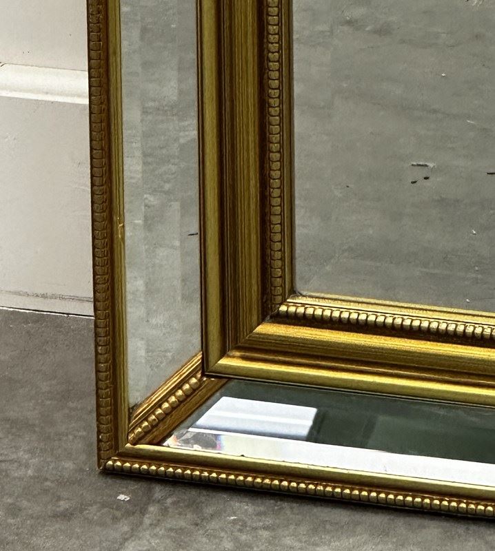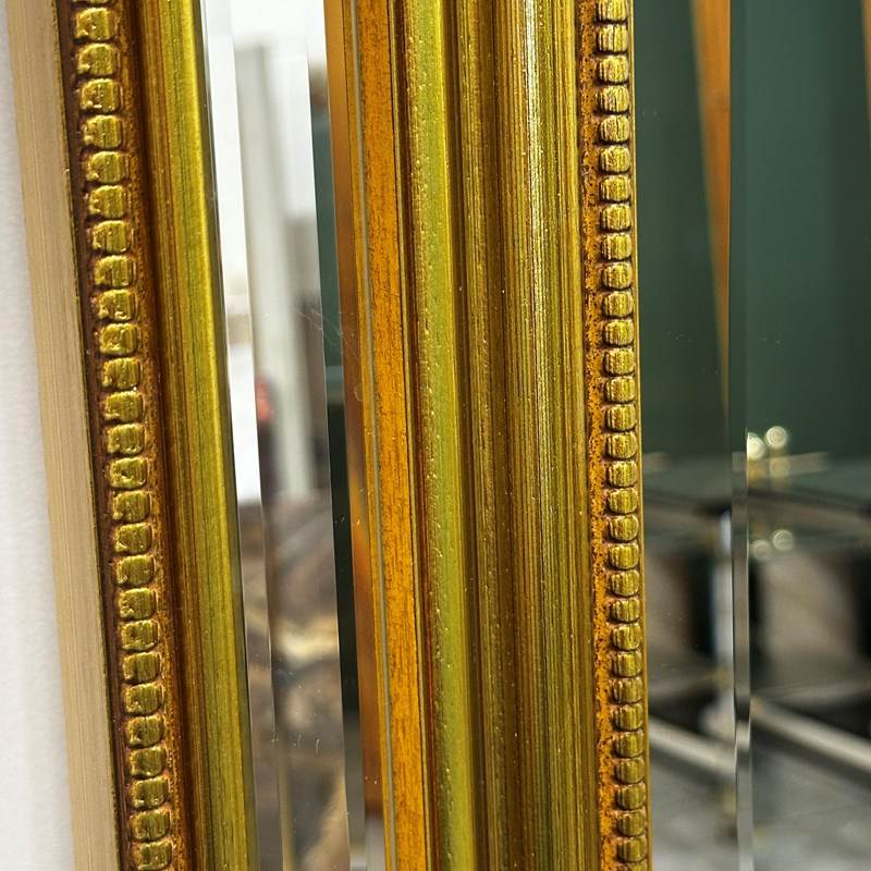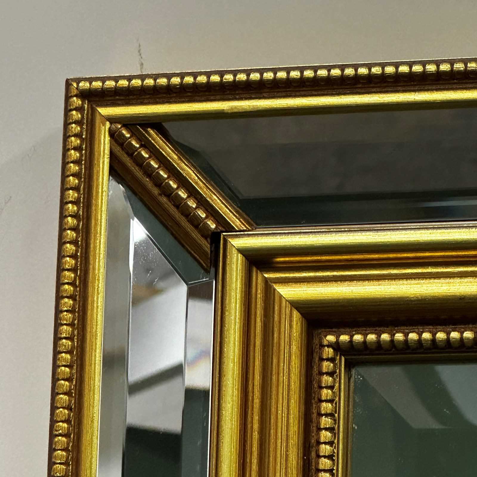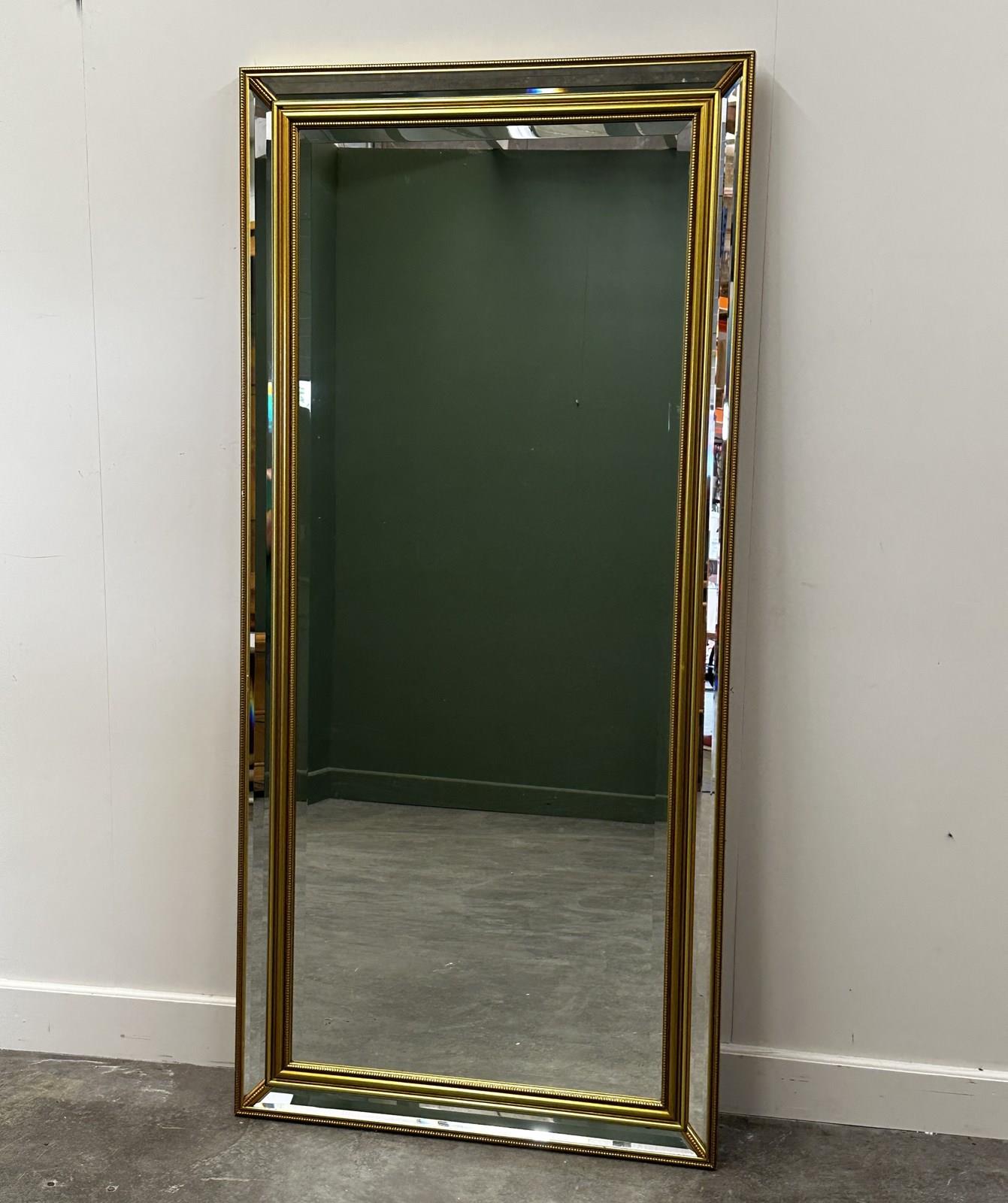 This stunning large wall mirror features a richly detailed giltwood frame with deep relief carving, typical of 1980s French decorative arts. The frame showcases a layered design with delicate beaded inner trim and wide beveled mirrored borders that reflect light beautifully from every angle. The elegant gold leaf finish adds a luxurious warmth, while the impressive scale makes it perfect for grand entryways, bedrooms, or dressing rooms. A versatile piece that works equally well in classical interiors or bold contemporary spaces seeking a touch of Parisian flair.