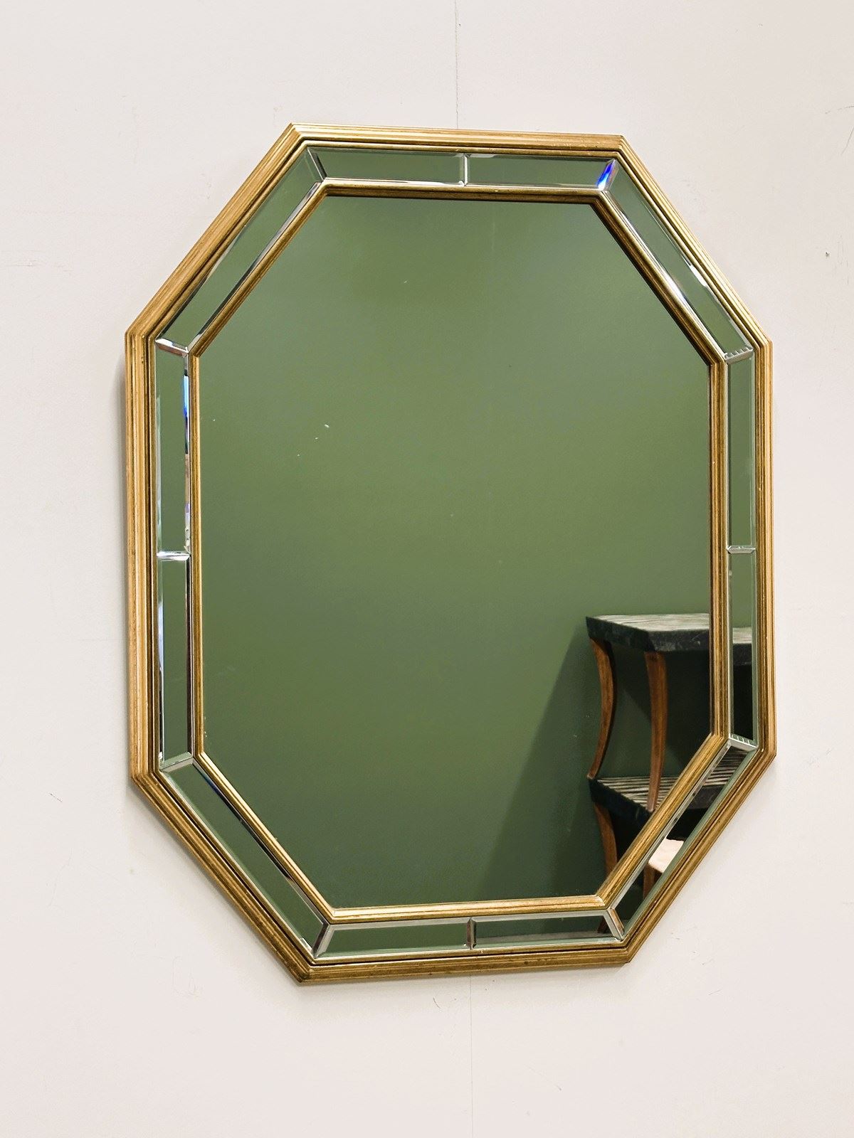 This beautifully crafted mirror features a gilded frame with individually bevelled mirror panels that catch and reflect the light with refined brilliance. The geometric octagonal form adds a sculptural presence, while the golden tones of the frame bring warmth and understated elegance.