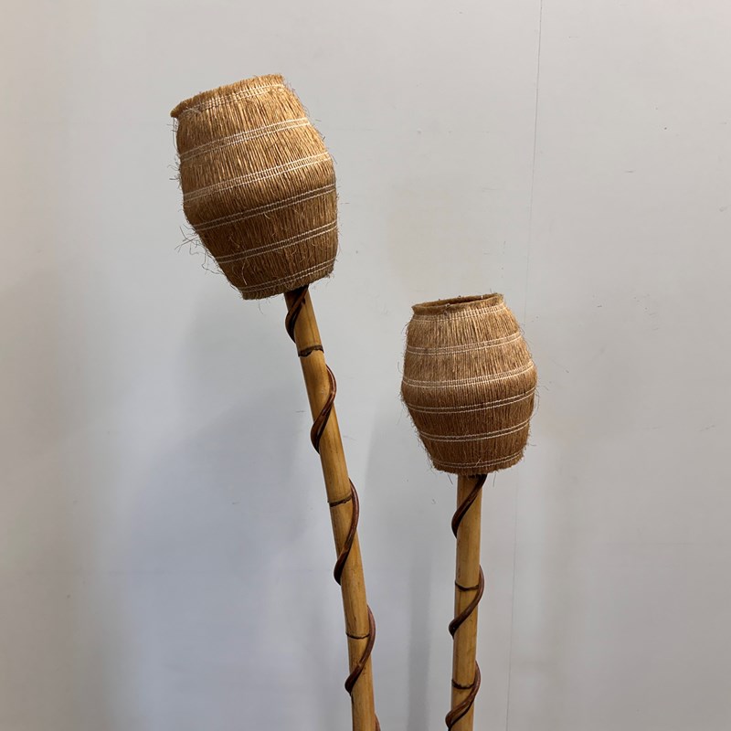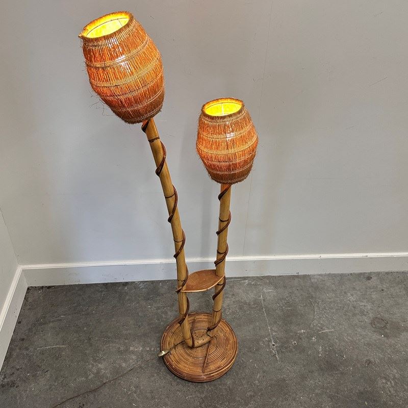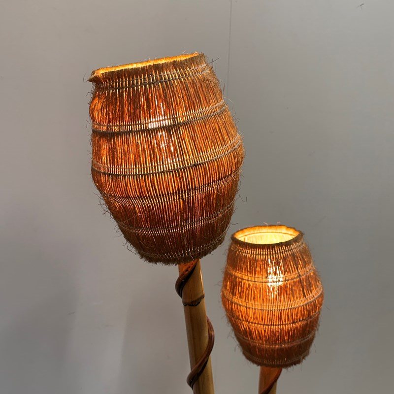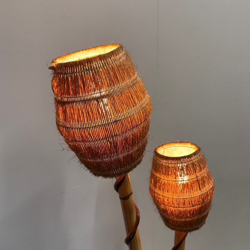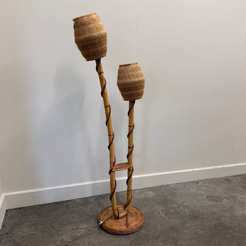 This rare piece embodies Sognot’s signature organic modernism — a harmonious balance of natural materials, movement, and light. The lamp features two woven wicker shades mounted on elegantly twisted rattan stems that rise from a circular coiled rattan base, creating a sense of rhythm and natural flow.