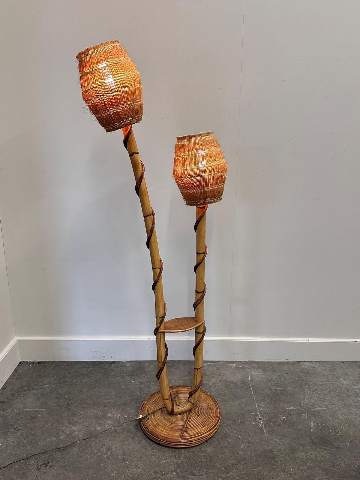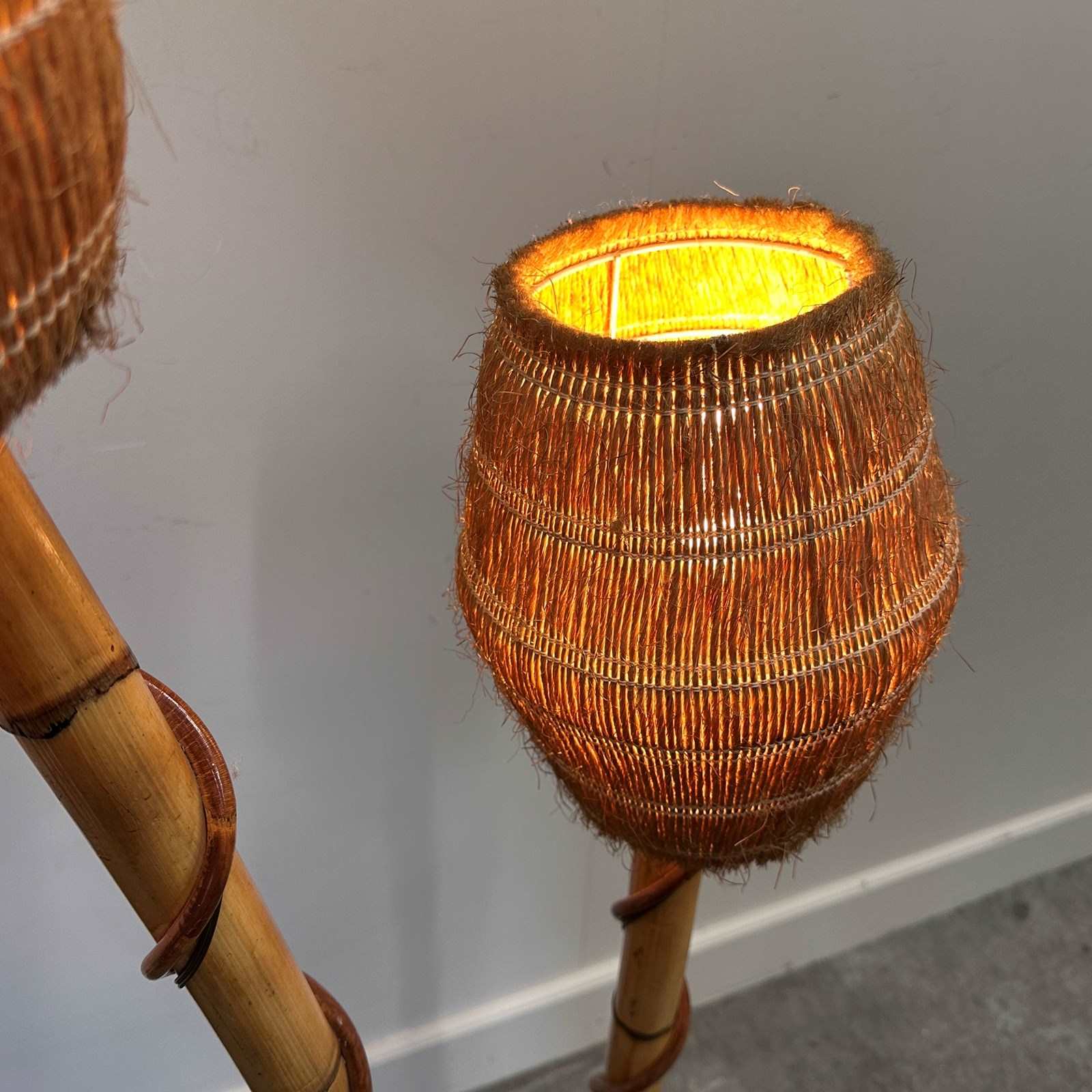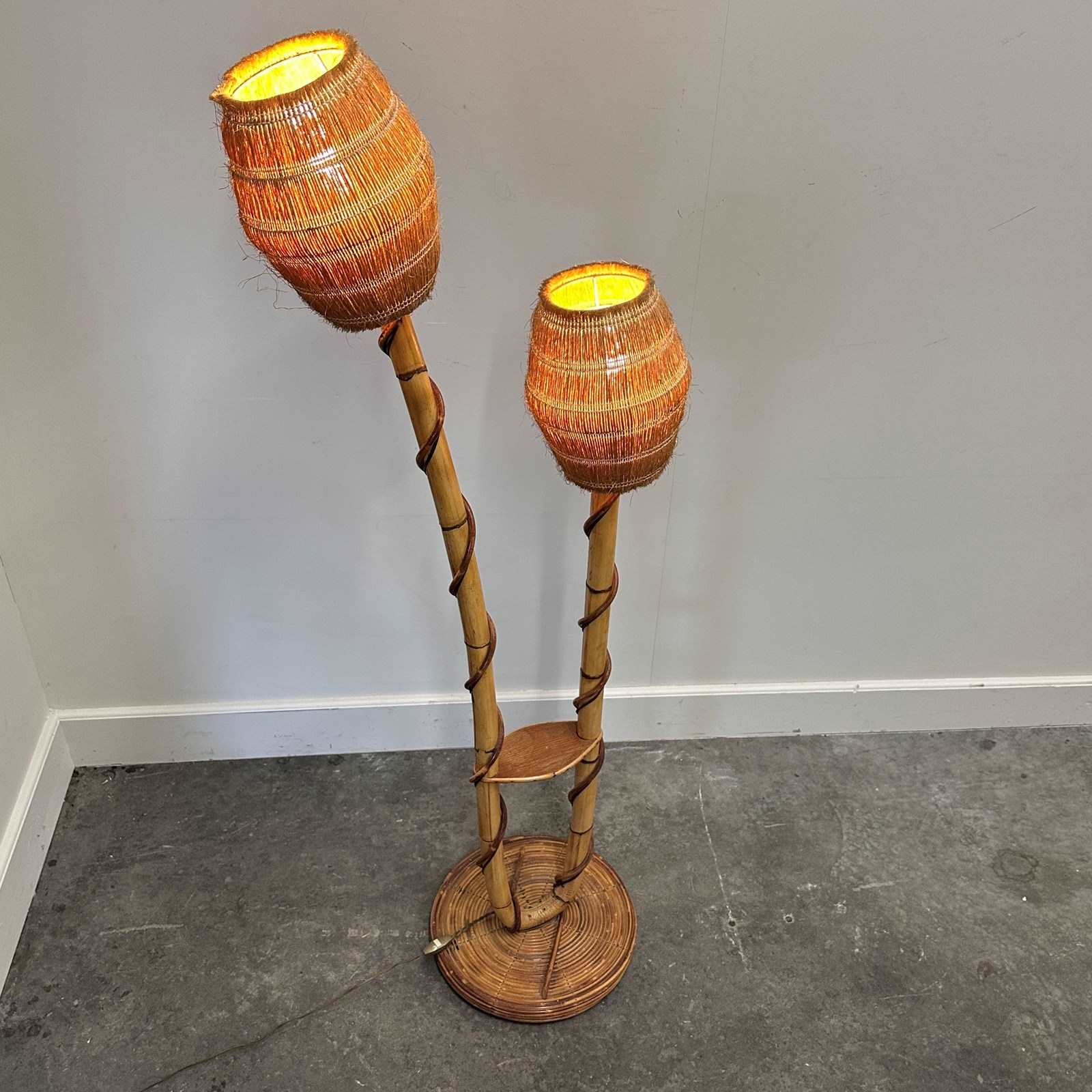 This rare piece embodies Sognot’s signature organic modernism — a harmonious balance of natural materials, movement, and light. The lamp features two woven wicker shades mounted on elegantly twisted rattan stems that rise from a circular coiled rattan base, creating a sense of rhythm and natural flow.