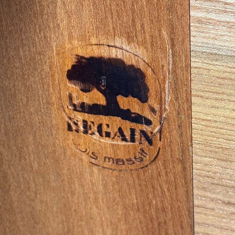 This striking sideboard by Maison Regain, crafted in France during the 1970s, showcases the brand’s signature dedication to craftsmanship in solid elm wood. The piece features clean geometric lines with thick, squared edges and beautifully recessed handles integrated into the four front doors. The natural grain and warm honey tone of the elm highlight the minimalist yet robust design.