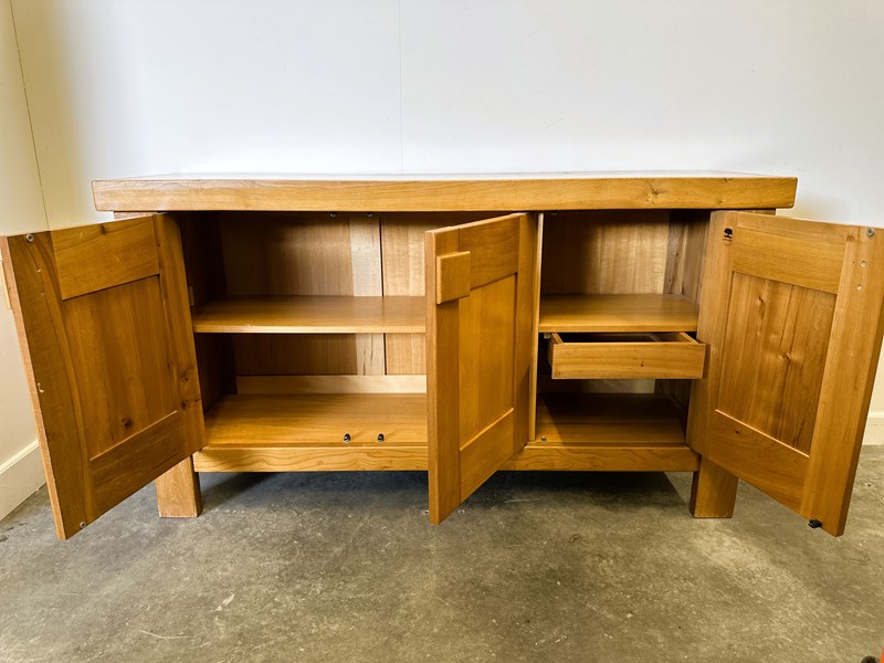 The sideboard opens to reveal ample storage with adjustable shelving and an internal drawer, making it as functional as it is sculptural. Its timeless aesthetic is strongly influenced by modernist and brutalist design, emphasizing authenticity of material and construction.