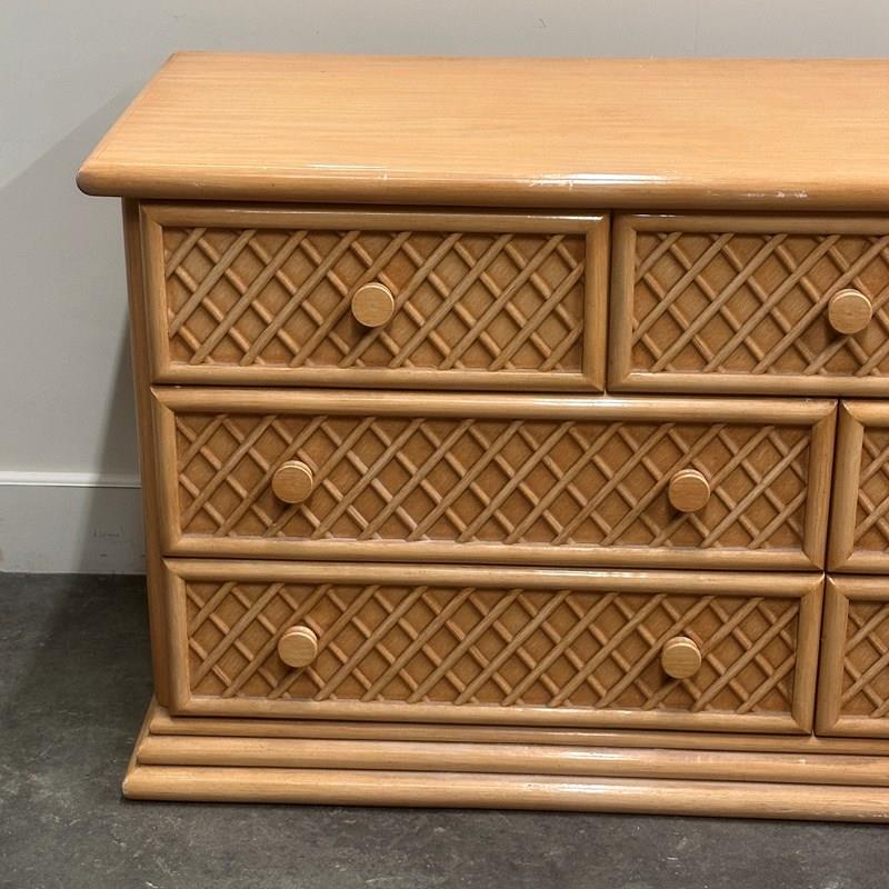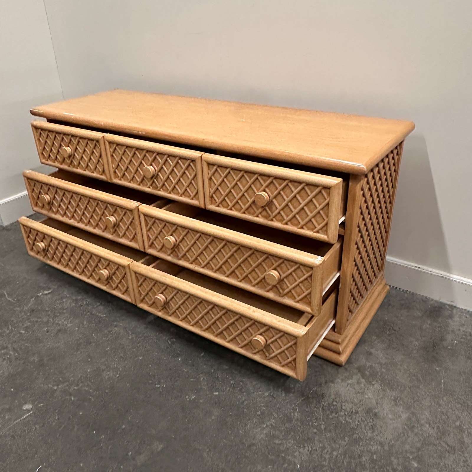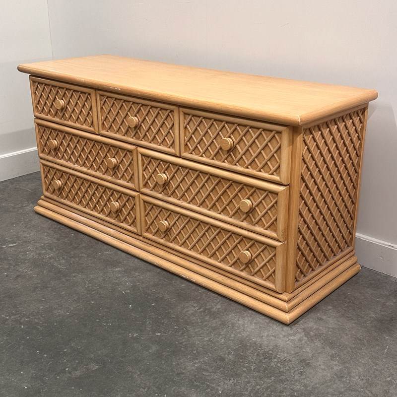 A beautifully crafted French dresser by Maugrion – Le Rotin Prestige, renowned for their luxurious artisanal rattan and solid-wood furniture. This large 8-drawer chest showcases their signature hand-crafted lattice faux rattan fronts, elegant rounded edges, and a warm blond finish that instantly elevates any bedroom, hallway, living room, or boutique interior. Its impressive scale combined with refined craftsmanship makes it a desirable and difficult-to-find example of 1980s French coastal design.