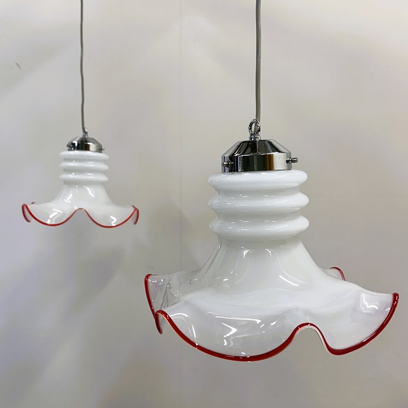 Pair Of Italian Murano Glass Pendant Lamps With Red Trim, 1970S Italy.
