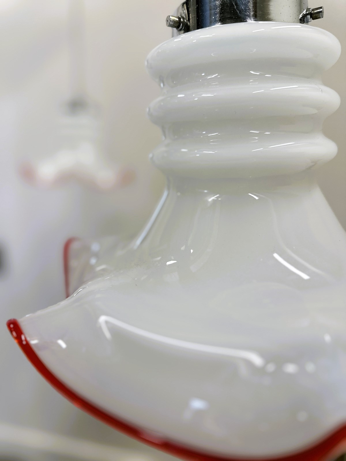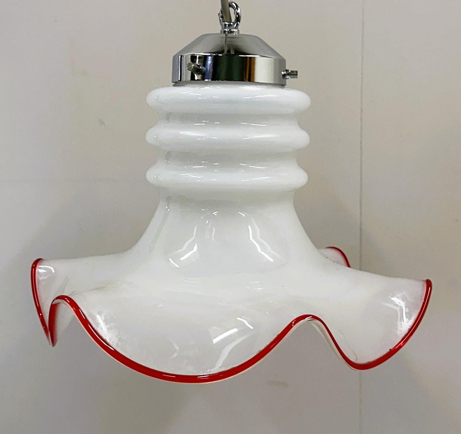 Murano pendant, Italian glass, Red rim lamp, Vintage lighting, Opaline glass, Retro pendant, 1970s design, Handblown glass, White chandelier, Venetian style, Chrome fixture, Kitchen pendant, Midcentury lamp