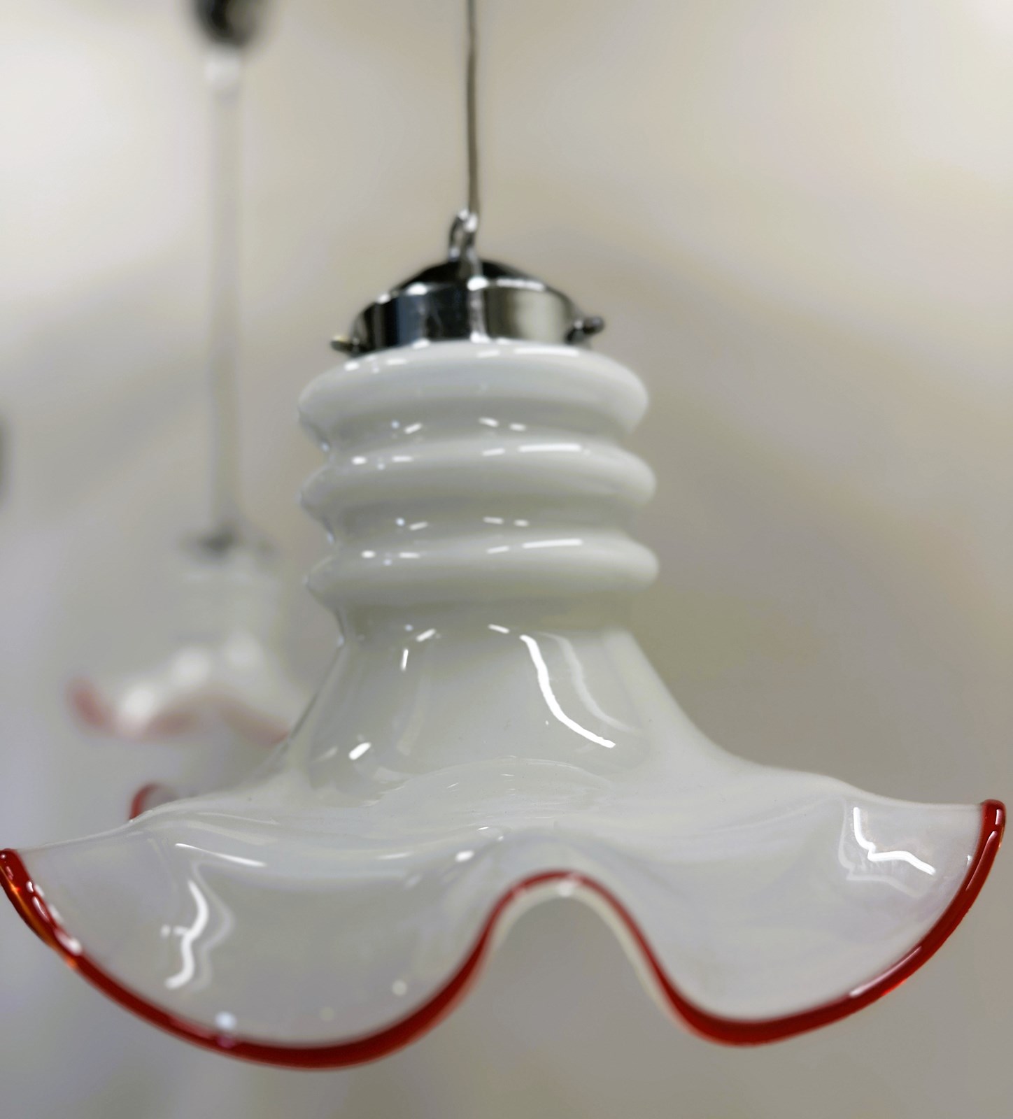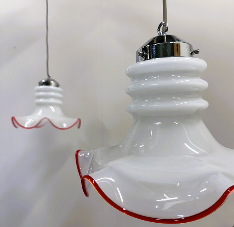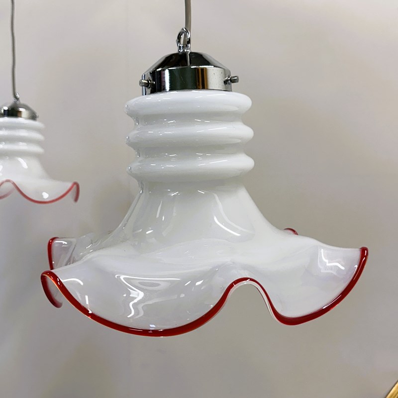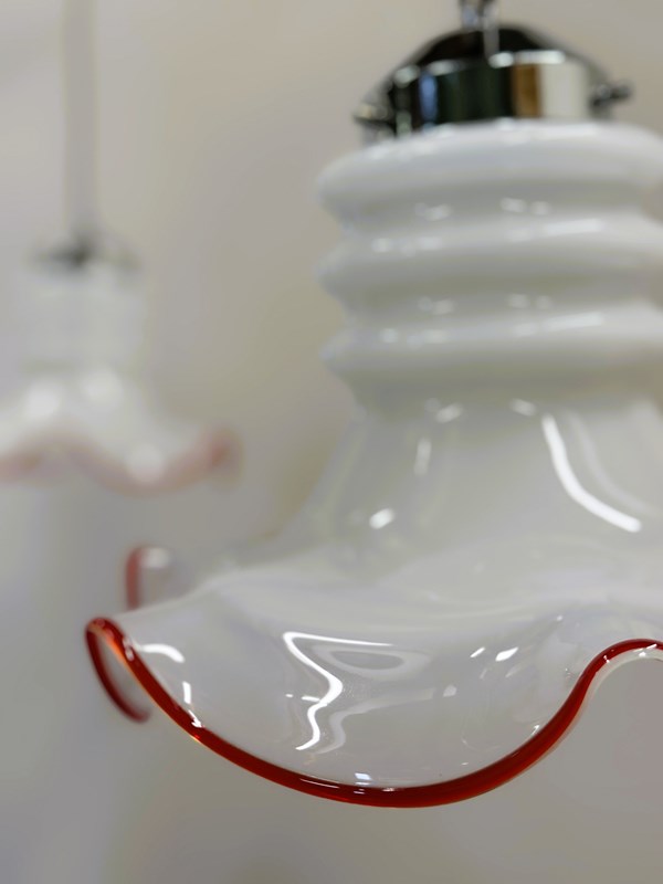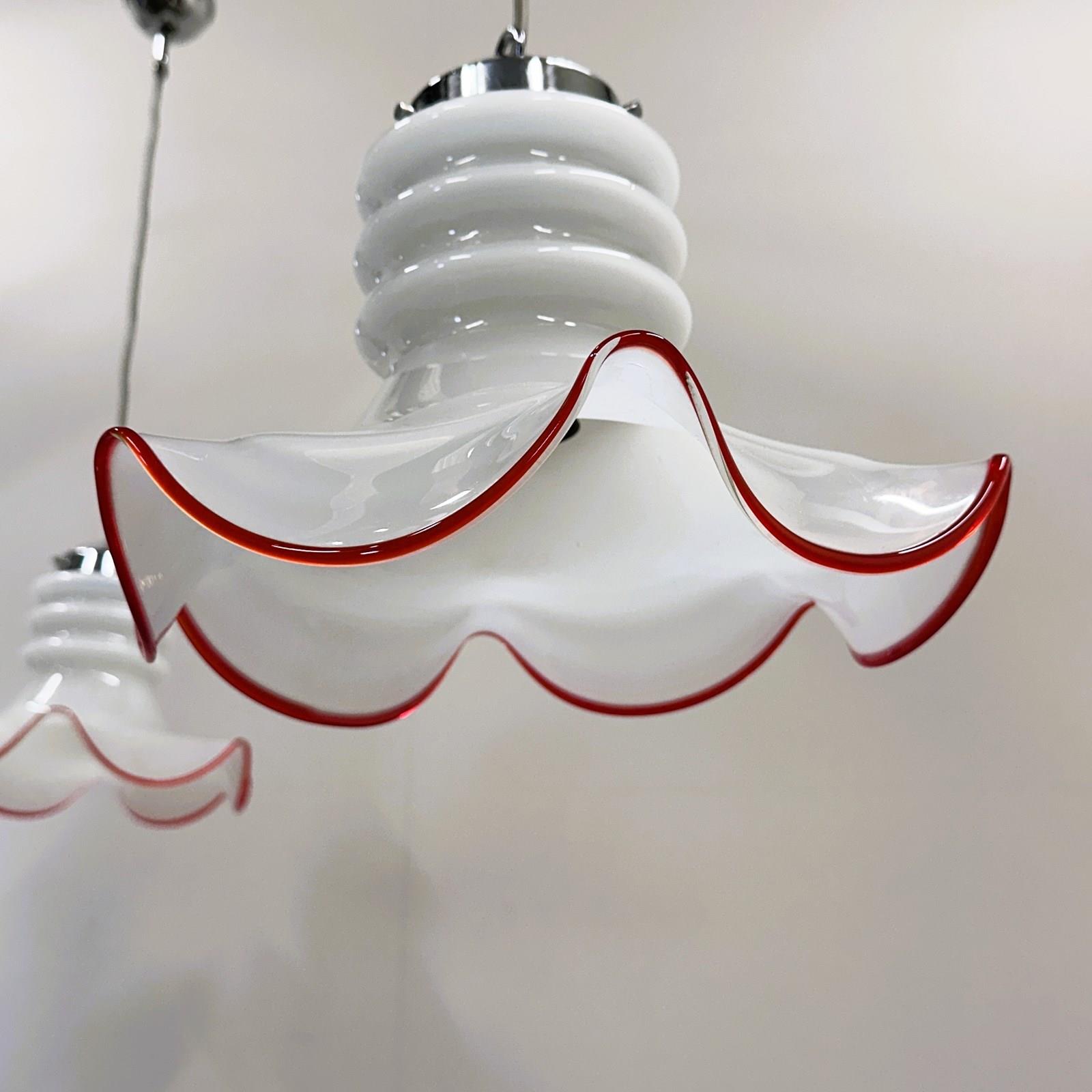 Each light features a delicately hand-blown white opaline glass shade with a playful wavy edge, hand-finished in a vibrant red rim — a signature detail of vintage Venetian craftsmanship. The elegant combination of soft milky glass and chrome fittings creates a refined yet joyful aesthetic, perfect for both contemporary and retro interiors.