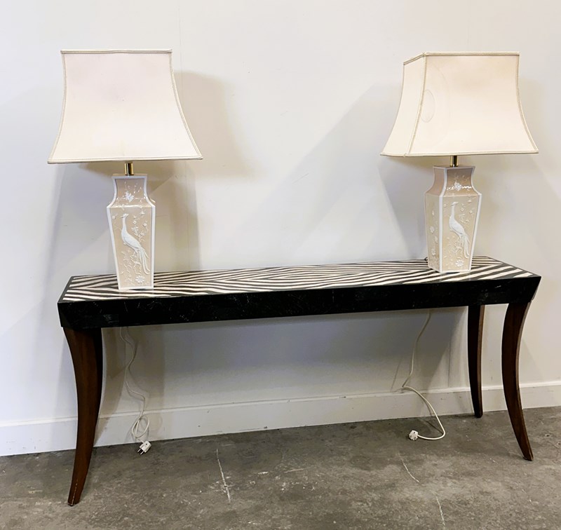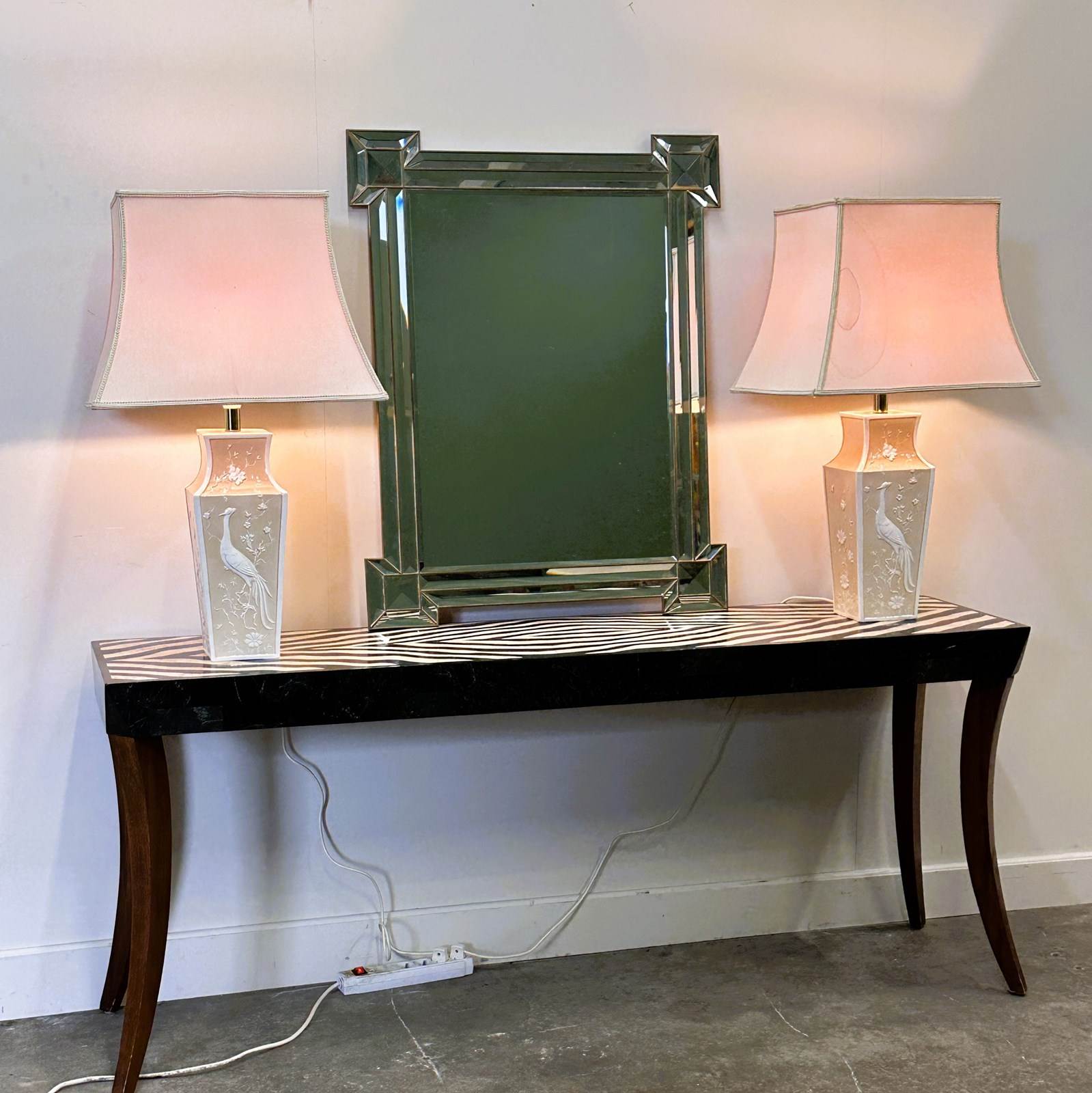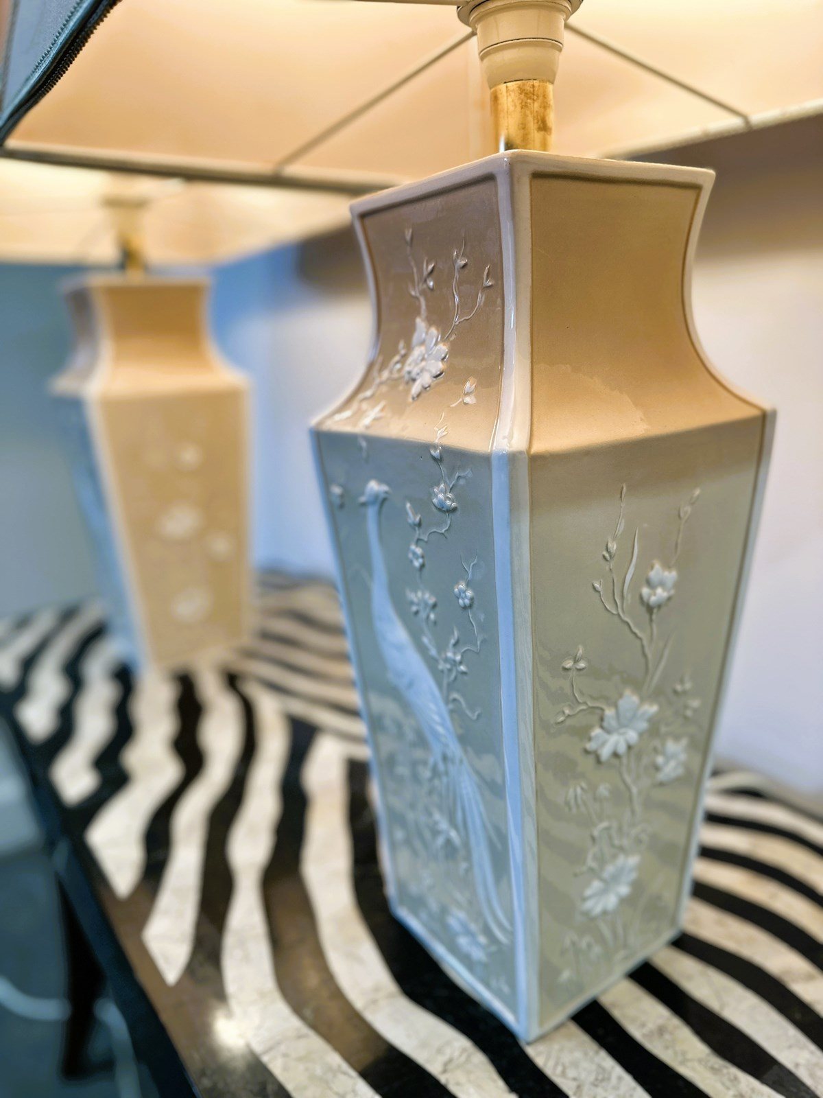 Pair Of Large Cream Ceramic Table Lamps With Relief Peacocks