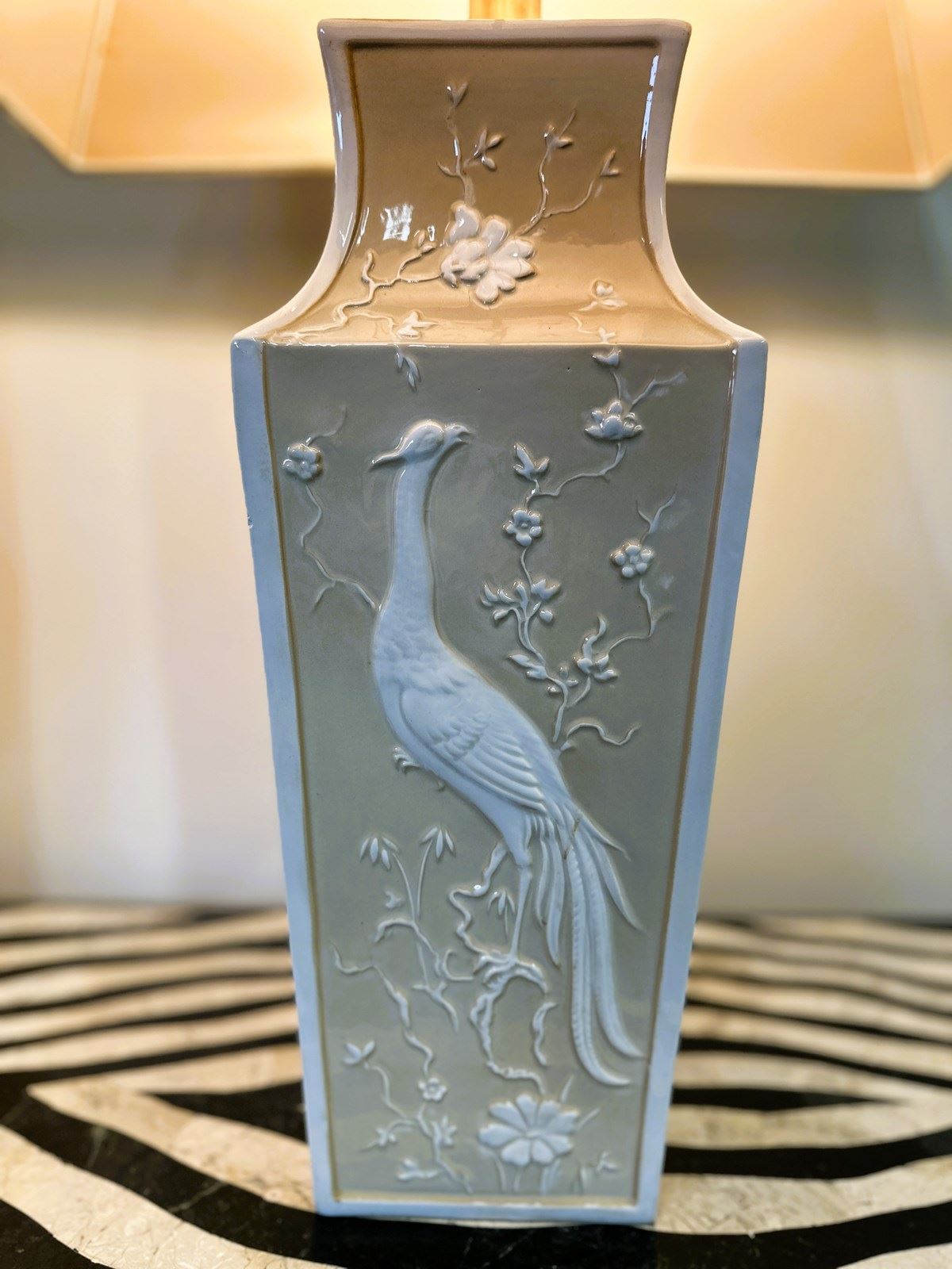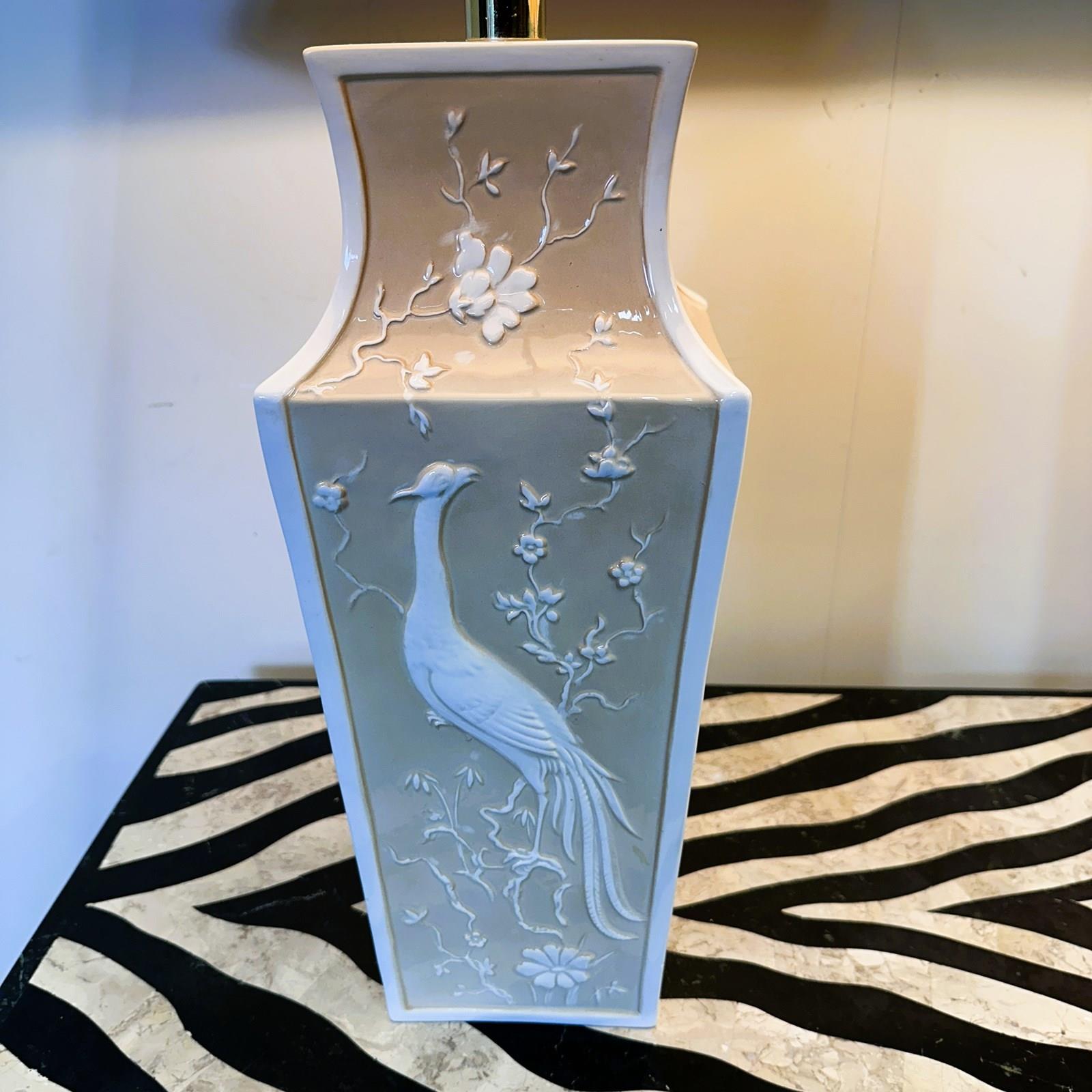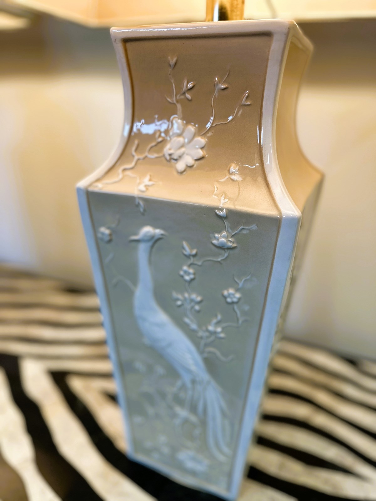Pair Of Large Cream Ceramic Table Lamps With Relief Peacocks