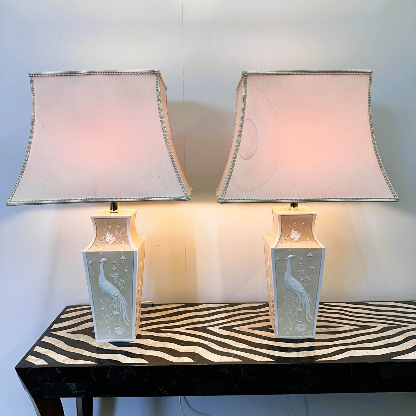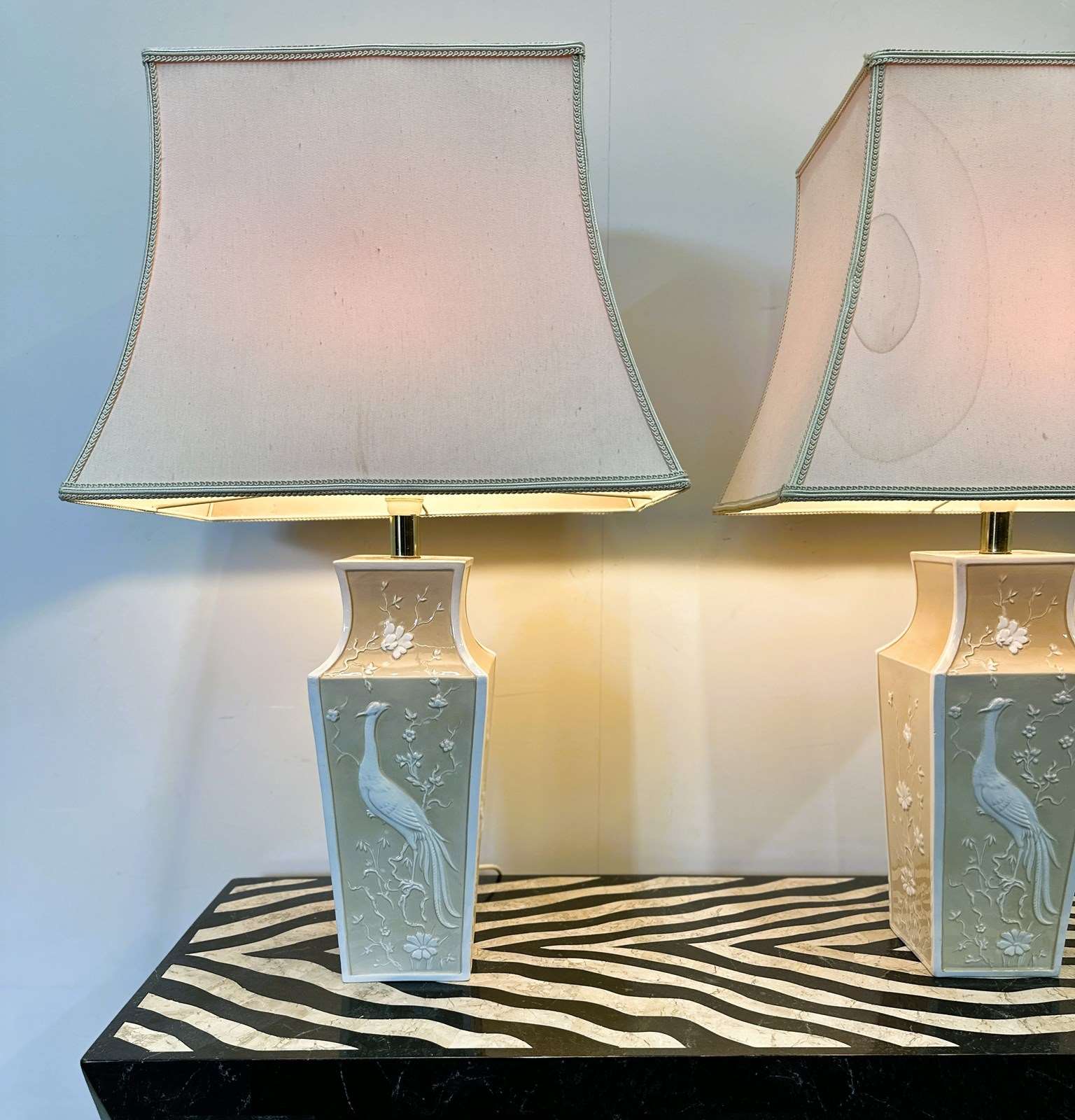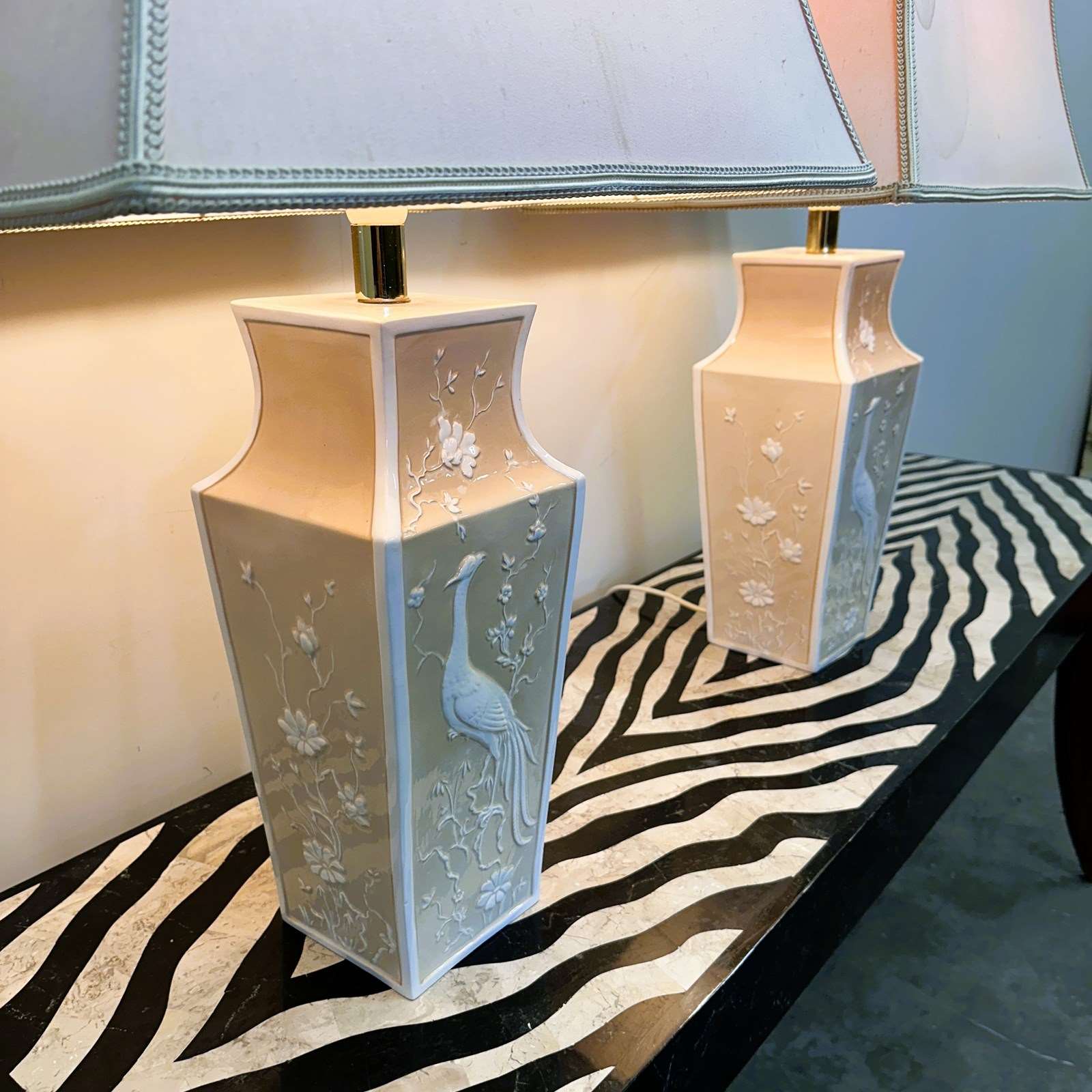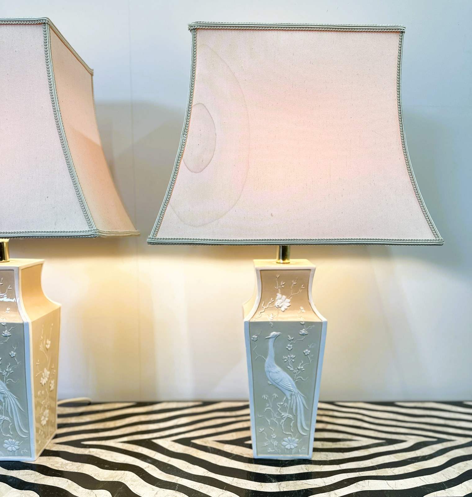 Elegant and refined pair of large ceramic table lamps from the 1980s, each featuring a beautifully modelled relief of peacocks and floral motifs on softly glazed cream ceramic bases.