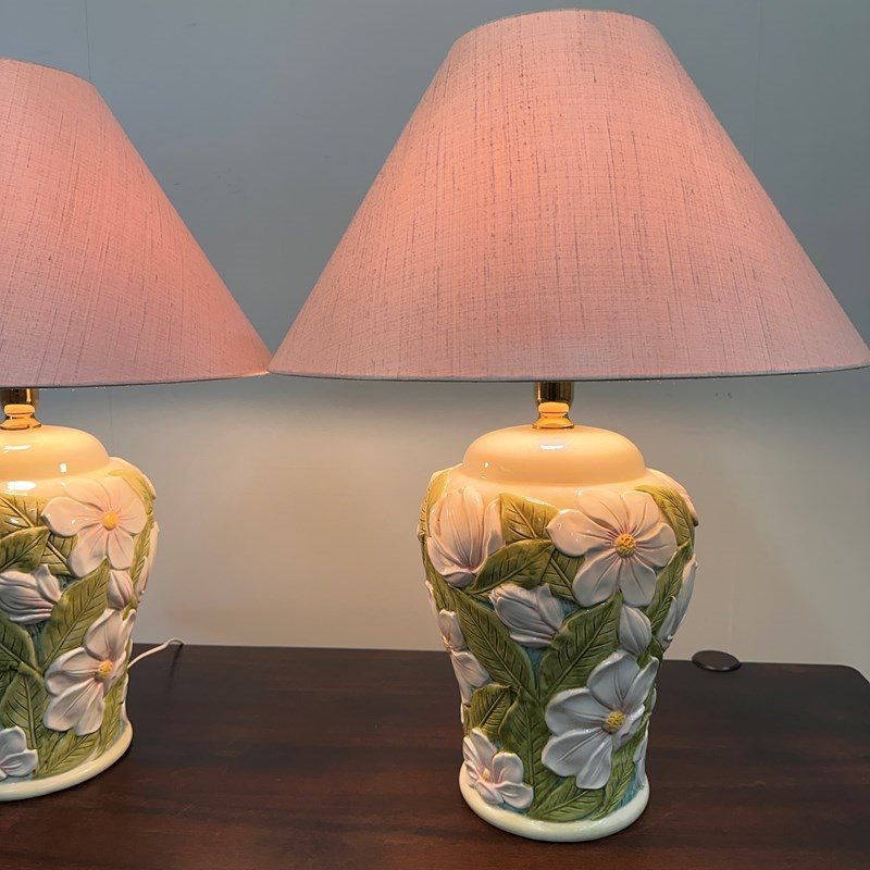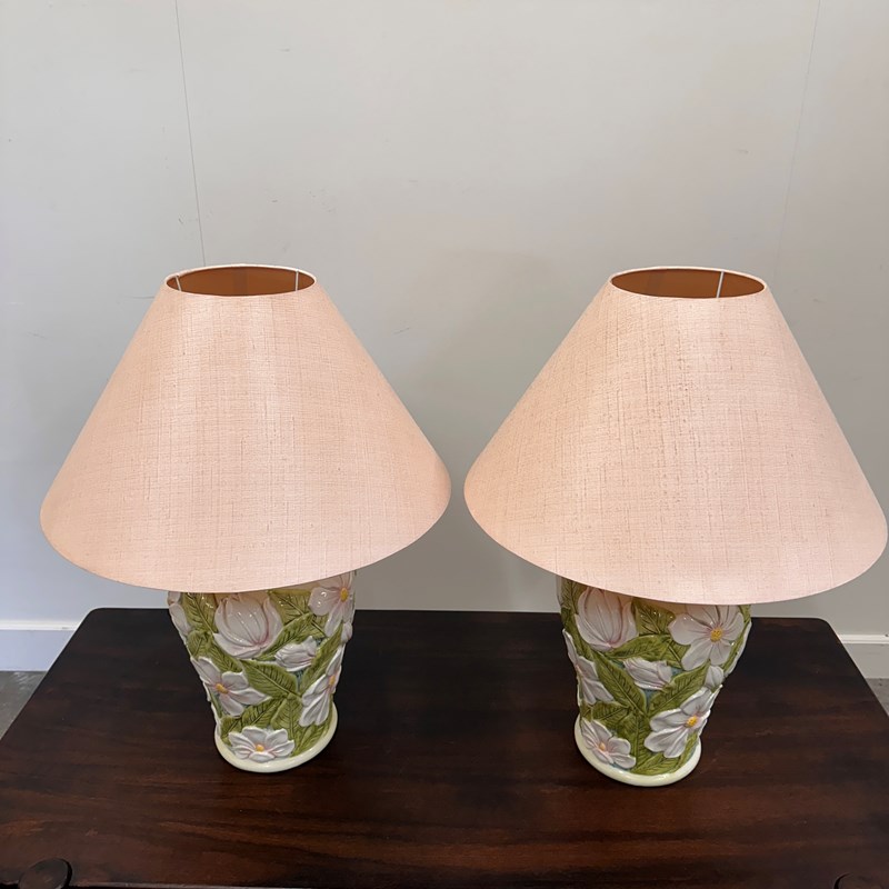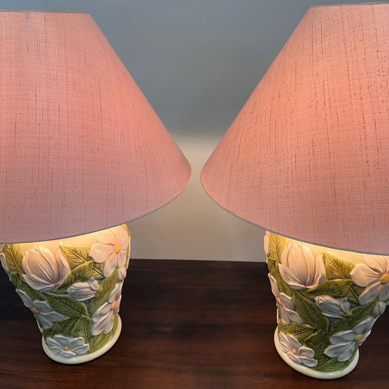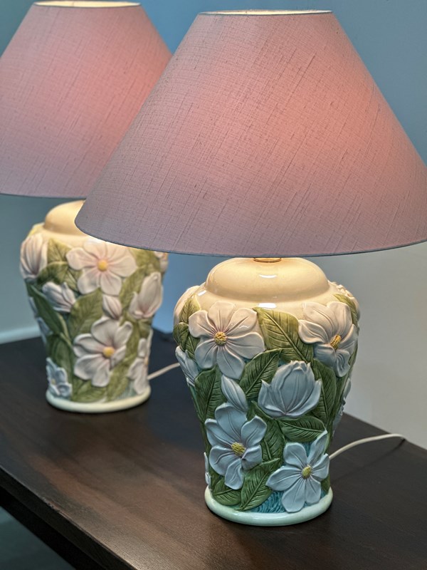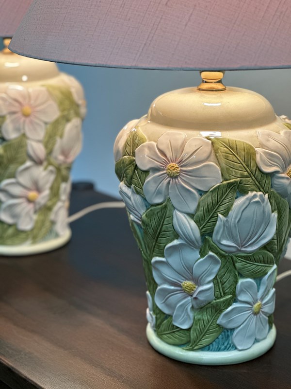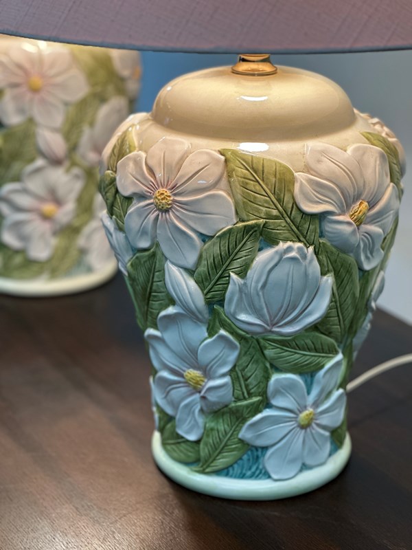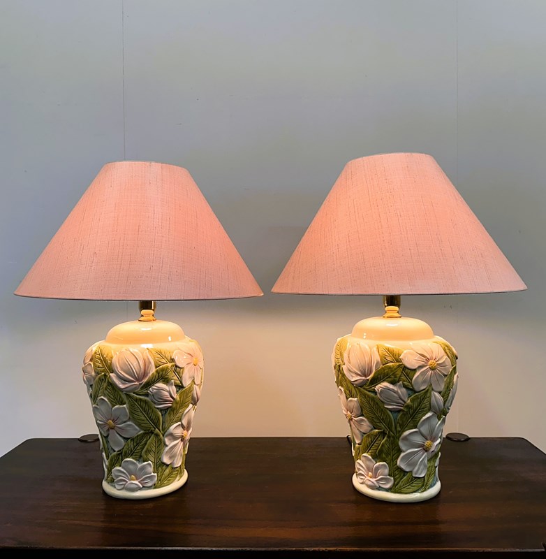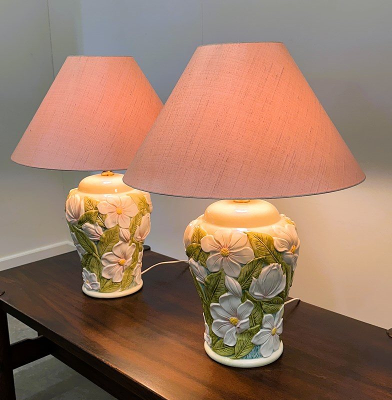 vintage ceramic lamps, floral table lamps, 3D flower lamp, Italian style lighting, Capodimonte style, retro bedside lamps, botanical decor, 1970s lighting, vintage home accents, sculptural lamps, pair of lamps, textured ceramic, vintage lighting pair, handmade
